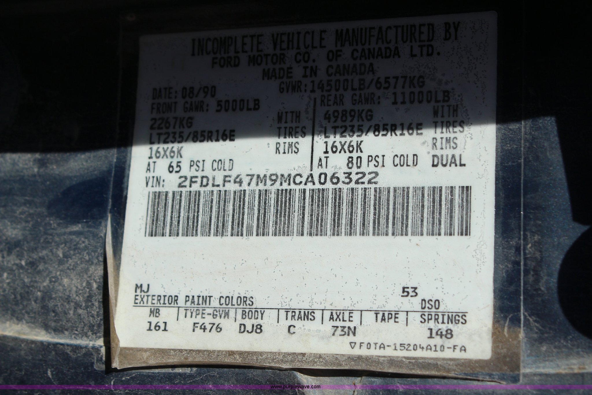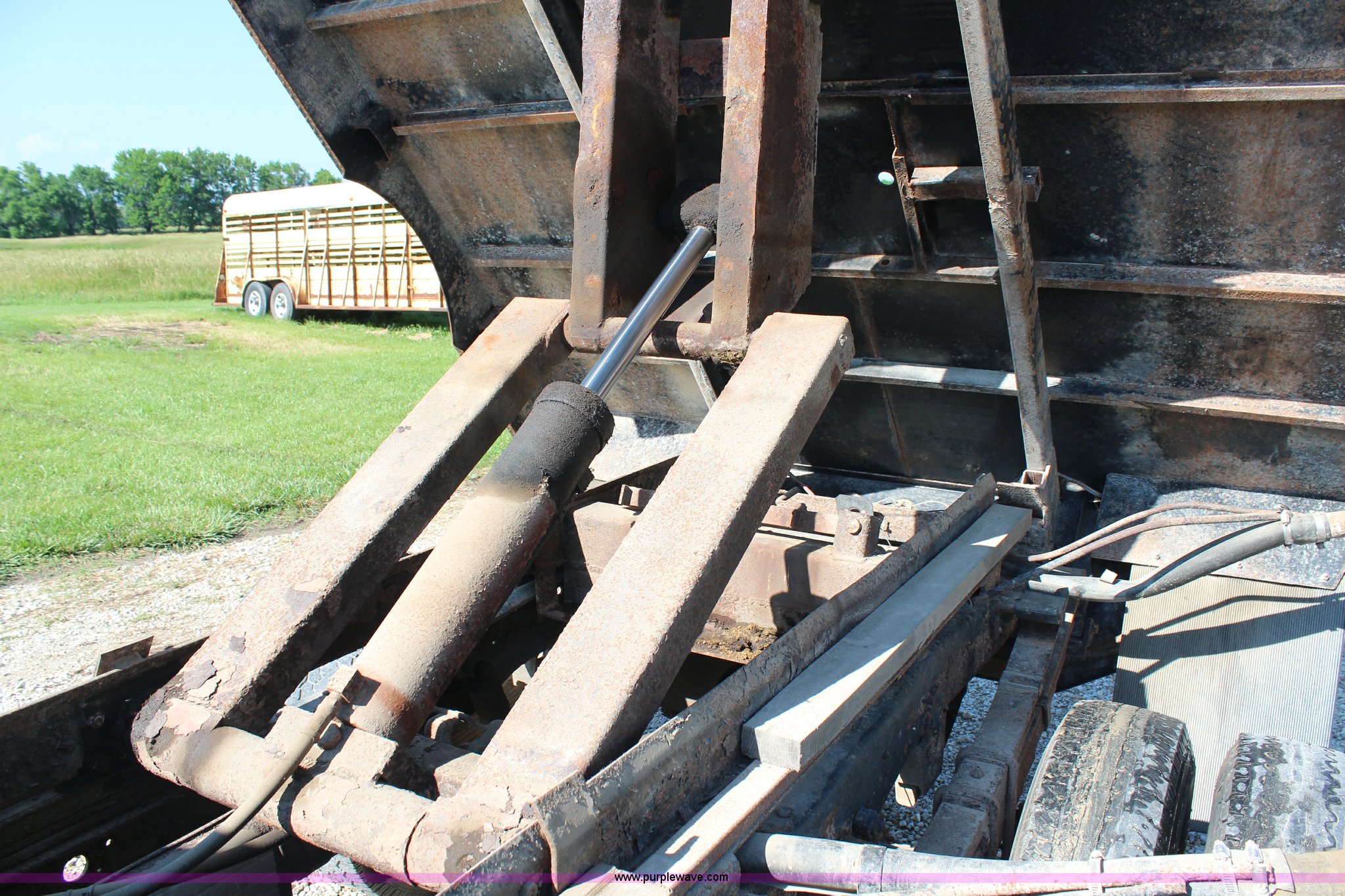 Purple Wave is selling a used Flat Bed Truck in Kansas. This item is a 1991 Ford F350 Super Duty dump bed pickup truck with the following: 185 miles on odometer, Not Actual Mileage, 7.3L V8 diesel engine, Five speed manual transmission, AC and heat, AC inoperable, Tilt, Cruise, AM/FM, Power windows and locks, Cloth interior, Bradford dump bed, 10'L x 90.5"W, PTO, Toolbox, Receiver hitch, 235/85R16 tires, Drivers window inoperable, Rust