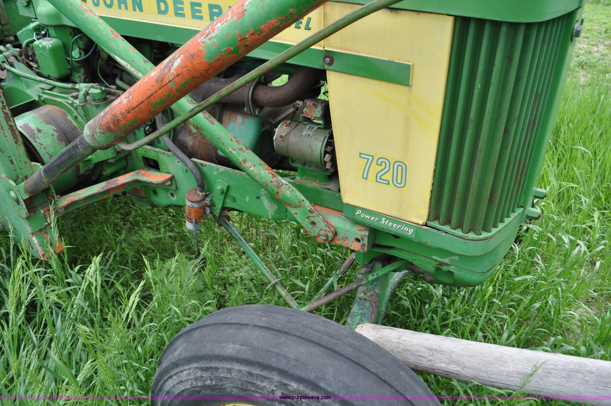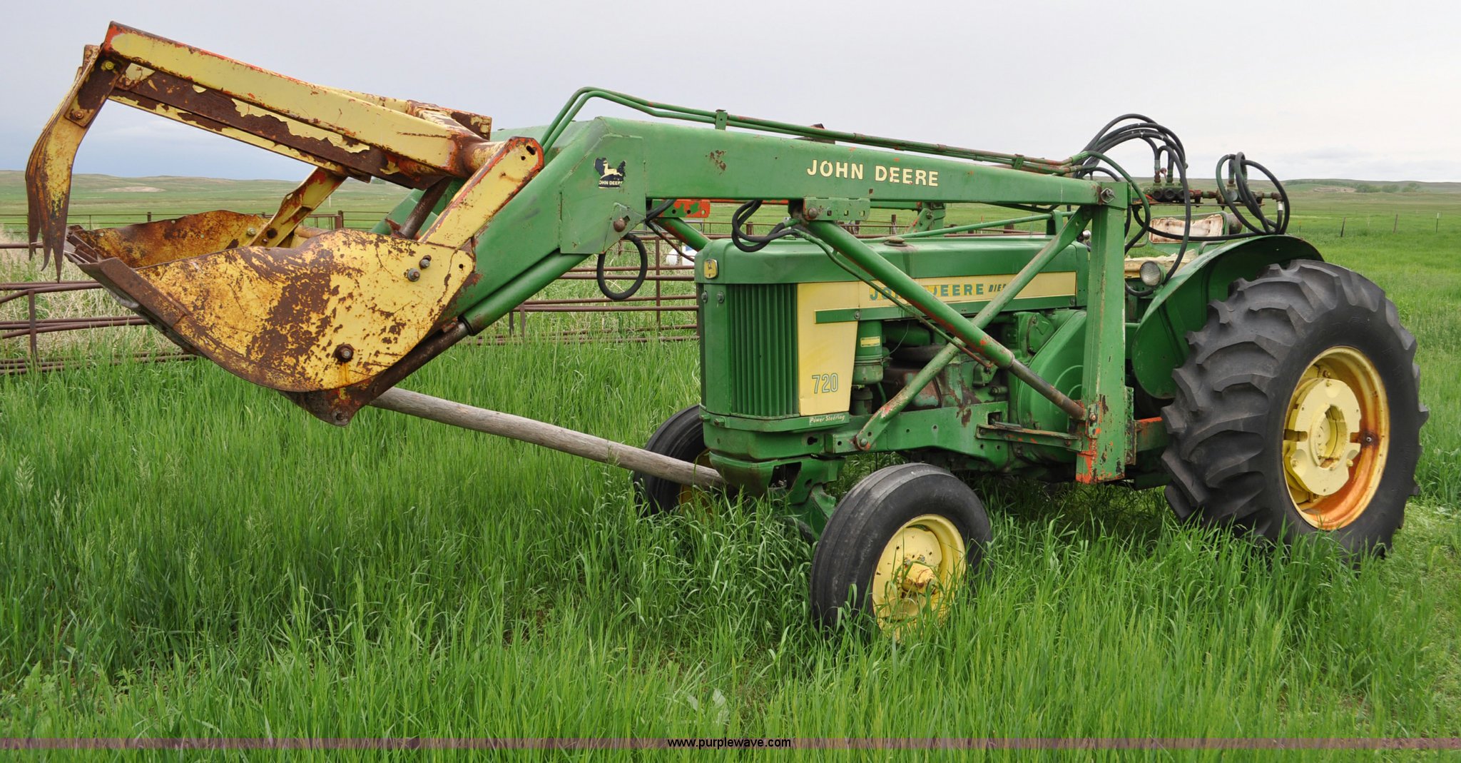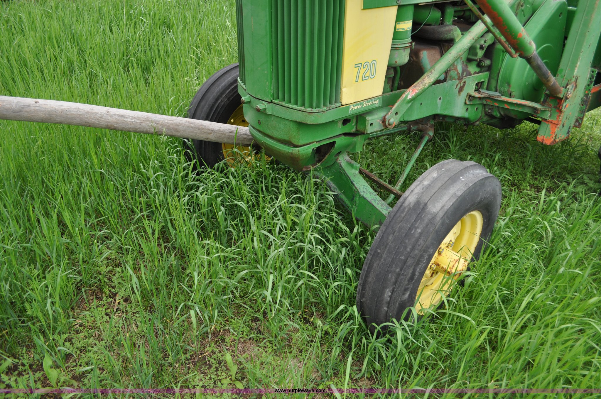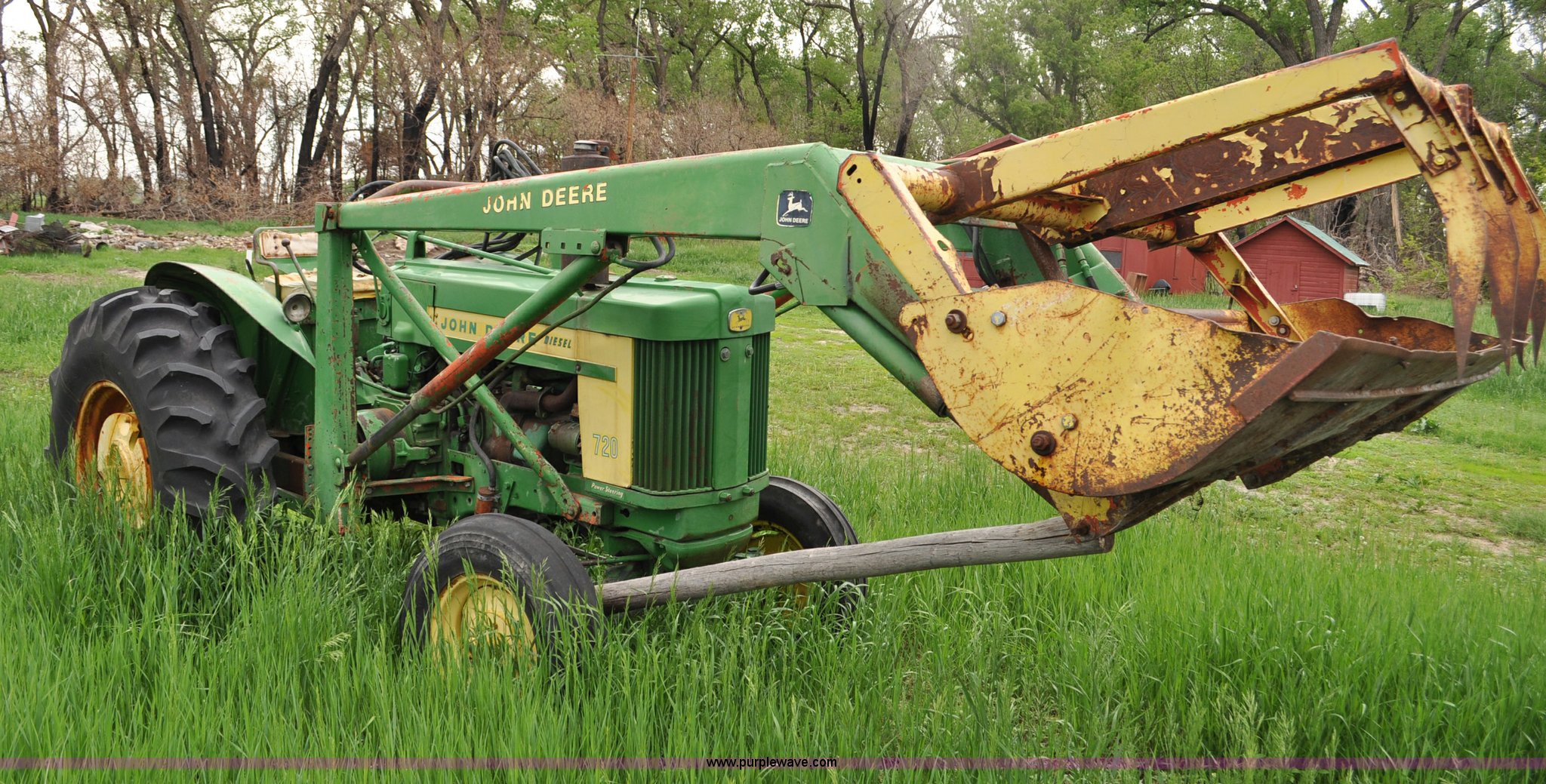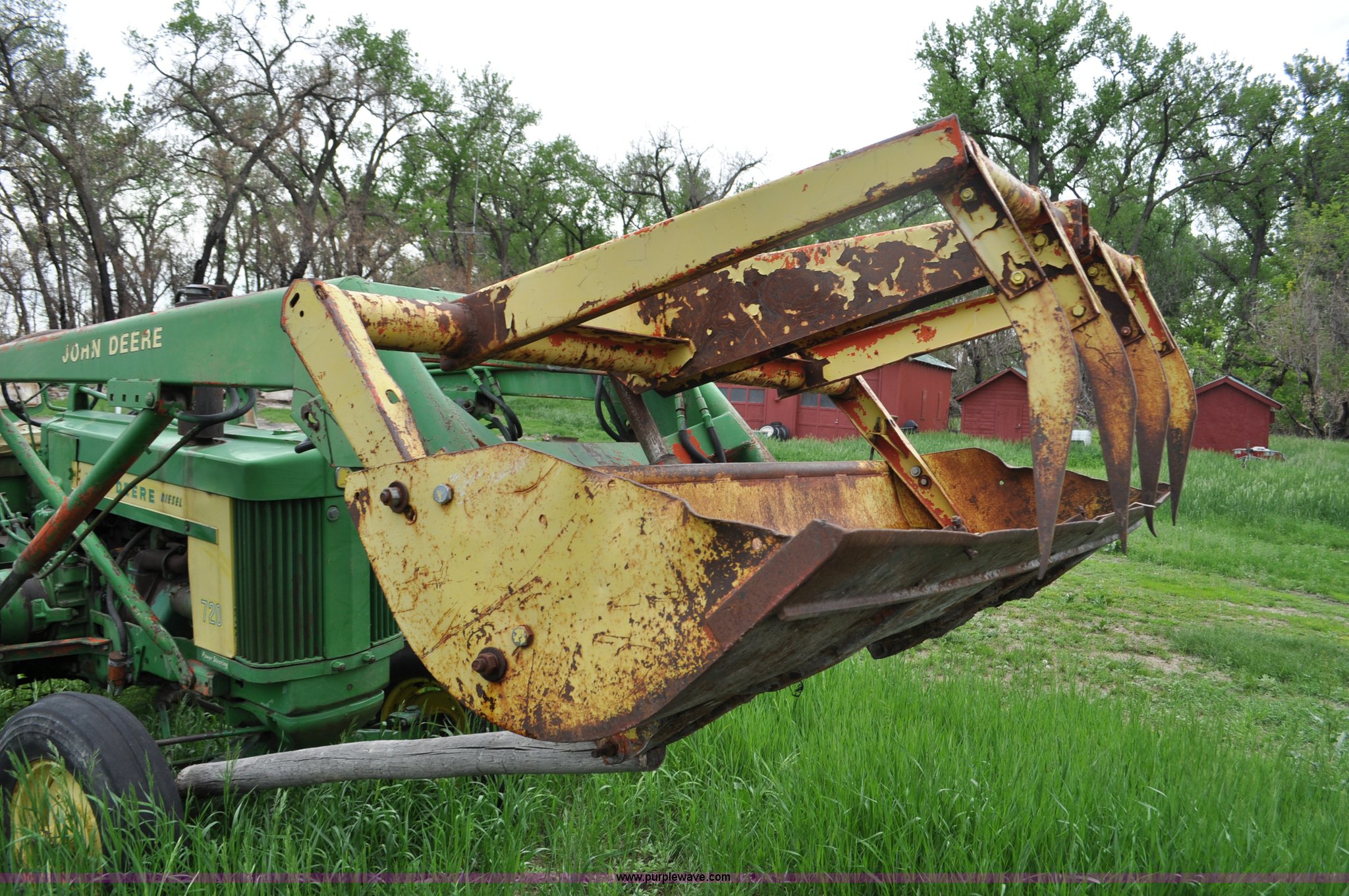 Purple Wave is selling a used Tractor in Nebraska. This item is a 1957 John Deere 720 tractor with the following: 561 hours on meter, John Deere two cylinder diesel engine, Pony motor start, Manual transmission, 6F-1R gears, John Deere loader, Grapple forks, Two lever control, Power steering, 540 PTO, (2) rear hydraulic remotes, Wheel weights, 7.50-18 front tires, 18.4-30 rear tires, Needs battery, Unknown operating condition, Engine turns freely, Serial 7209769
