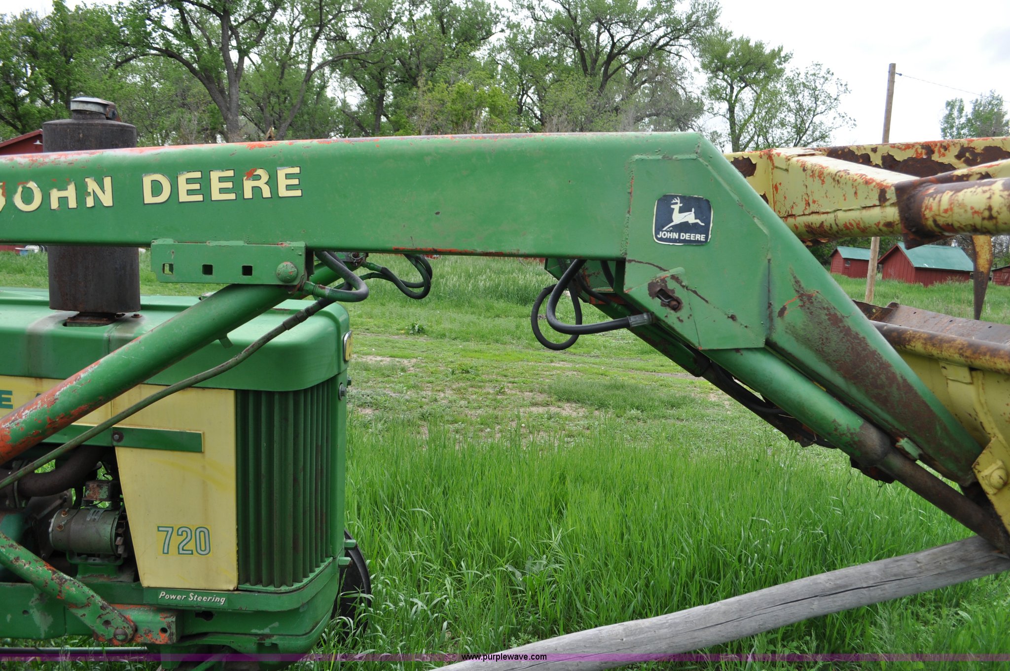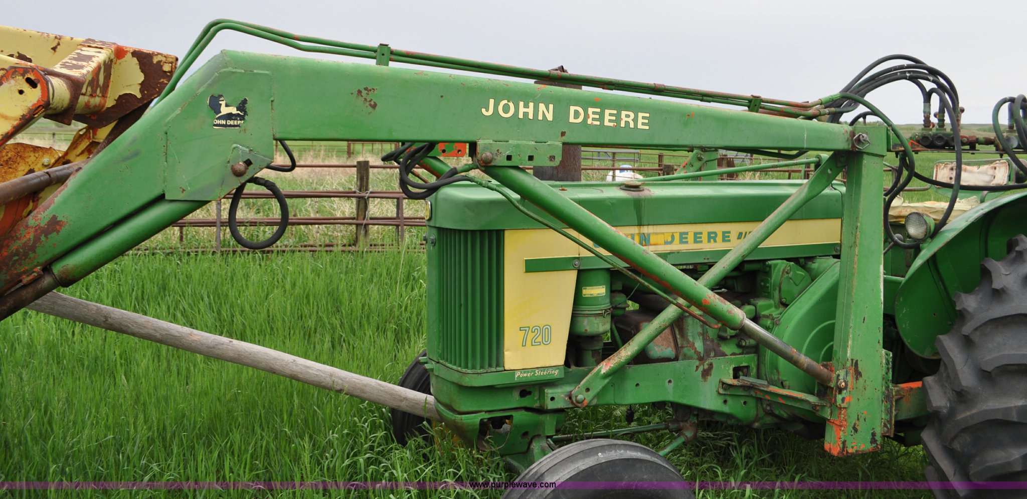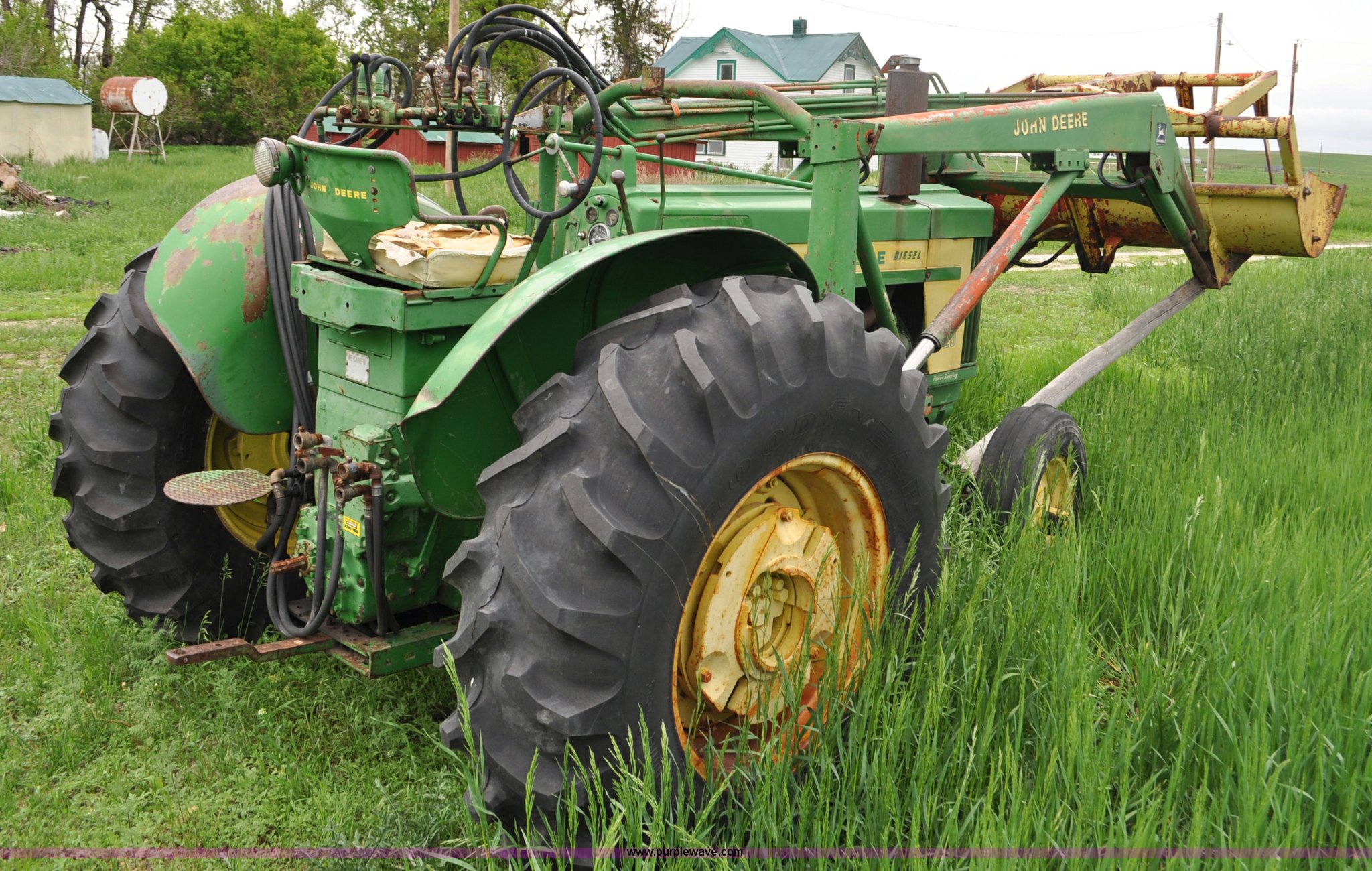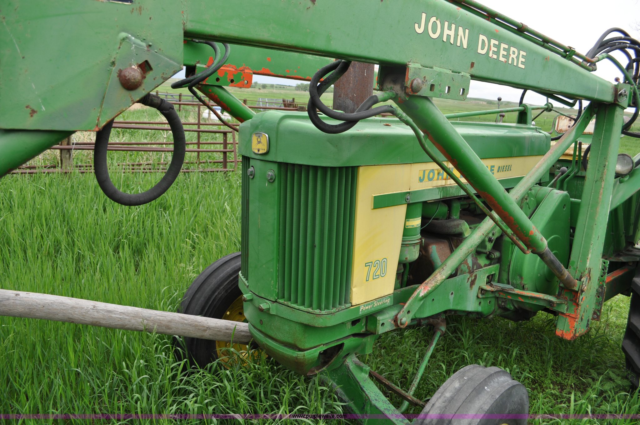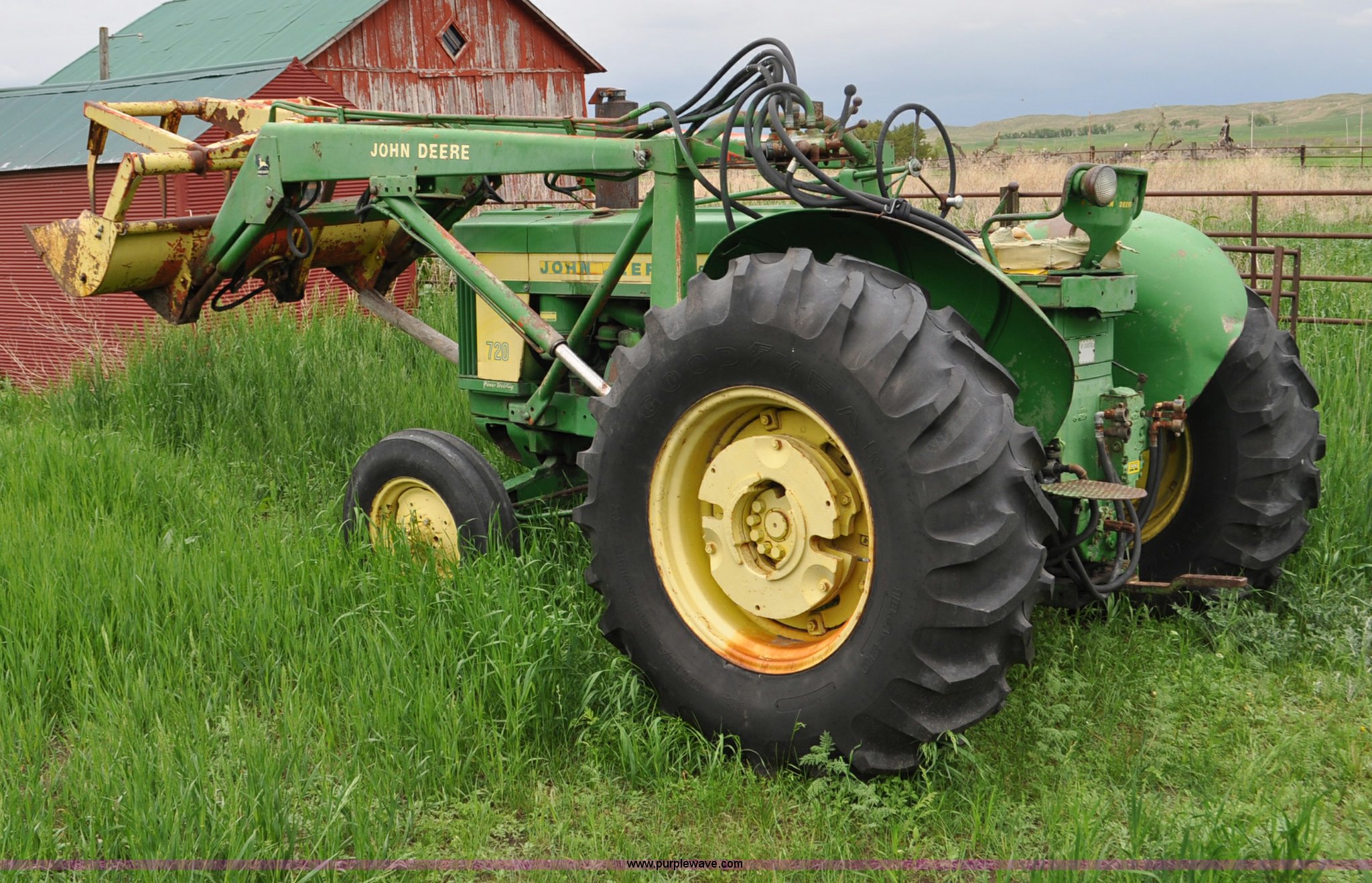 Purple Wave is selling a used Tractor in Nebraska. This item is a 1957 John Deere 720 tractor with the following: 561 hours on meter, John Deere two cylinder diesel engine, Pony motor start, Manual transmission, 6F-1R gears, John Deere loader, Grapple forks, Two lever control, Power steering, 540 PTO, (2) rear hydraulic remotes, Wheel weights, 7.50-18 front tires, 18.4-30 rear tires, Needs battery, Unknown operating condition, Engine turns freely, Serial 7209769
