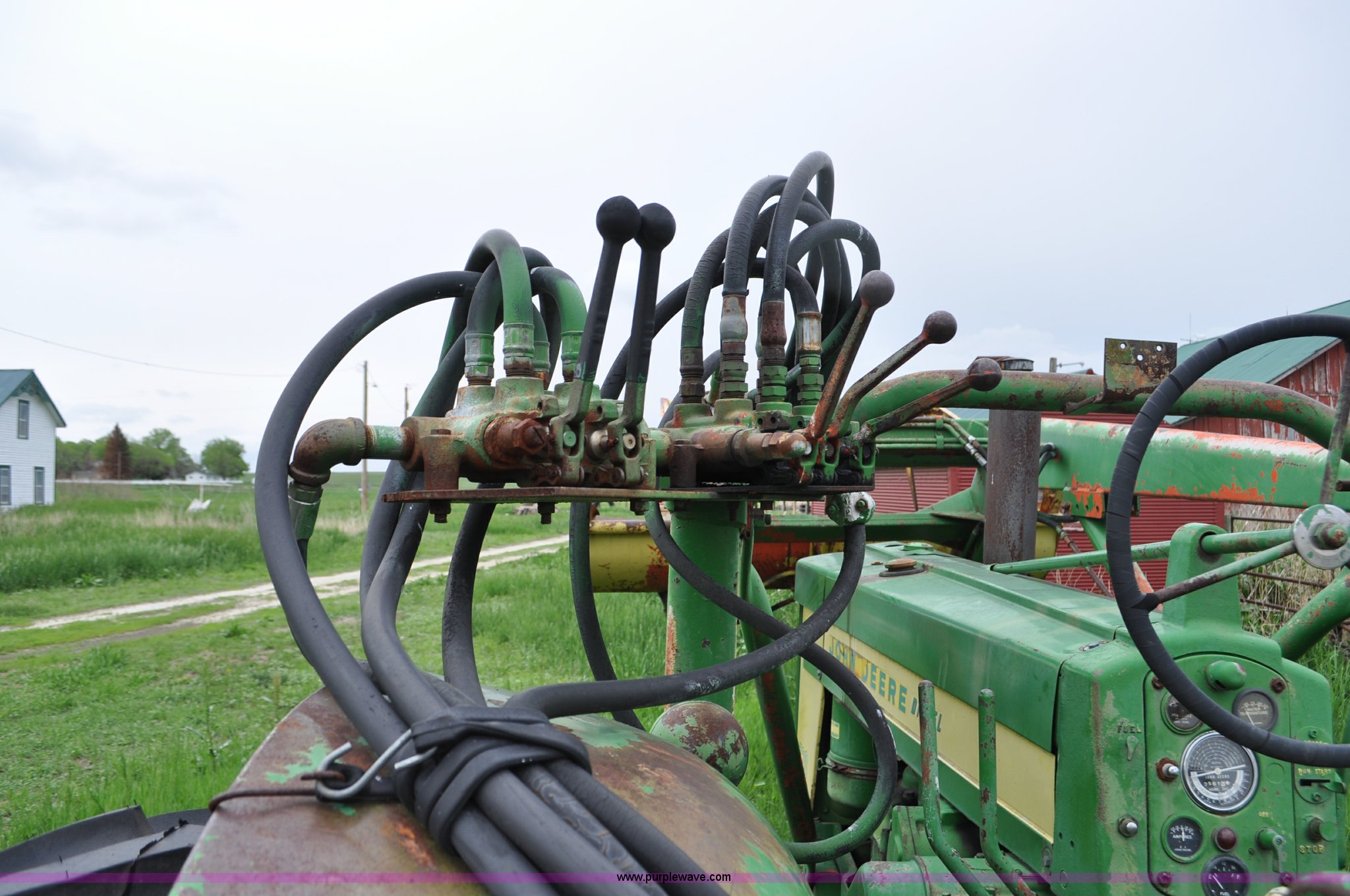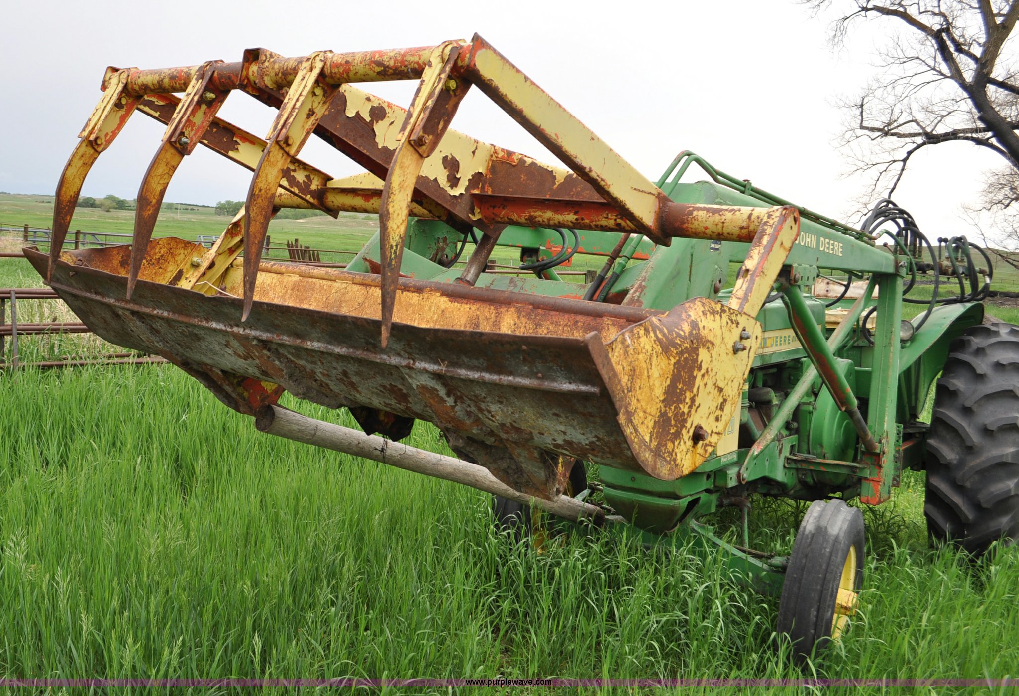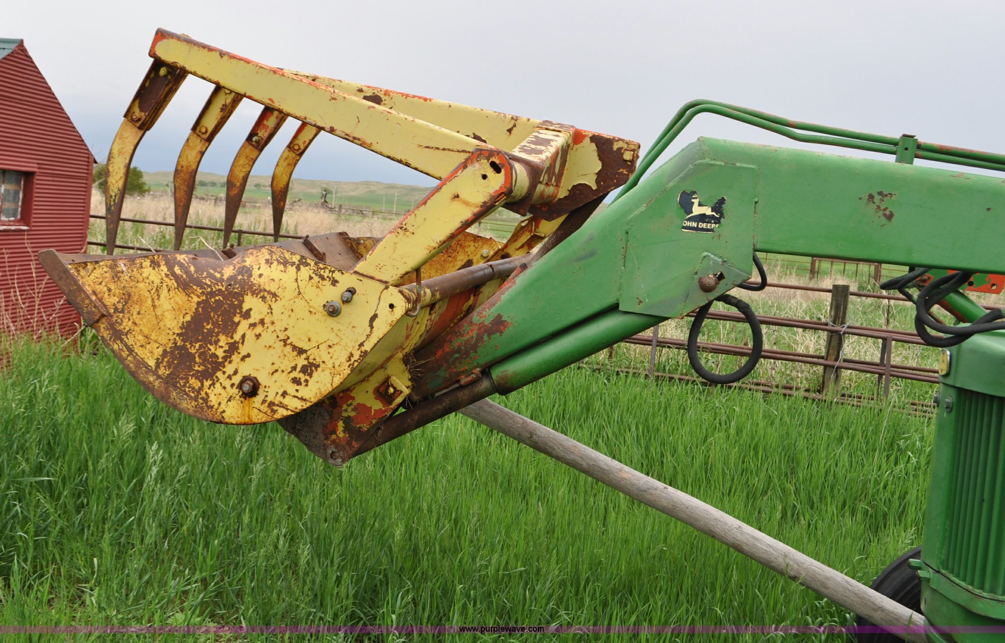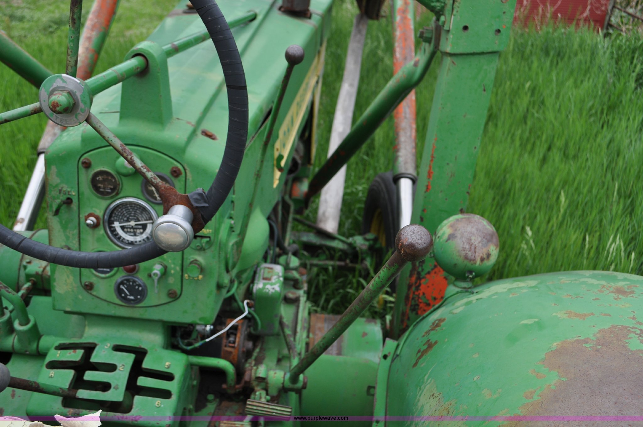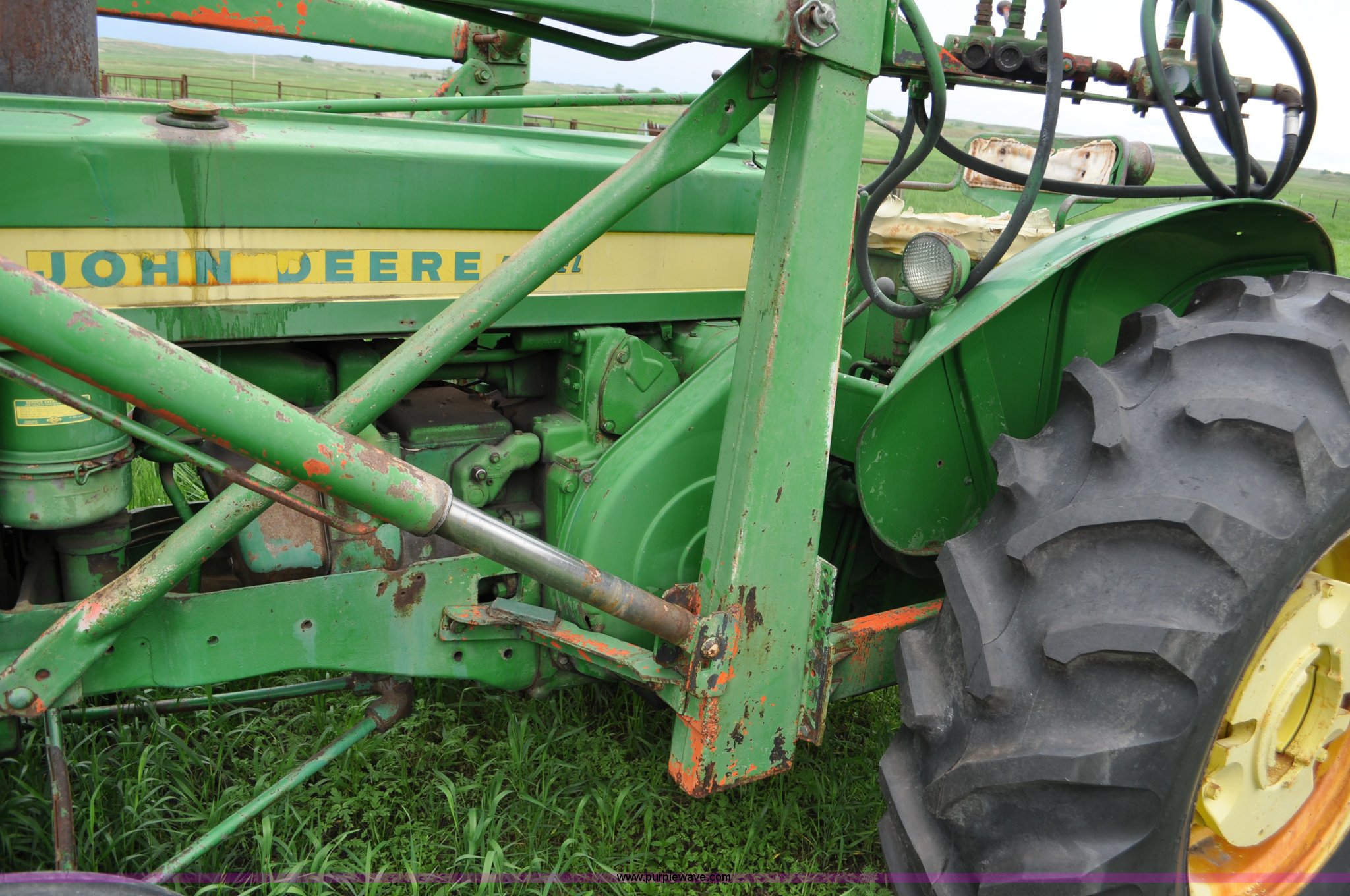 Purple Wave is selling a used Tractor in Nebraska. This item is a 1957 John Deere 720 tractor with the following: 561 hours on meter, John Deere two cylinder diesel engine, Pony motor start, Manual transmission, 6F-1R gears, John Deere loader, Grapple forks, Two lever control, Power steering, 540 PTO, (2) rear hydraulic remotes, Wheel weights, 7.50-18 front tires, 18.4-30 rear tires, Needs battery, Unknown operating condition, Engine turns freely, Serial 7209769