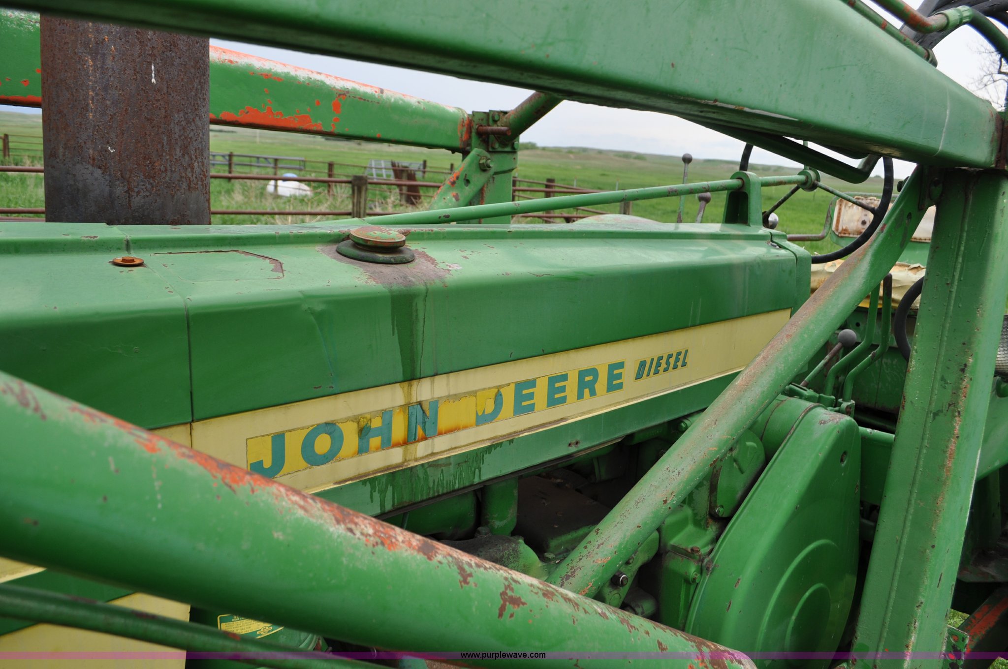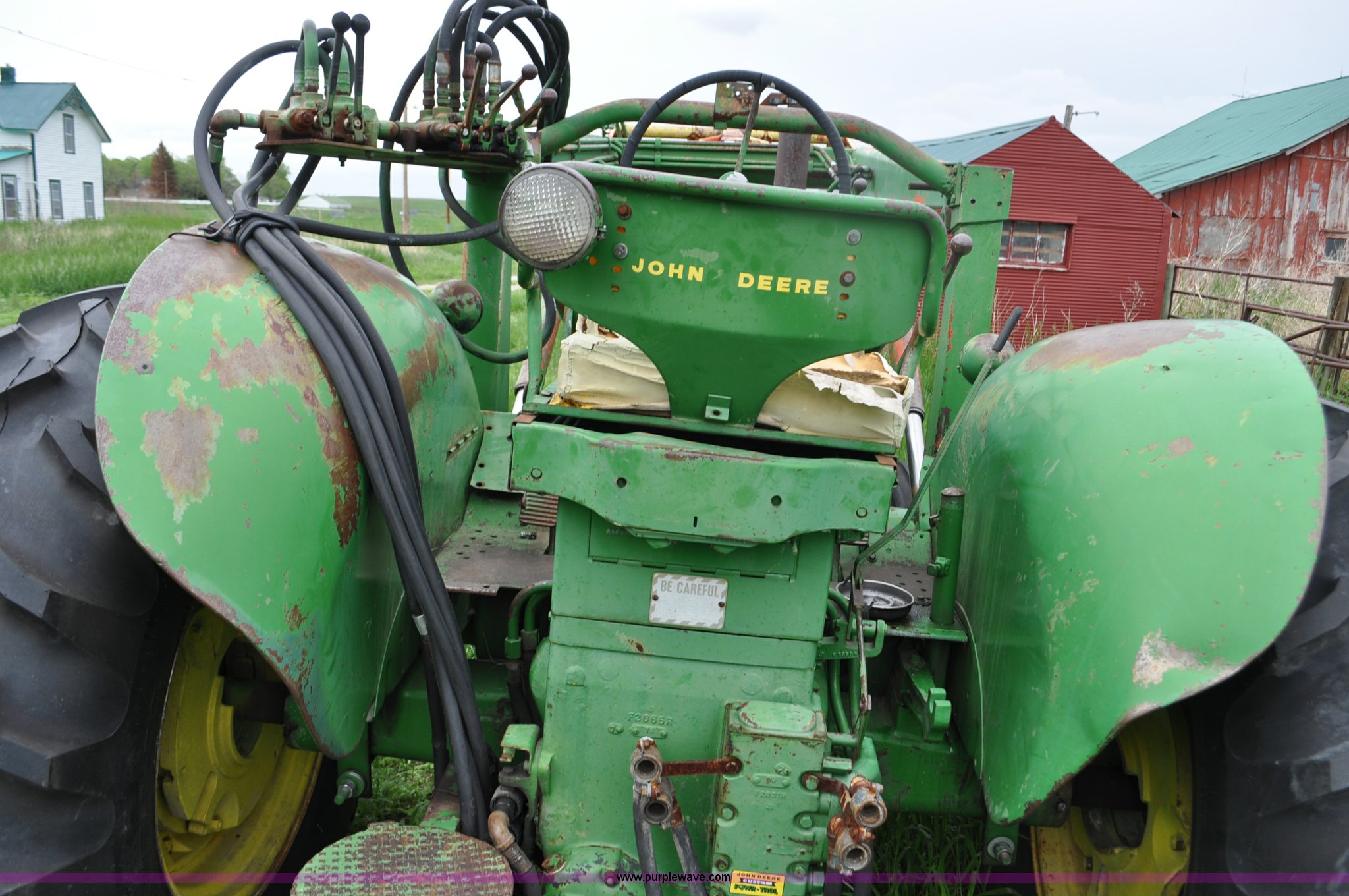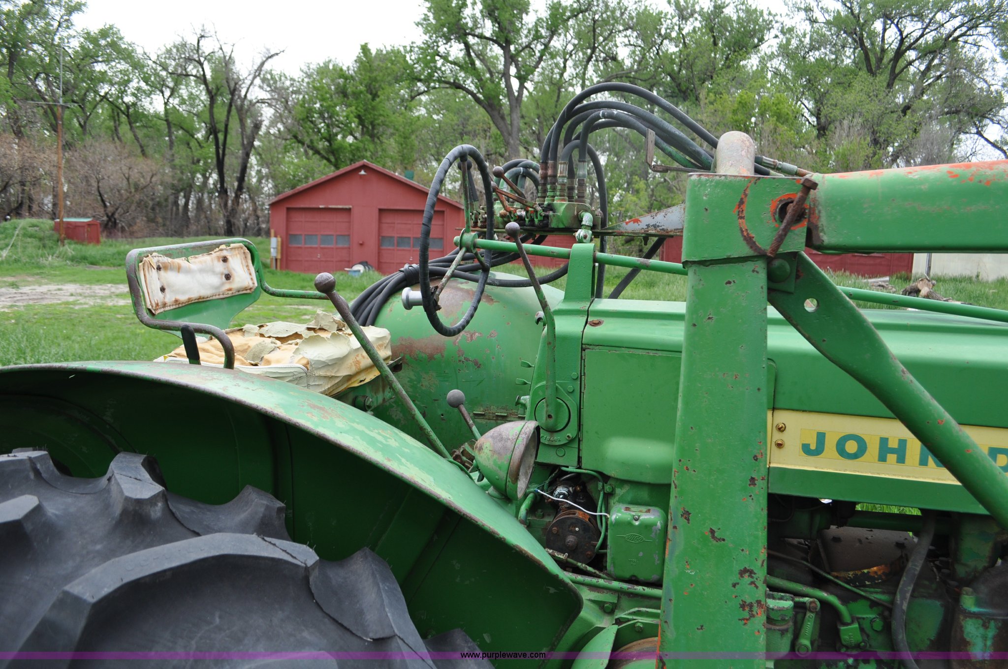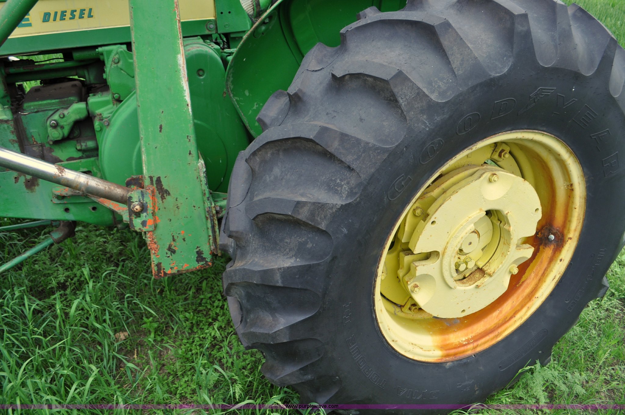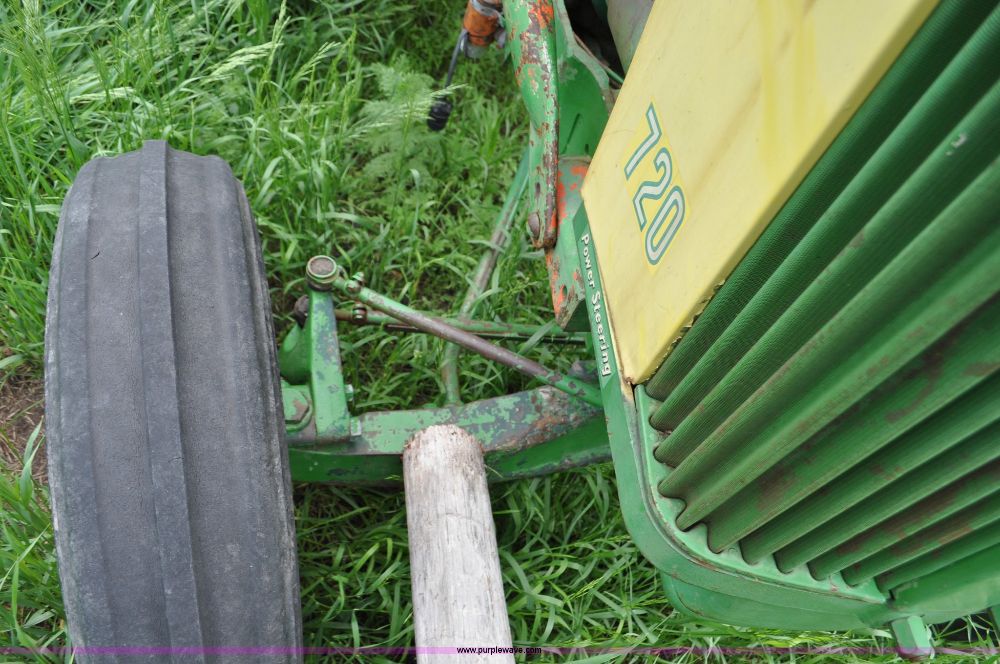 Purple Wave is selling a used Tractor in Nebraska. This item is a 1957 John Deere 720 tractor with the following: 561 hours on meter, John Deere two cylinder diesel engine, Pony motor start, Manual transmission, 6F-1R gears, John Deere loader, Grapple forks, Two lever control, Power steering, 540 PTO, (2) rear hydraulic remotes, Wheel weights, 7.50-18 front tires, 18.4-30 rear tires, Needs battery, Unknown operating condition, Engine turns freely, Serial 7209769