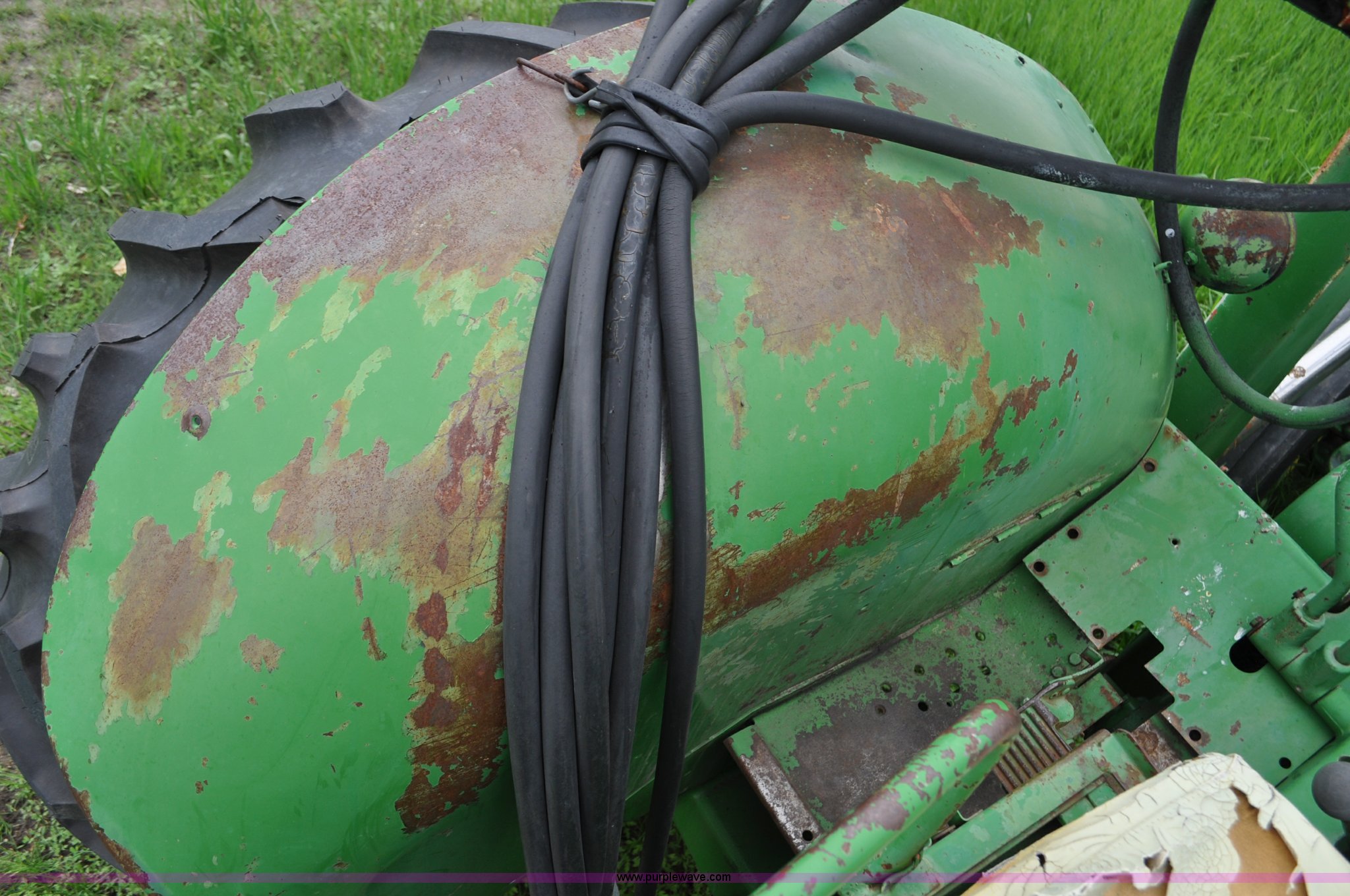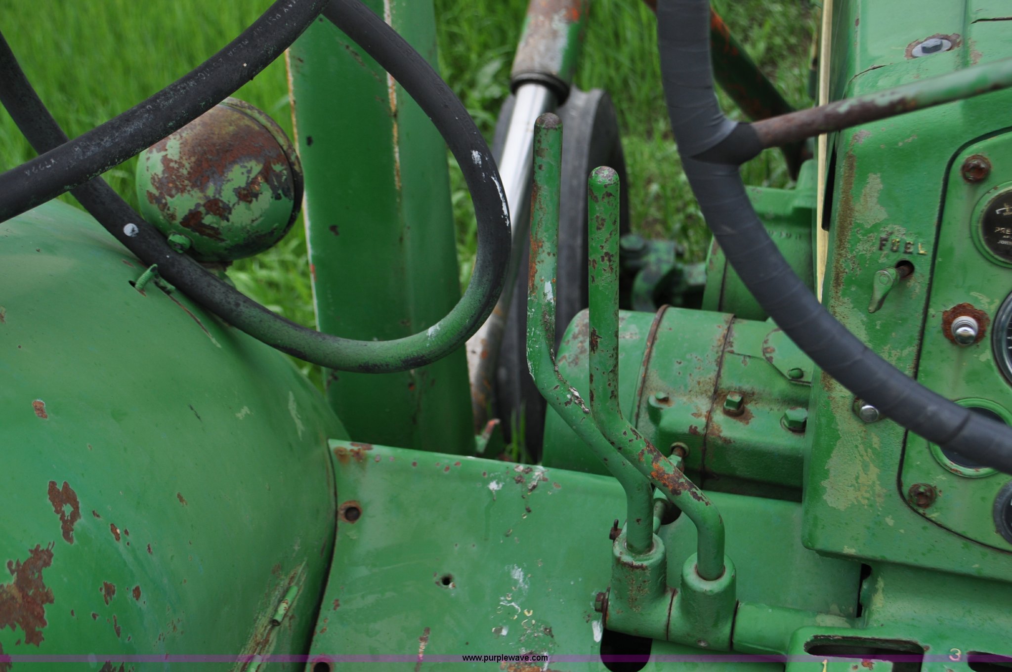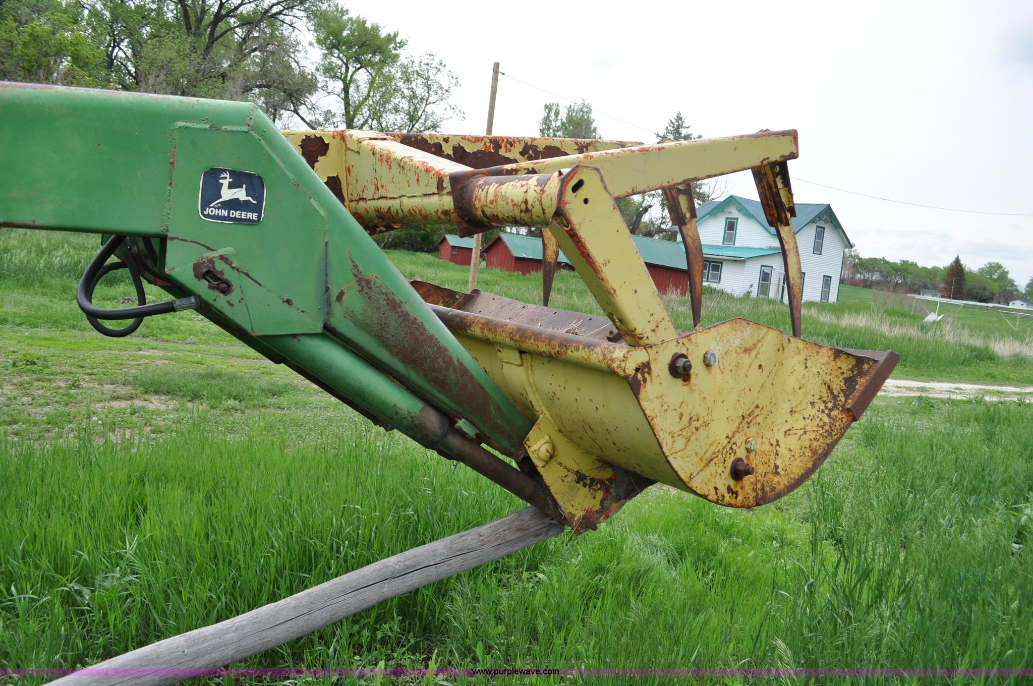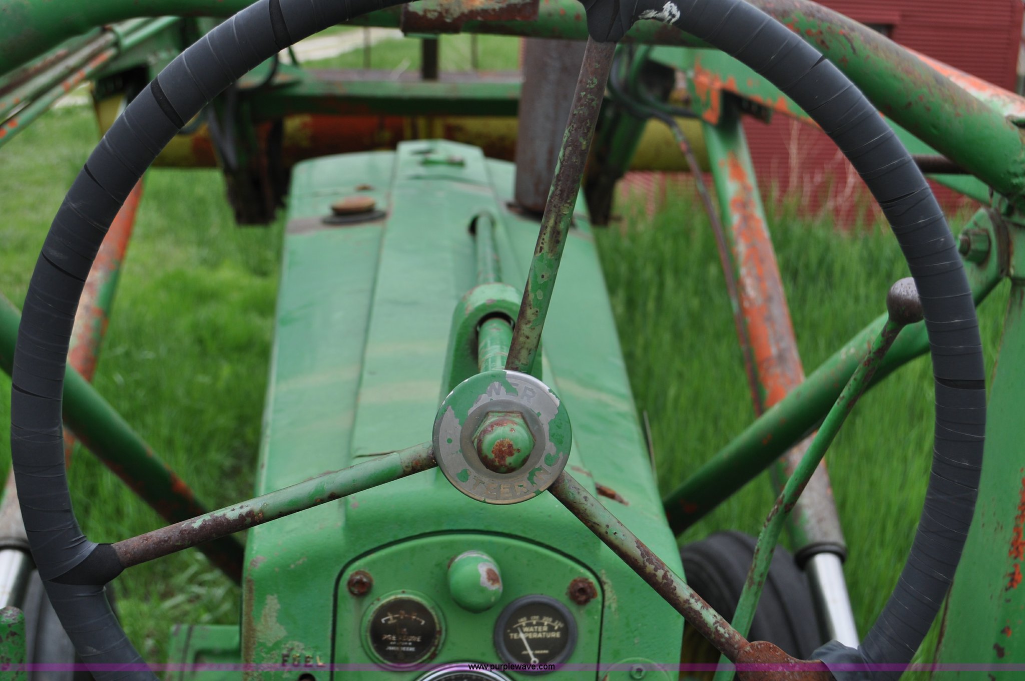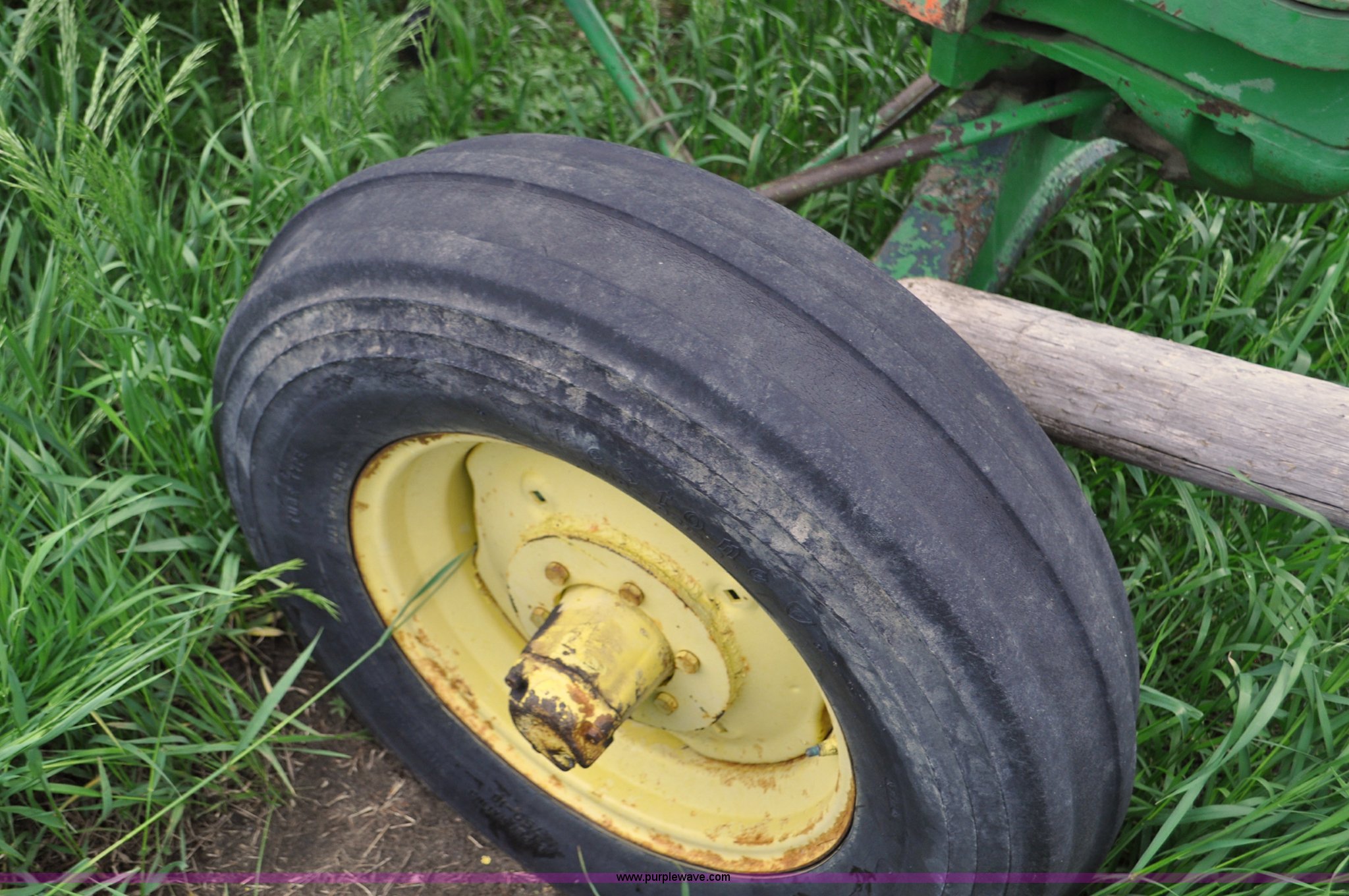 Purple Wave is selling a used Tractor in Nebraska. This item is a 1957 John Deere 720 tractor with the following: 561 hours on meter, John Deere two cylinder diesel engine, Pony motor start, Manual transmission, 6F-1R gears, John Deere loader, Grapple forks, Two lever control, Power steering, 540 PTO, (2) rear hydraulic remotes, Wheel weights, 7.50-18 front tires, 18.4-30 rear tires, Needs battery, Unknown operating condition, Engine turns freely, Serial 7209769