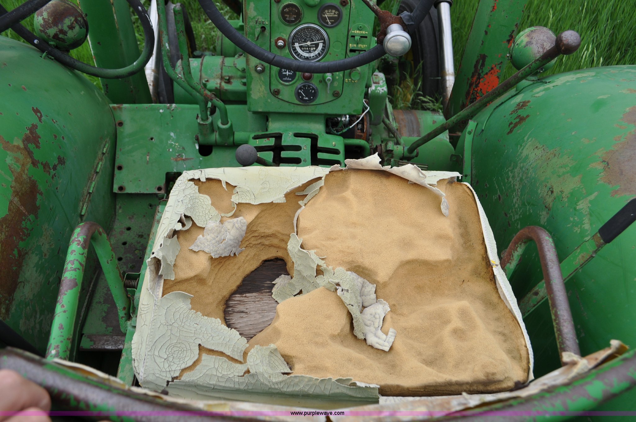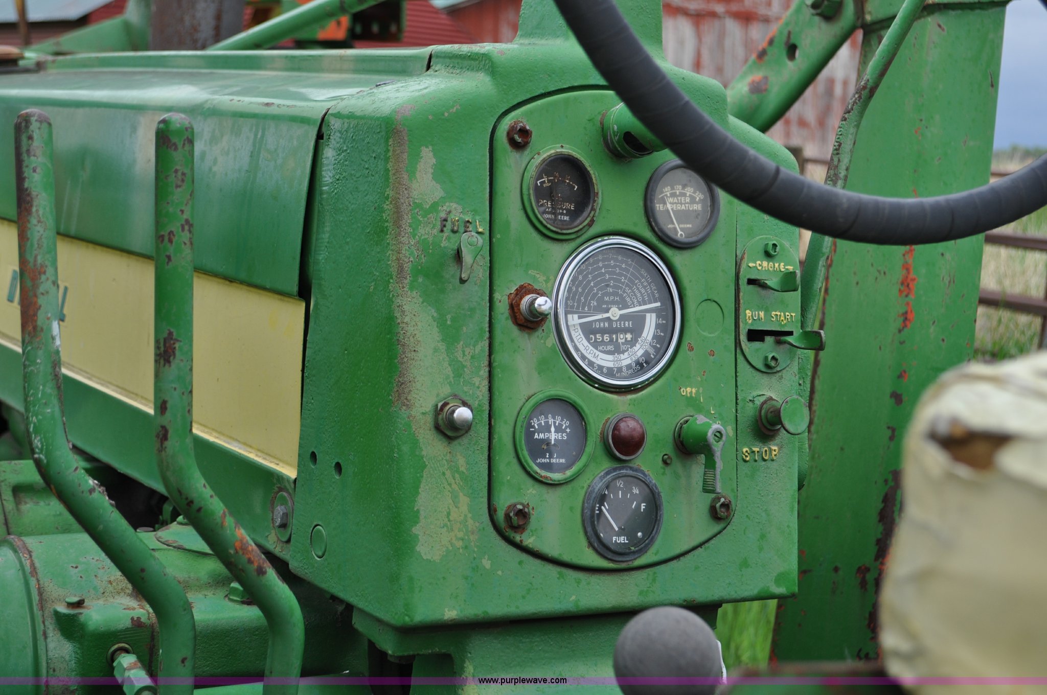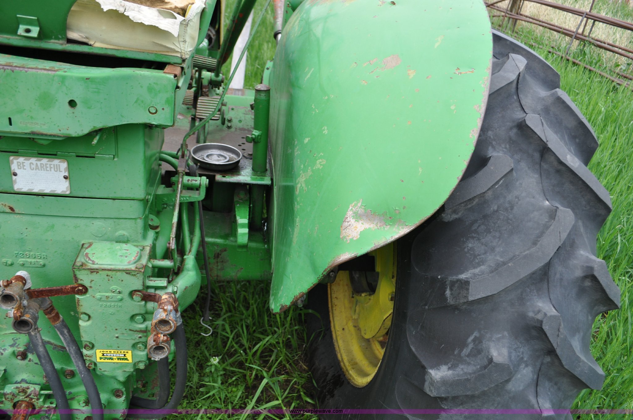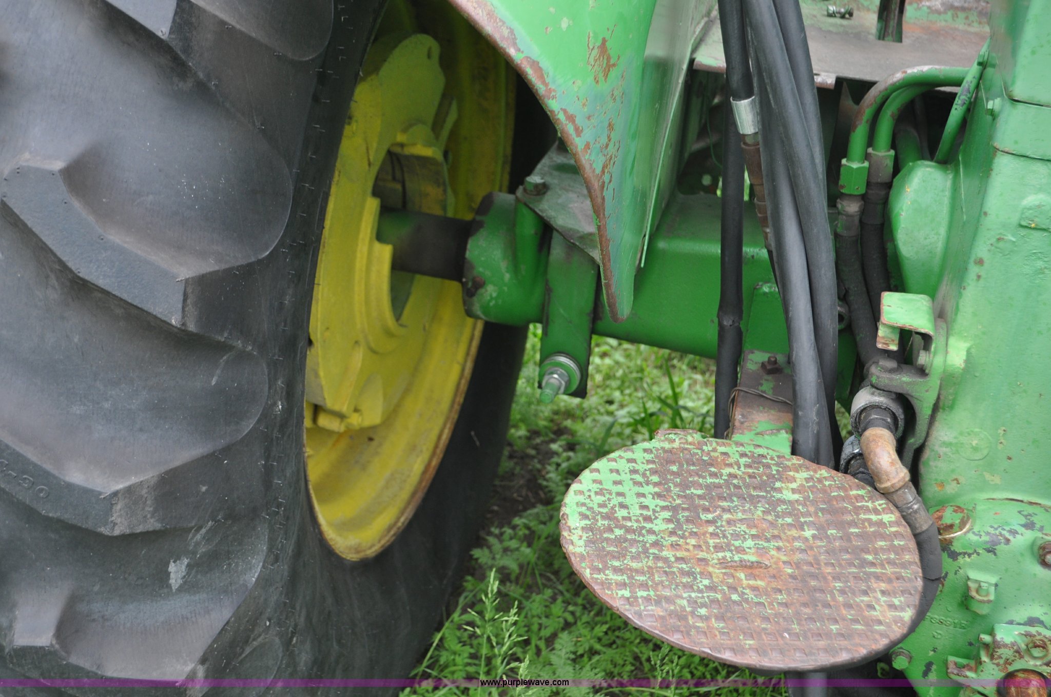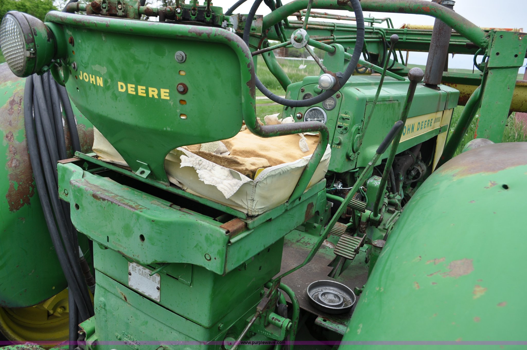 Purple Wave is selling a used Tractor in Nebraska. This item is a 1957 John Deere 720 tractor with the following: 561 hours on meter, John Deere two cylinder diesel engine, Pony motor start, Manual transmission, 6F-1R gears, John Deere loader, Grapple forks, Two lever control, Power steering, 540 PTO, (2) rear hydraulic remotes, Wheel weights, 7.50-18 front tires, 18.4-30 rear tires, Needs battery, Unknown operating condition, Engine turns freely, Serial 7209769