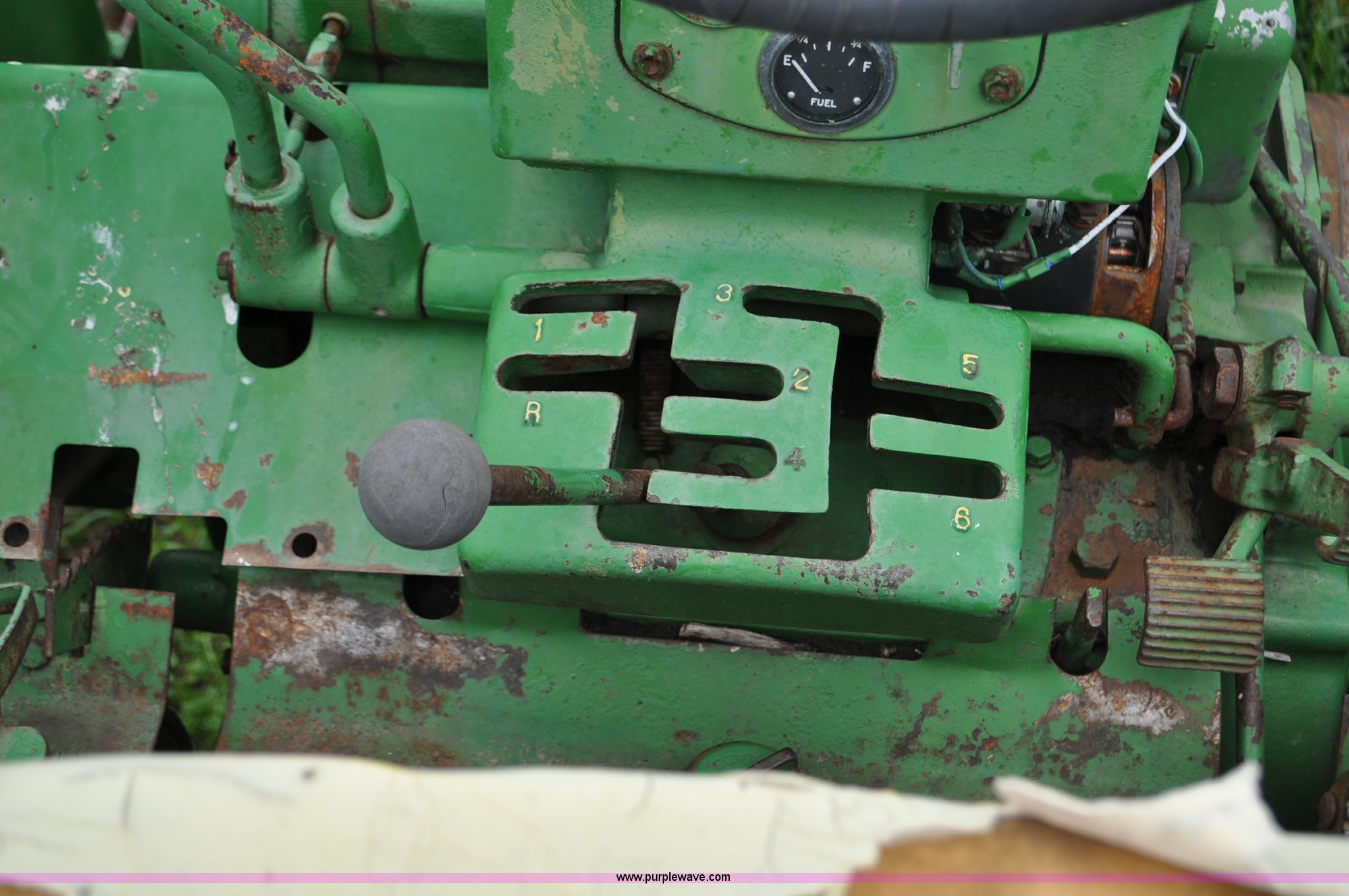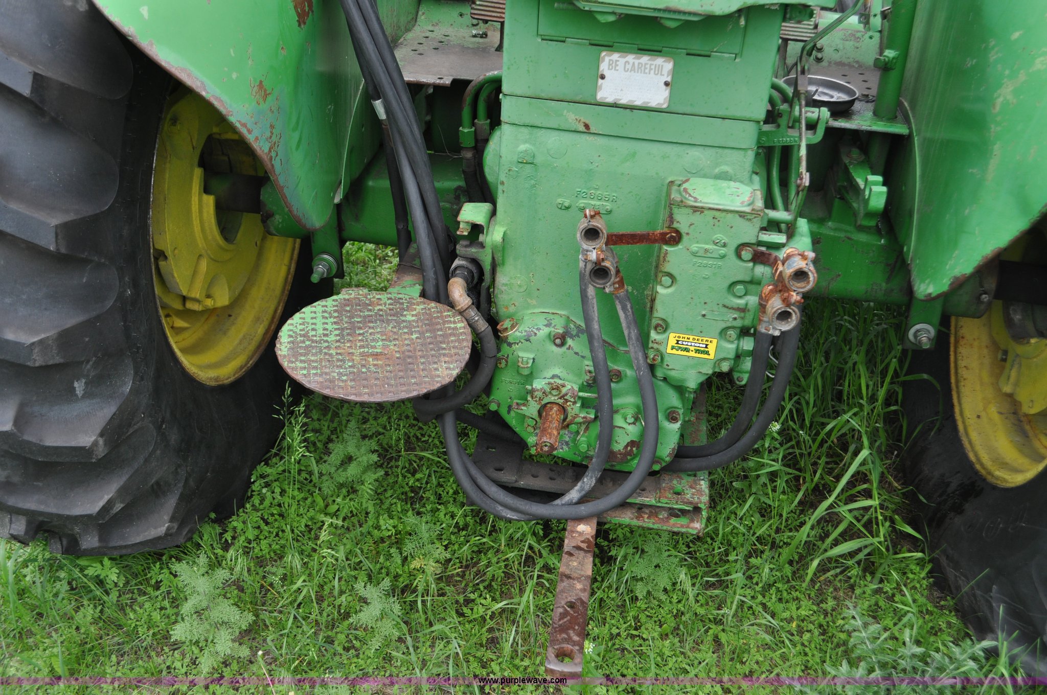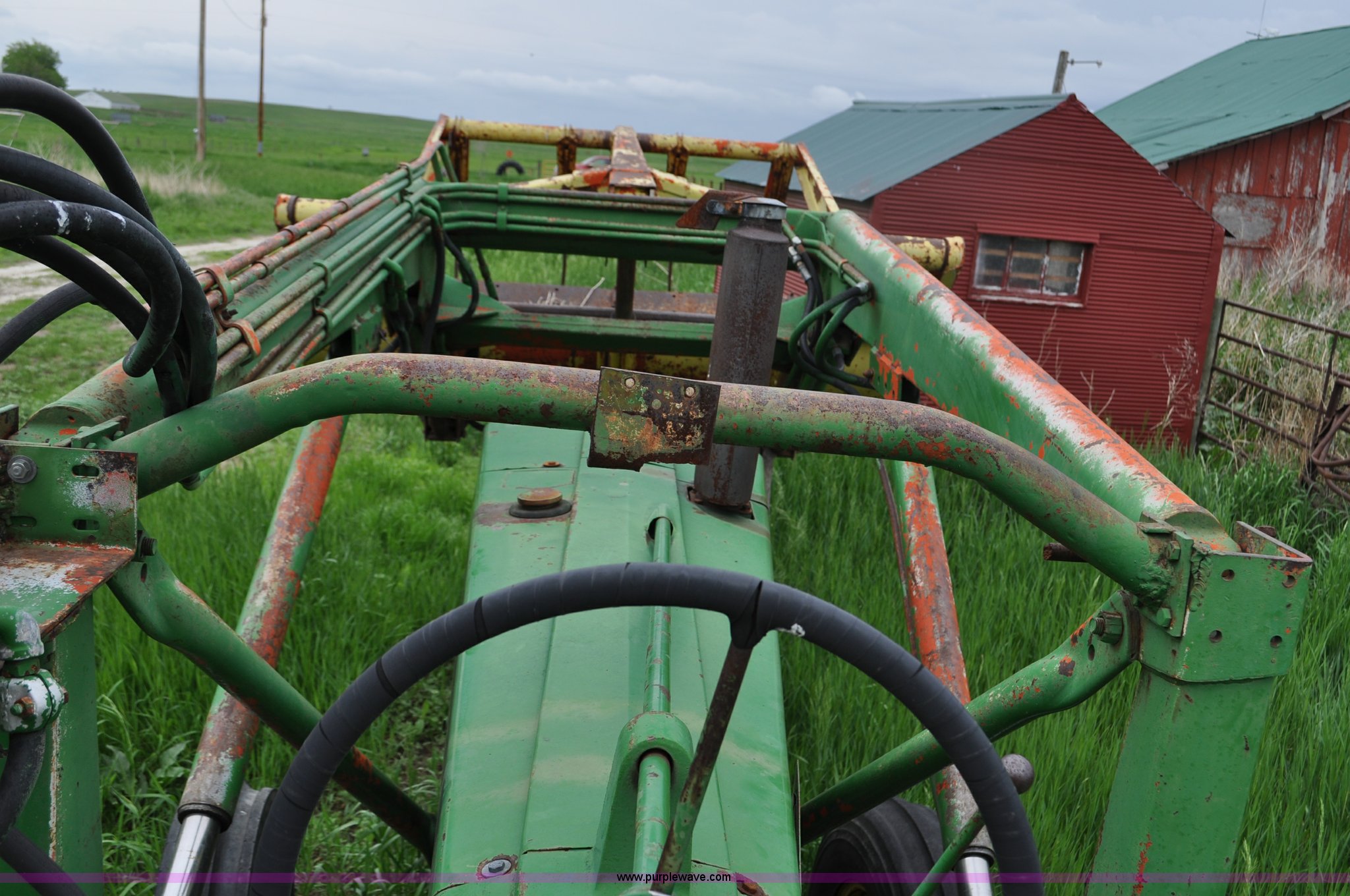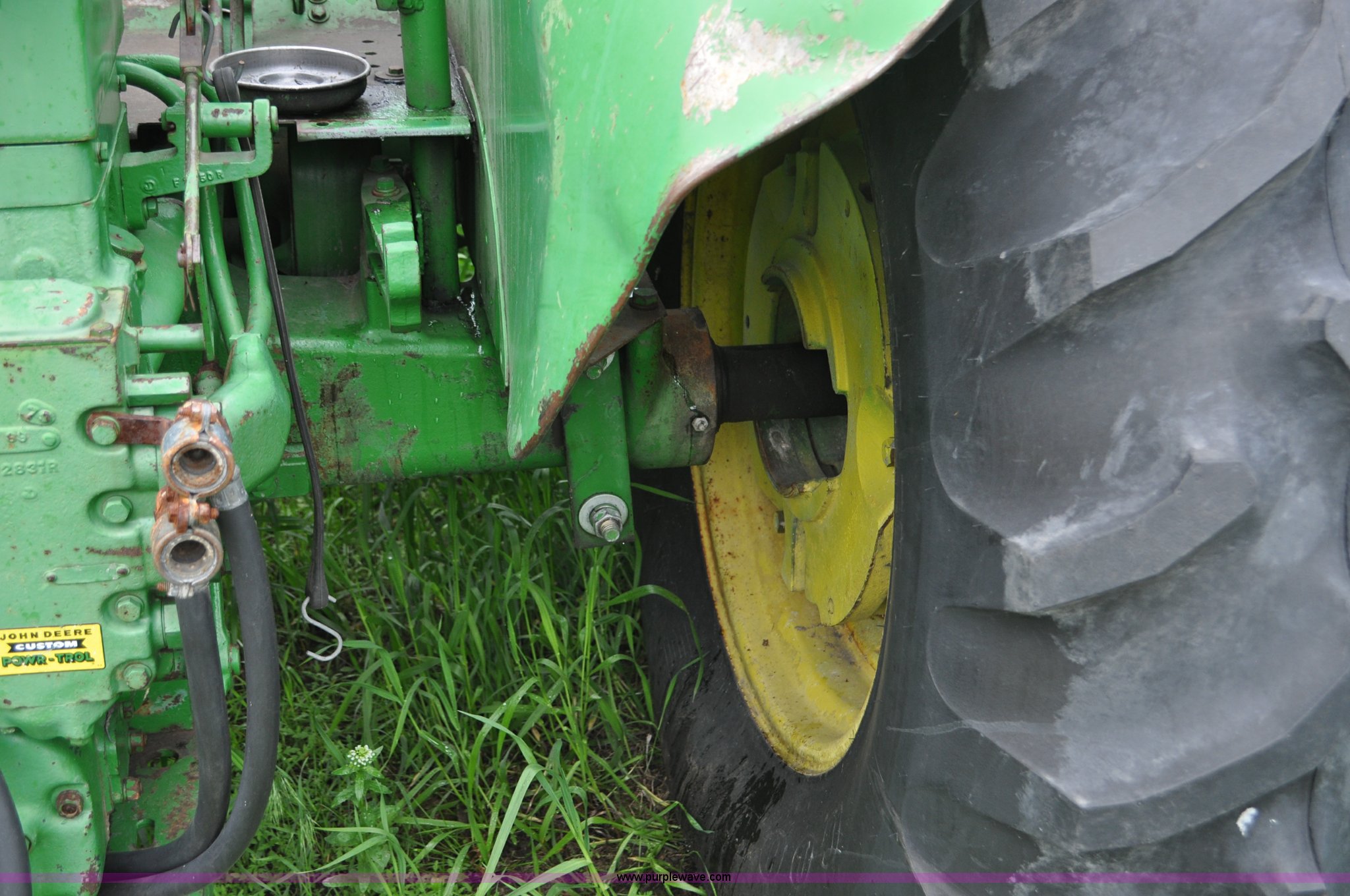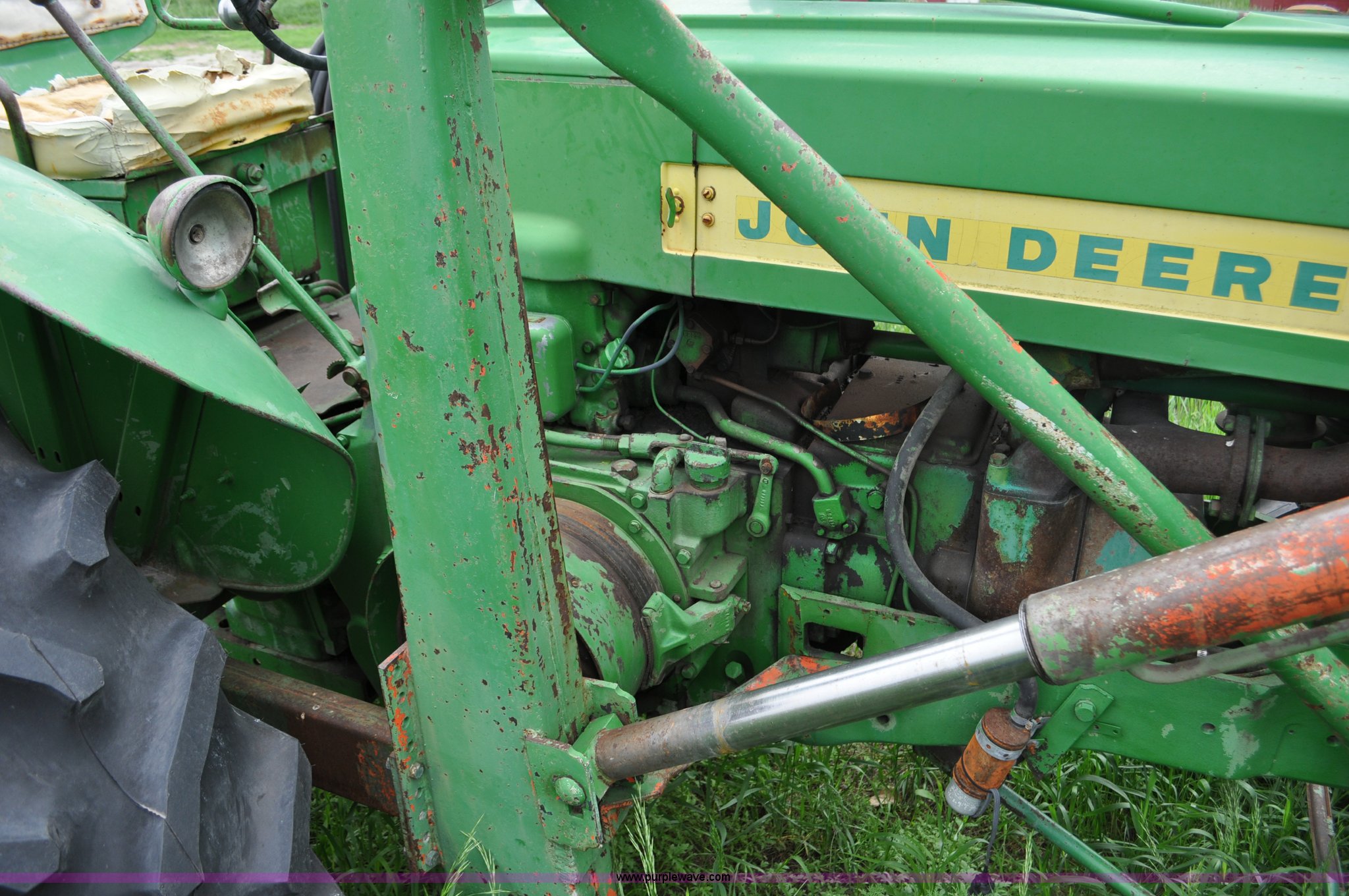 Purple Wave is selling a used Tractor in Nebraska. This item is a 1957 John Deere 720 tractor with the following: 561 hours on meter, John Deere two cylinder diesel engine, Pony motor start, Manual transmission, 6F-1R gears, John Deere loader, Grapple forks, Two lever control, Power steering, 540 PTO, (2) rear hydraulic remotes, Wheel weights, 7.50-18 front tires, 18.4-30 rear tires, Needs battery, Unknown operating condition, Engine turns freely, Serial 7209769