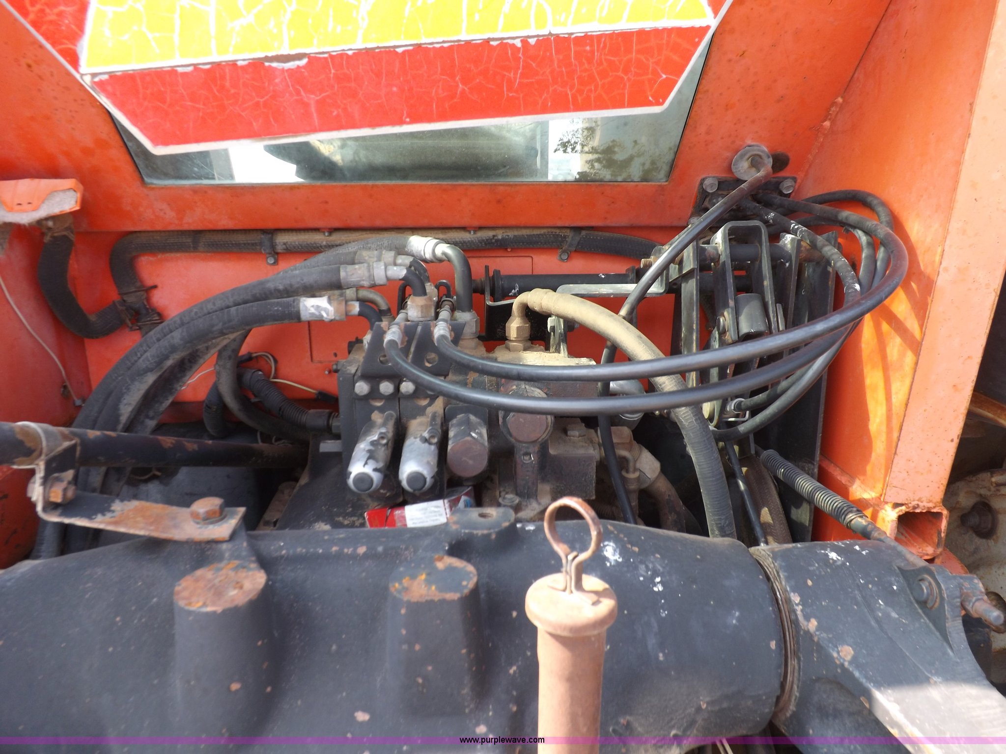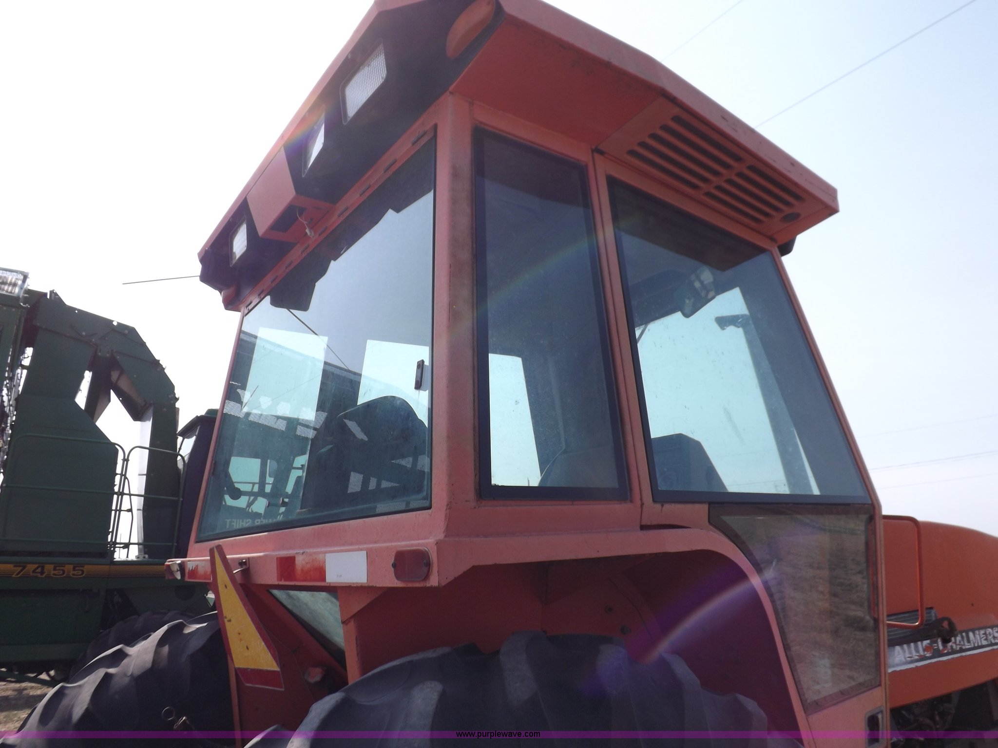 Purple Wave is selling a used Tractor in Kansas. This item is a 1982 Allis Chalmers 8050 tractor with the following: 7,516 hours on meter, Deutz six cylinder diesel engine, Model BF6L913C, Powershift transmission, 12F-2R gears, Locking differential, AC and heat, AM/FM, Spring suspension seat, Three point, Draw bar, Auxiliary outlet, 540 PTO, Suitcase weights, Wheel weights, 106" wheelbase, 11.00-16 front tires, 18.4-38 rear tires, Left hand door latch broken, Serial 8050S1200