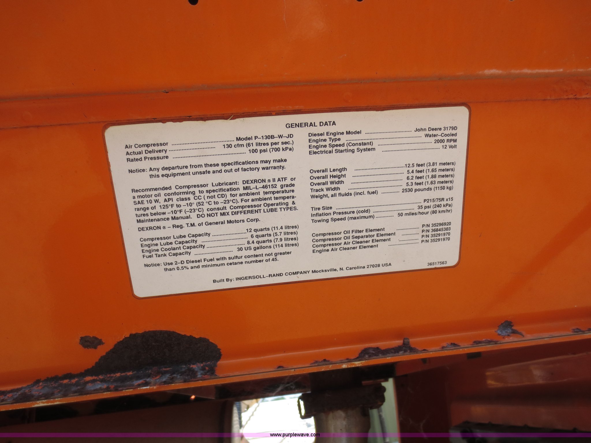 Purple Wave is selling a used Air Compressor in Kansas. This item is a Ingersoll Rand air compressor with the following: Model P-130B-W-JD, 185 actual hours, 130 cfm, 100 psi, John Deere 3179D diesel engine, Temperature gauge inoperable