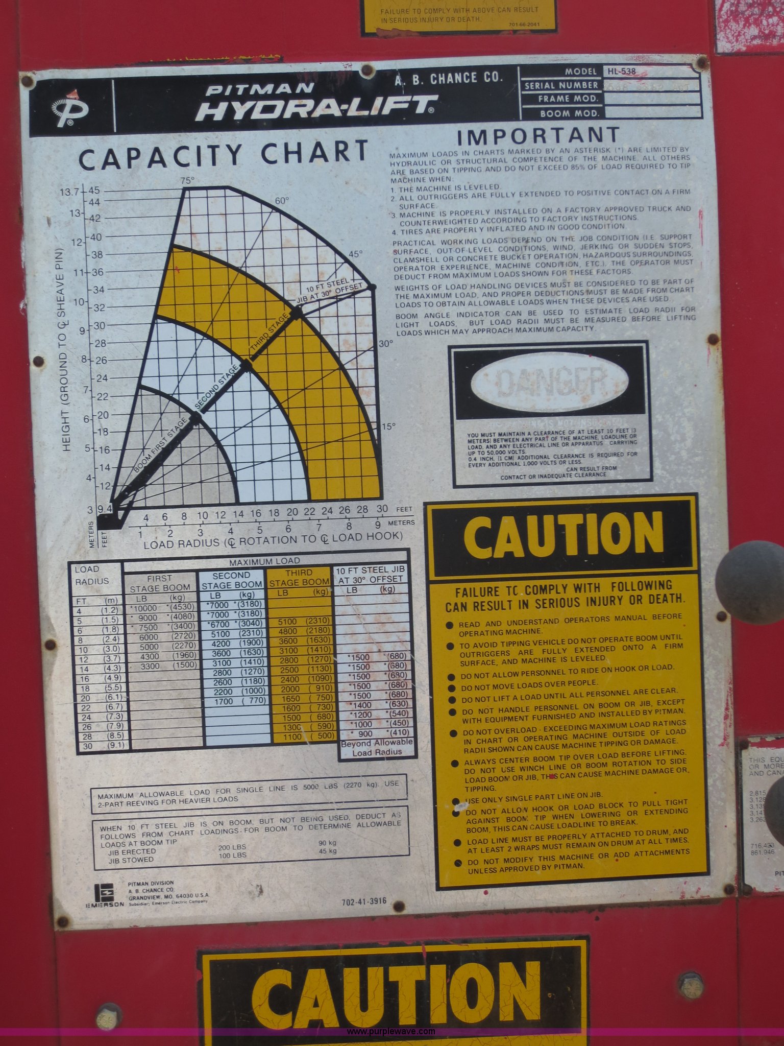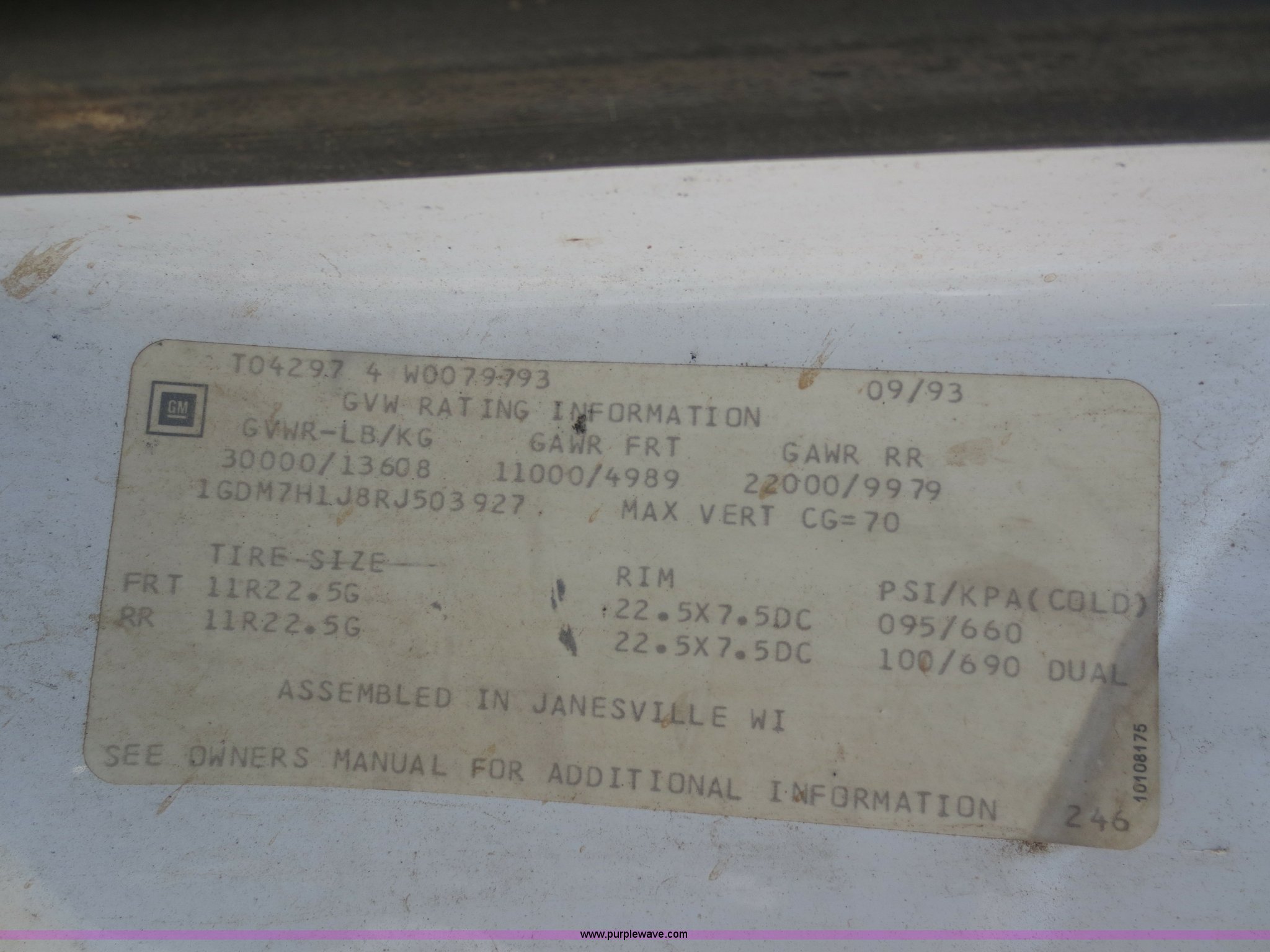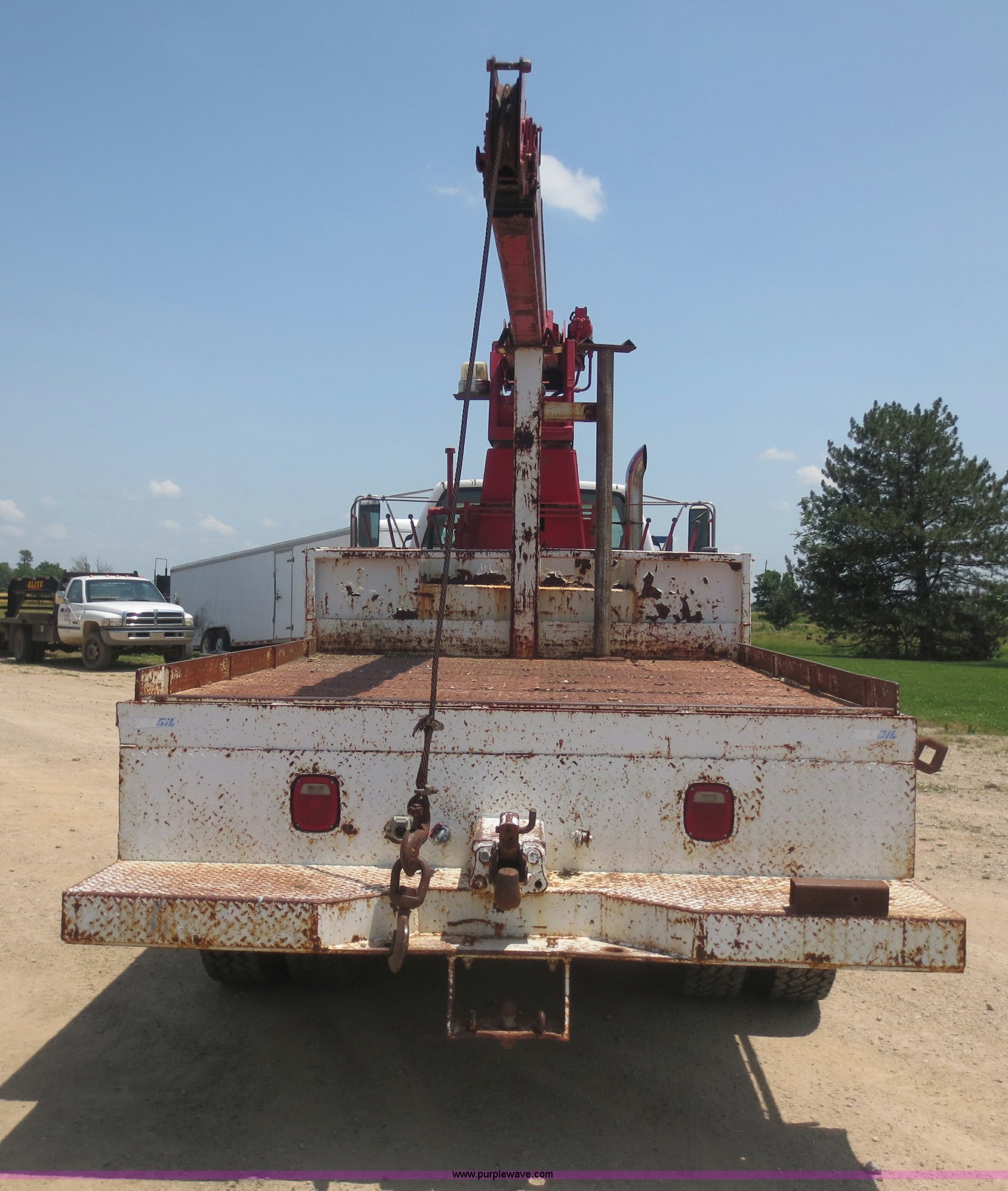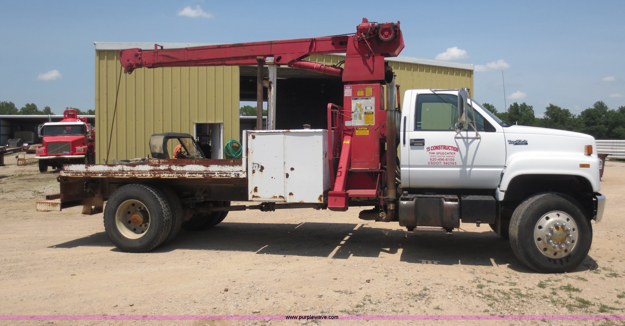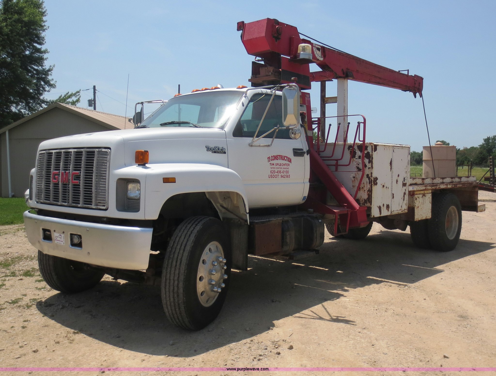Purple Wave is selling a used Crane Truck in Kansas. This item is a 1994 GMC TopKick boom truck with the following: 109,578 miles on odometer, Caterpillar 3116 6.6L six cylinder diesel engine, Allison four speed automatic transmission, AM/FM, Hand throttle, Pintle hitch, Pitman Hydra-Lift 30' boom, Model HL538, 10,000 lb capacity, Two stage hydraulic boom, Three stage manual pull out, Hydraulic winch, 5/8" cable, Serial 35383982AGTN, PTO, Spring suspension, Air brakes, 11R22.5 tires, GVWR 30,000 lbs, FAWR 11,000 lbs, RAWR 22,000 lbs, Cracked windshield