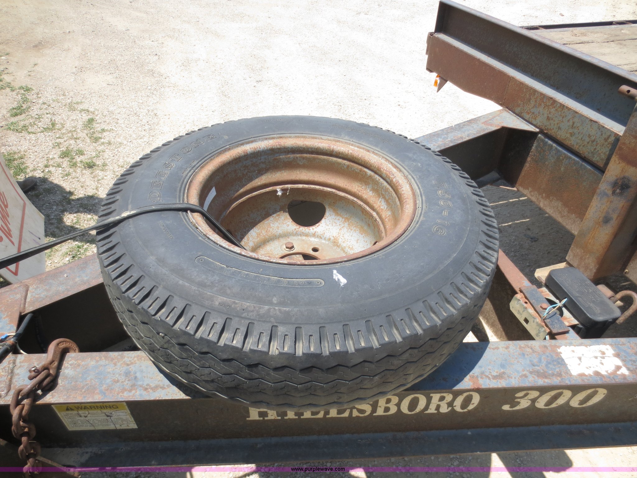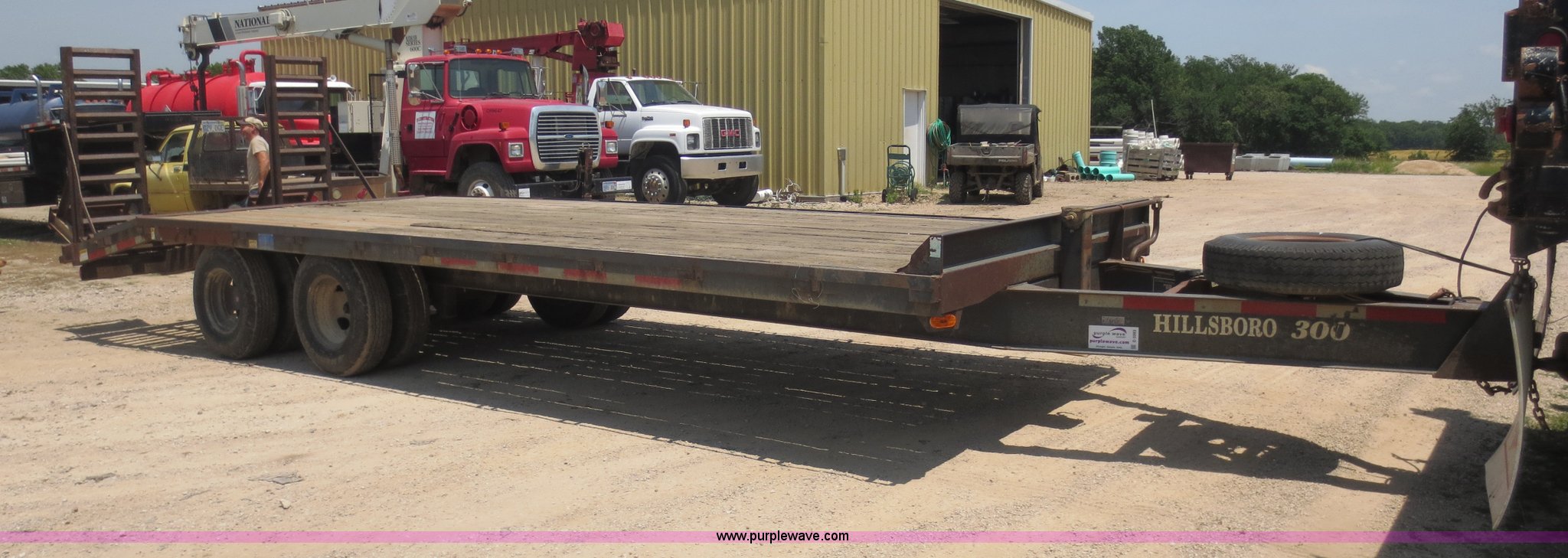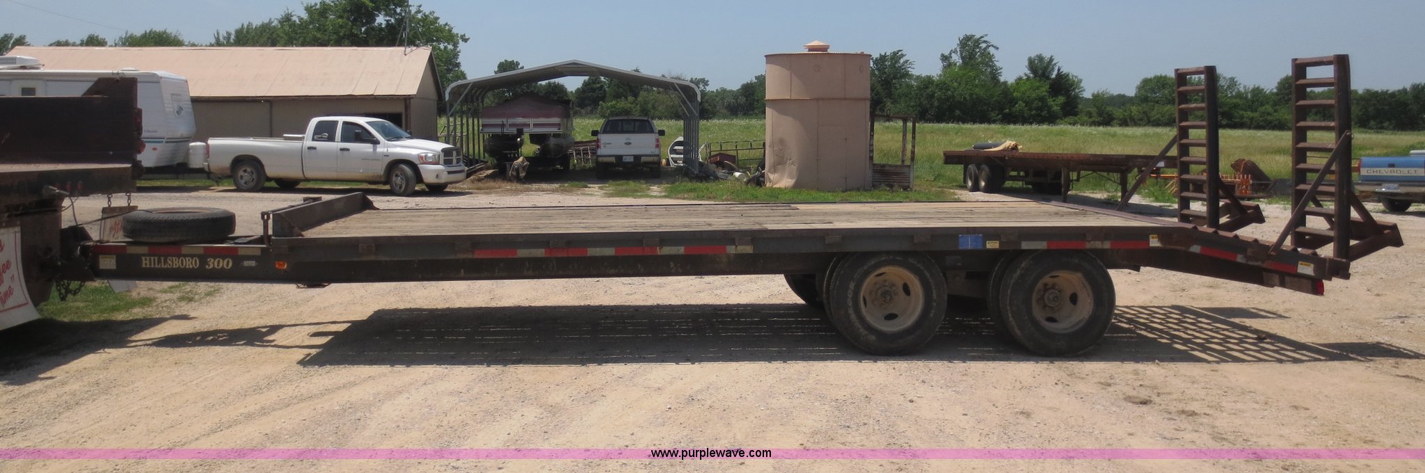 Purple Wave is selling a used Equip. Trailer in Kansas. This item is a 1996 Hillsboro trailer with the following: 20' flat floor, 4' dovetail, 96"W, Wood floor, Pintle hitch, Loading ramps, Electric brakes, Tandem axle, 7.50R16LT tires, Spare tire