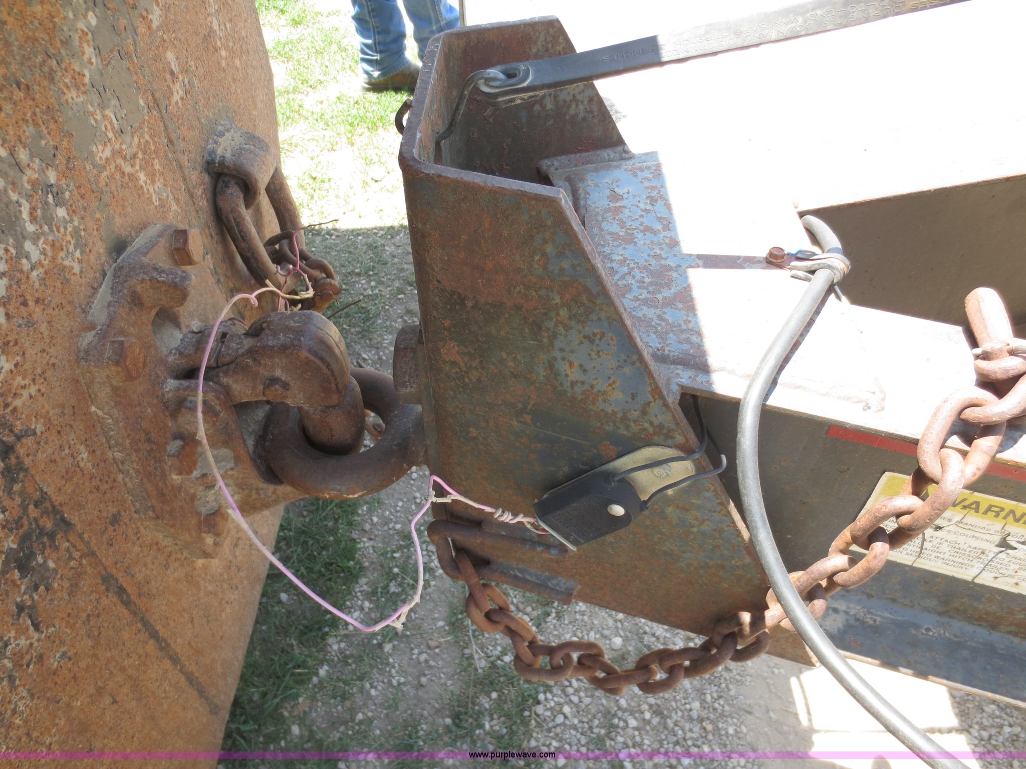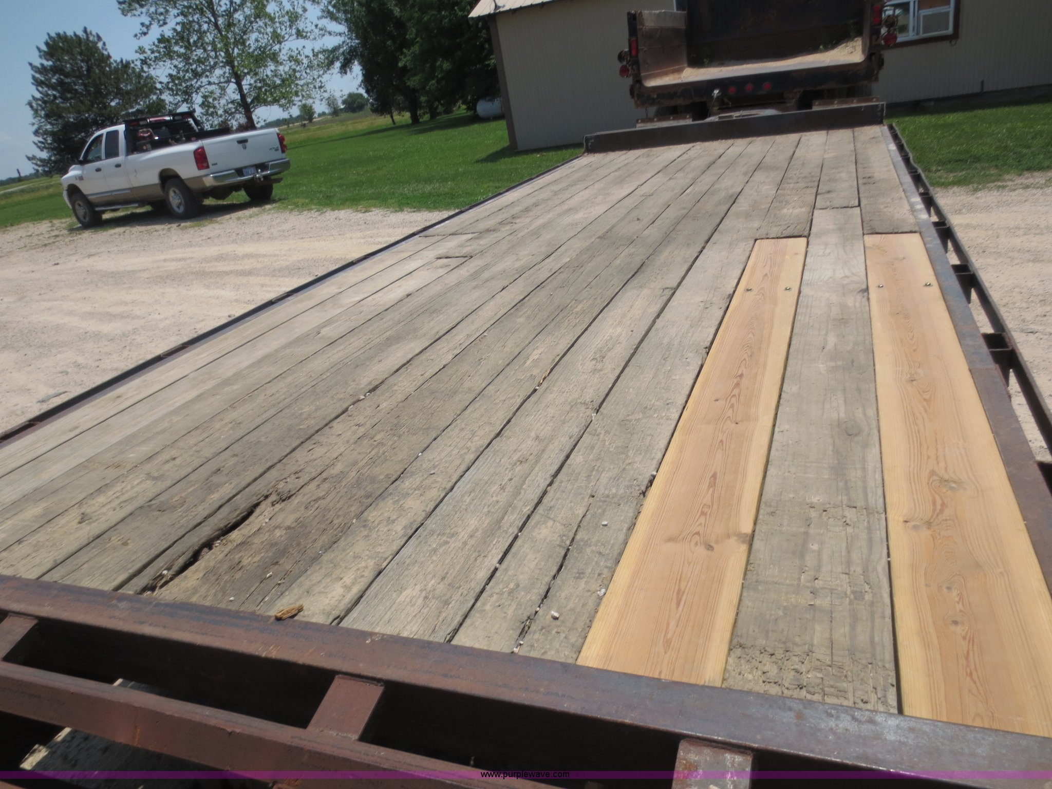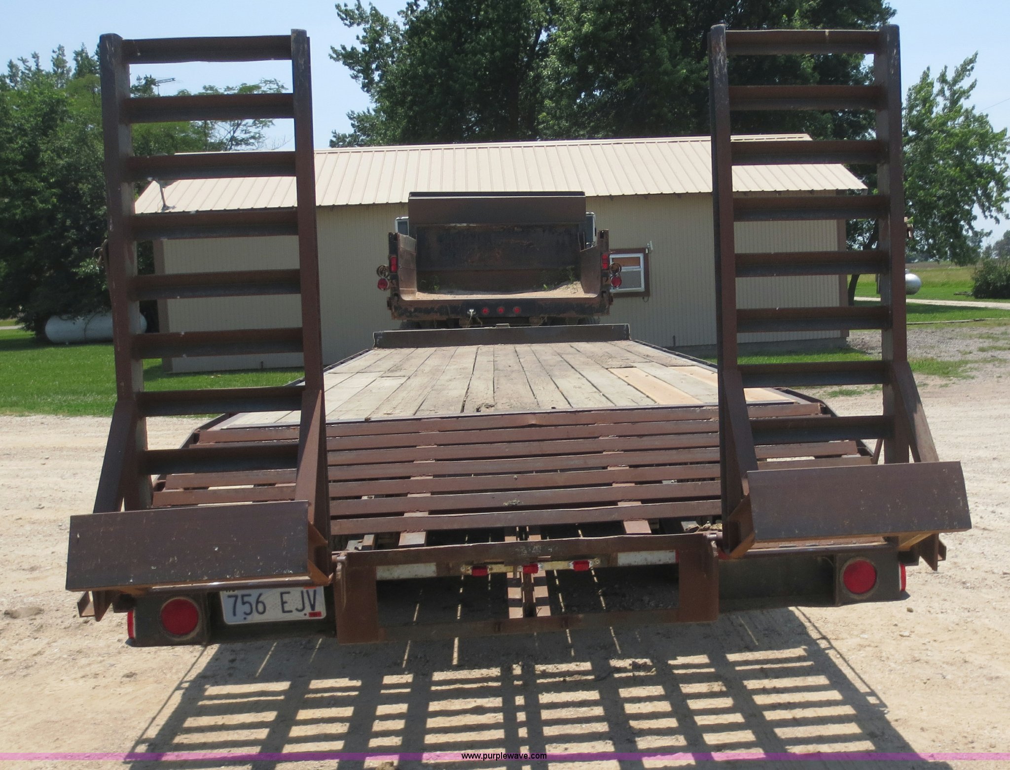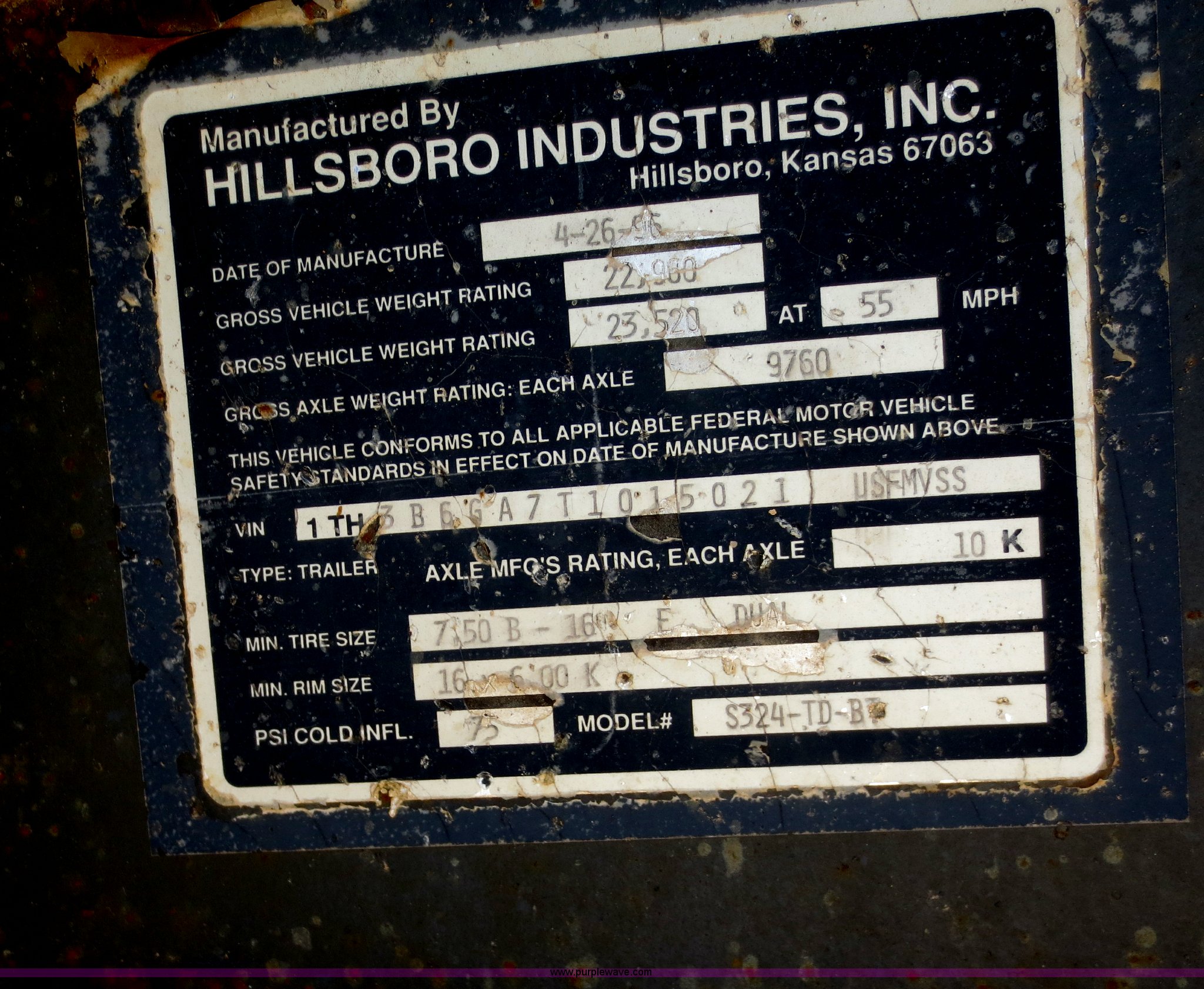 Purple Wave is selling a used Equip. Trailer in Kansas. This item is a 1996 Hillsboro trailer with the following: 20' flat floor, 4' dovetail, 96"W, Wood floor, Pintle hitch, Loading ramps, Electric brakes, Tandem axle, 7.50R16LT tires, Spare tire