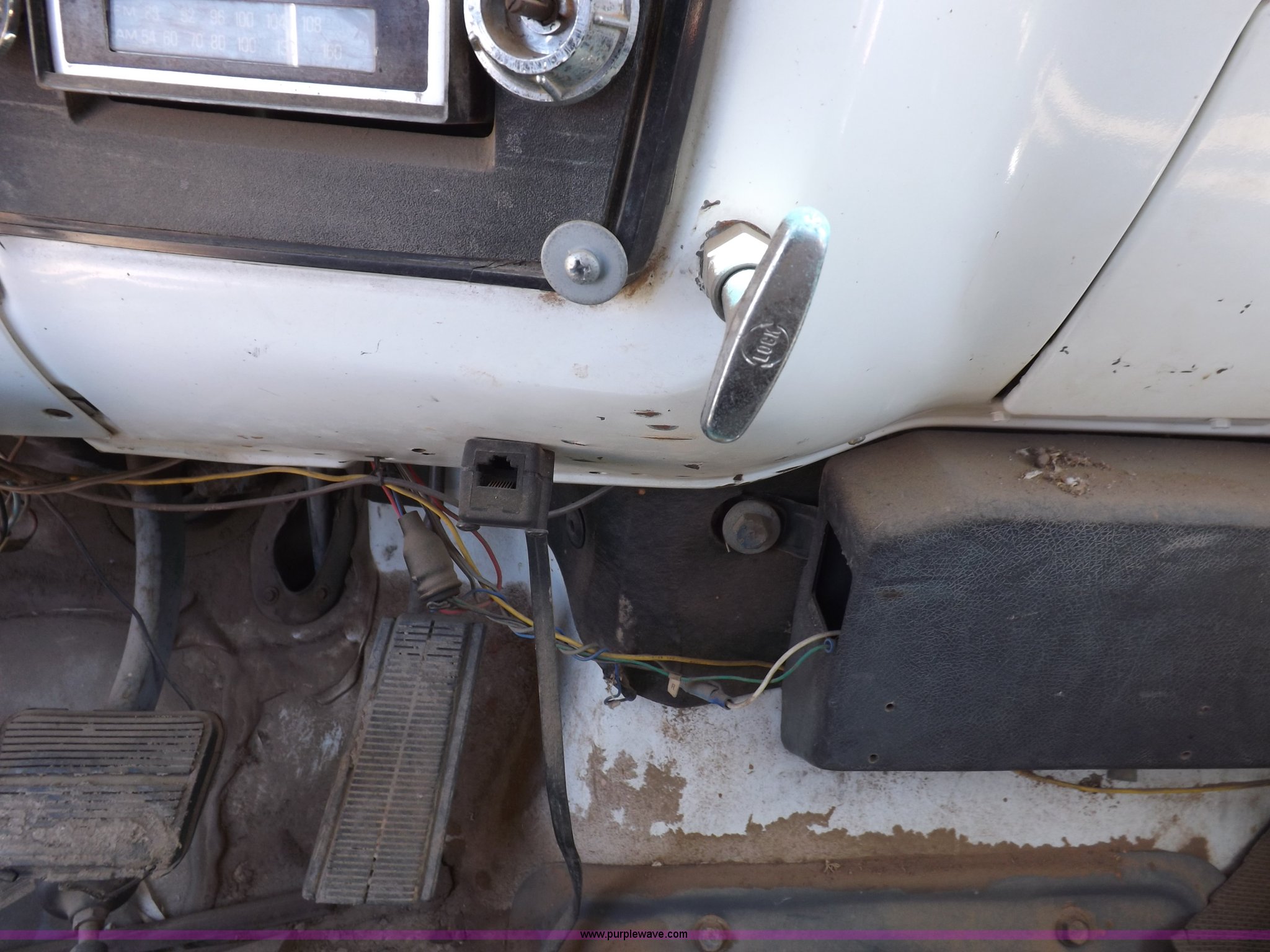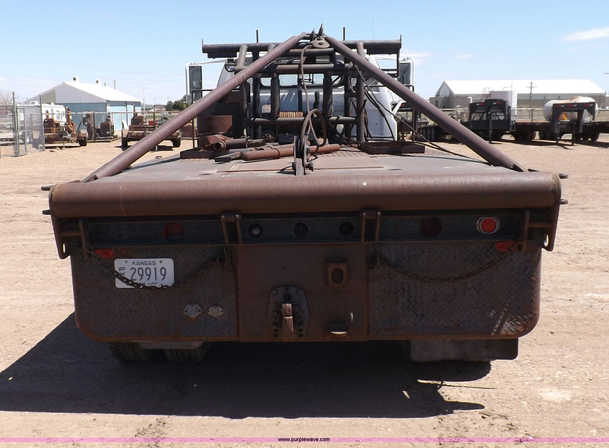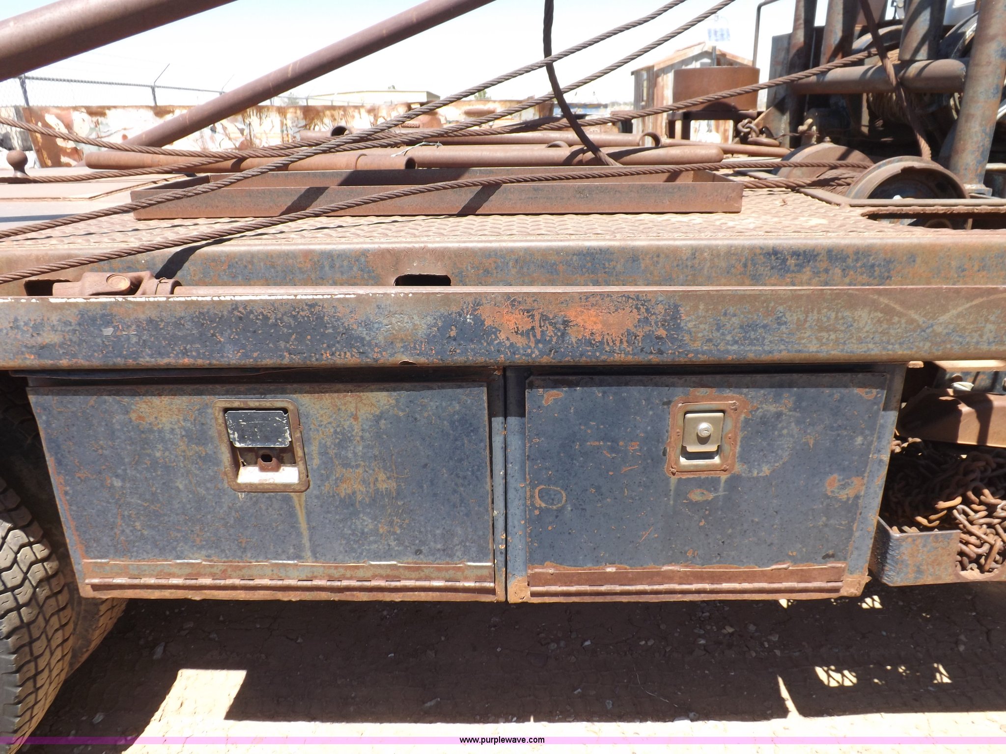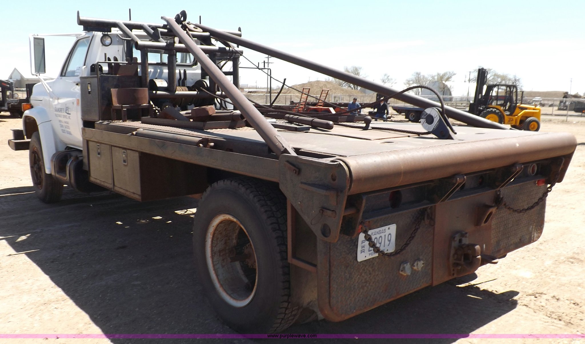 Purple Wave is selling a used Flat Bed Truck in Kansas. This item is a 1984 GMC TopKick oilfield truck with the following: 29,550 miles on odometer, Not Actual Mileage, 6.0L V8 gas engine, Five speed manual transmission, Two speed rear end, Heat, AM/FM, Behind seat storage, Mico brake lock, Warner brake controller, Dual 50 gallon fuel tank, 13'8"L x 96"W bed, Gin poles and rigging, Dual winches, Headache rack, Full width rolling tailboard, 2 5/16" gooseneck hitch, (2) 24"W x 24"D x 16"H storage boxes, (2) 24"W x 17"D x 16"H storage boxes, 24"W x 17"D x 17"H storage box, 30"W x 17"D x 17"H storage box, Heavy duty oilfield front bumper, 189" wheelbase, 9.00R20 tires, GVWR 24,550 lbs, Transmission needs work