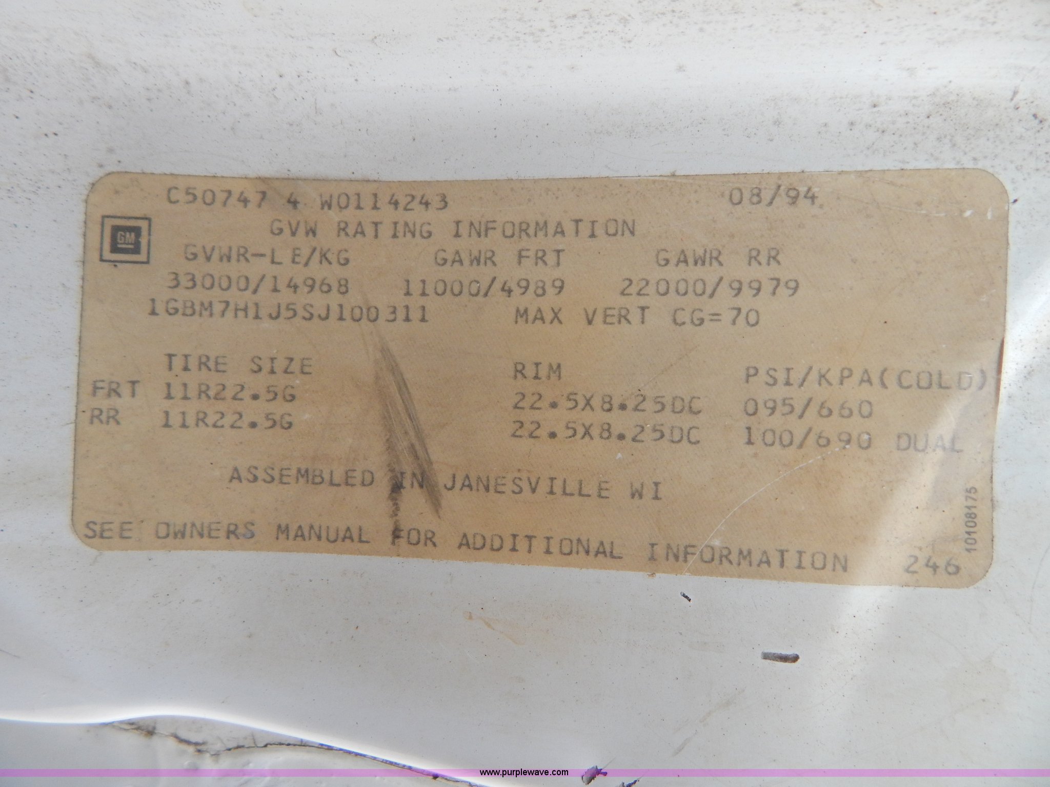 Purple Wave is selling a used Construction Dump Truck in Missouri. This item is a 1995 Chevrolet Kodiak dump truck with the following: 259,017 miles on odometer, Caterpillar 3116 6.6L L6 diesel engine, 215 HP, Serial 9GK10360, Six speed manual transmission, PTO, 10'L x 8'W bed, 3.5'H sideboards, Air brakes, GVWR 33,000 lbs, FAWR 11,000 lbs, RAWR 22,000 lbs, AC inoperable, Windshield cracked
