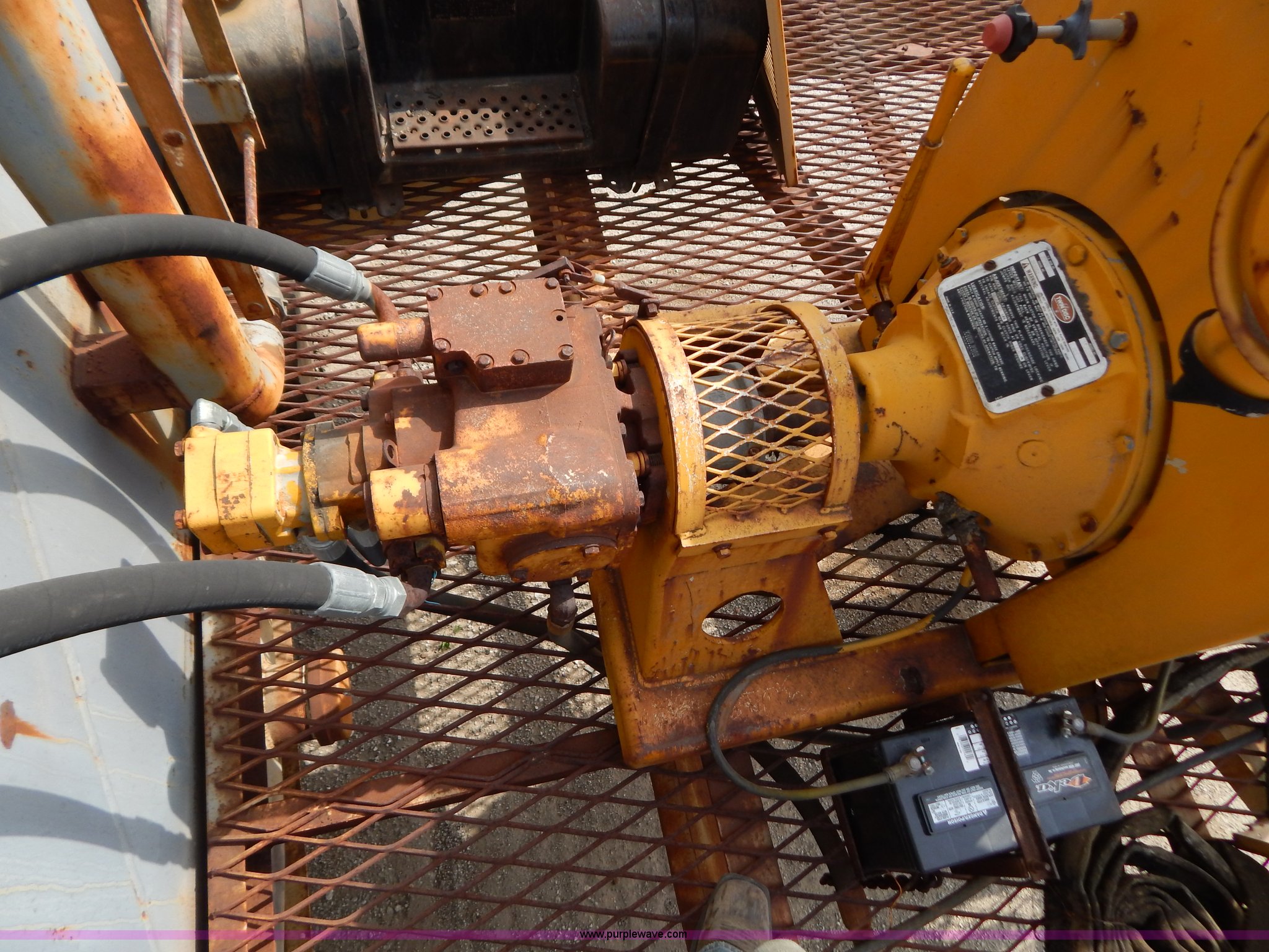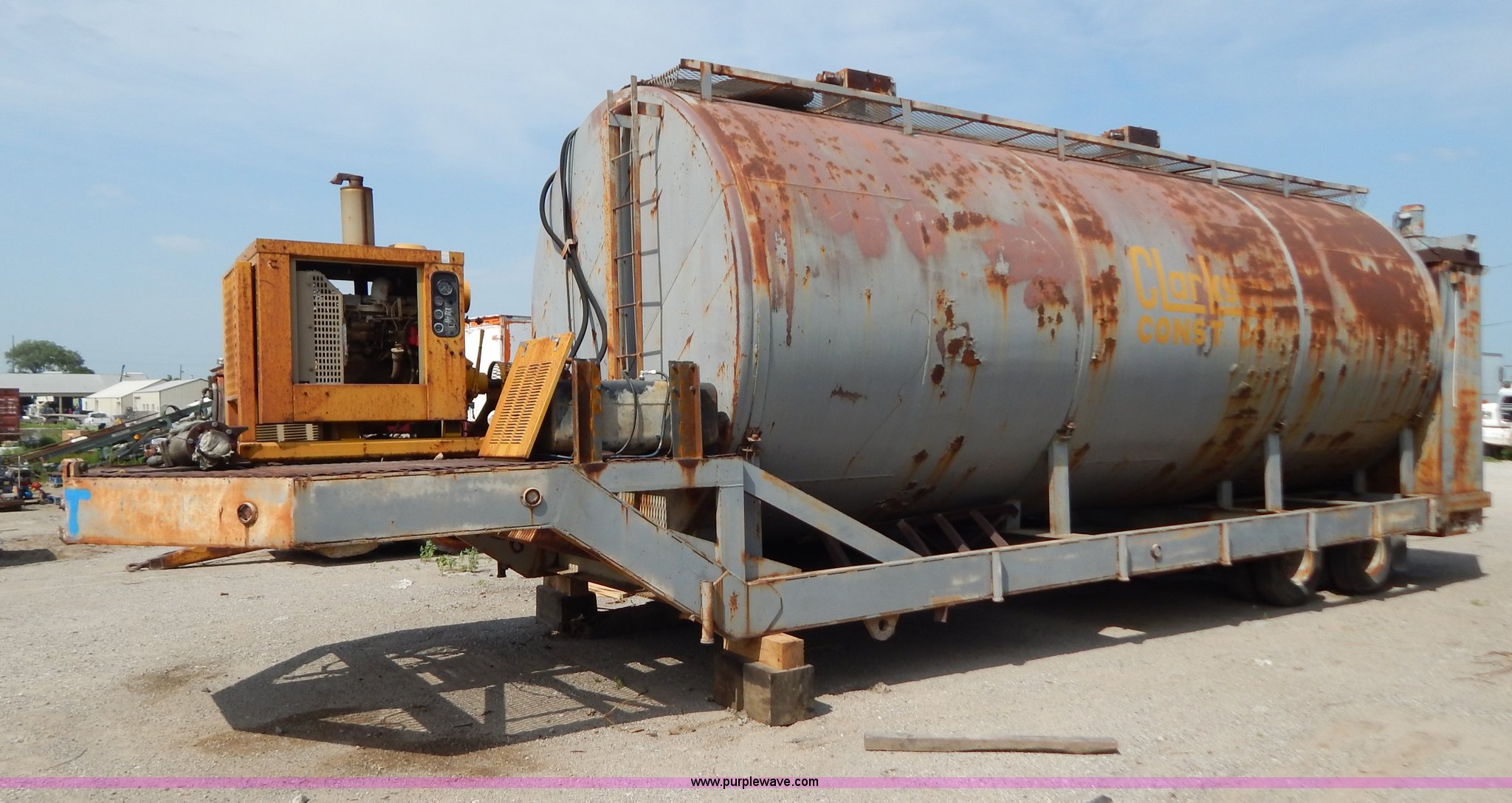 Approximately 10,000 gallon portable tank. 1,419 hours on meter, Cummins 3.9L diesel engine, 26'L x 10' diameter drum, 8.25-15 tires, Previously used form mixing lime, Air brakes inoperable, Front mixer pedal inoperable, Rear gear box needs repair. Shipping quotes available. Clarkson Construction Company. 4133 Gardner. Kansas City, MO 64120