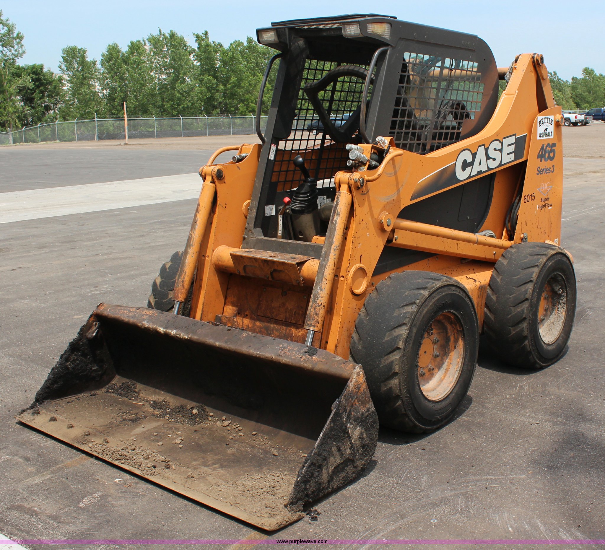 2008 Case 465 Series 3 High Flow skid steer. 2,570 hours on meter, Case four cylinder diesel engine 88 HP, 72" bucket, 3,200 lb operating load capacity, 6,000 lb tipping load, Auxiliary hydraulics, High Flow 41.8 gpm, Rear counter weight, 20.2 gallon fuel tank, 12x16.5 tires, Serial N8M485079. View equipment video. Shipping quotes available. Bettis Asphalt. 1800 NW Brickyard. Topeka, KS 66606
