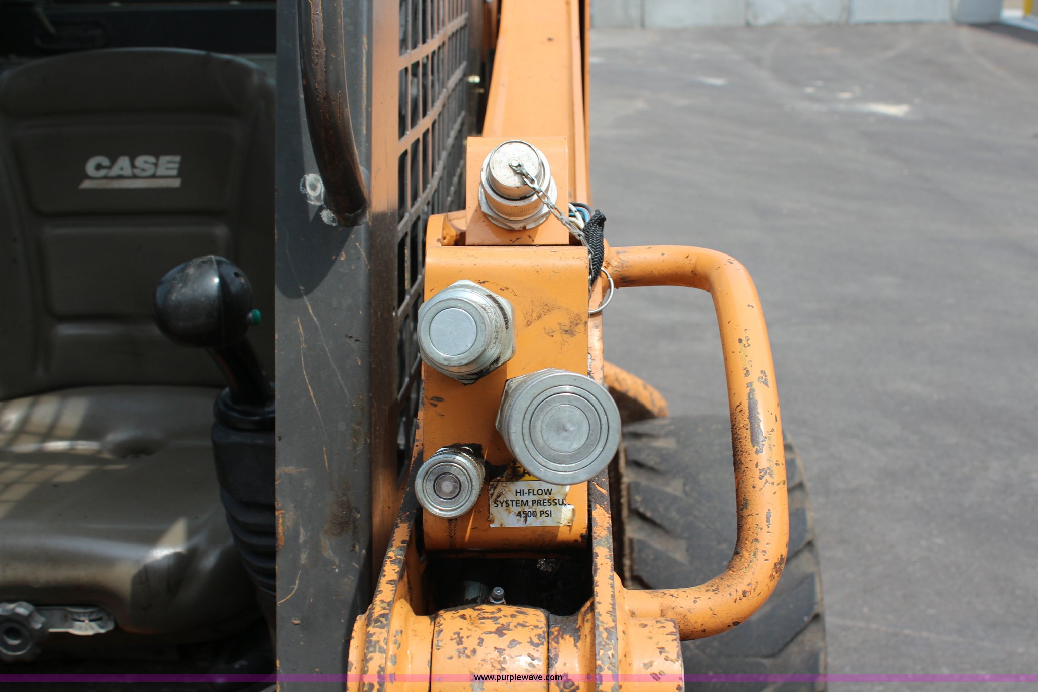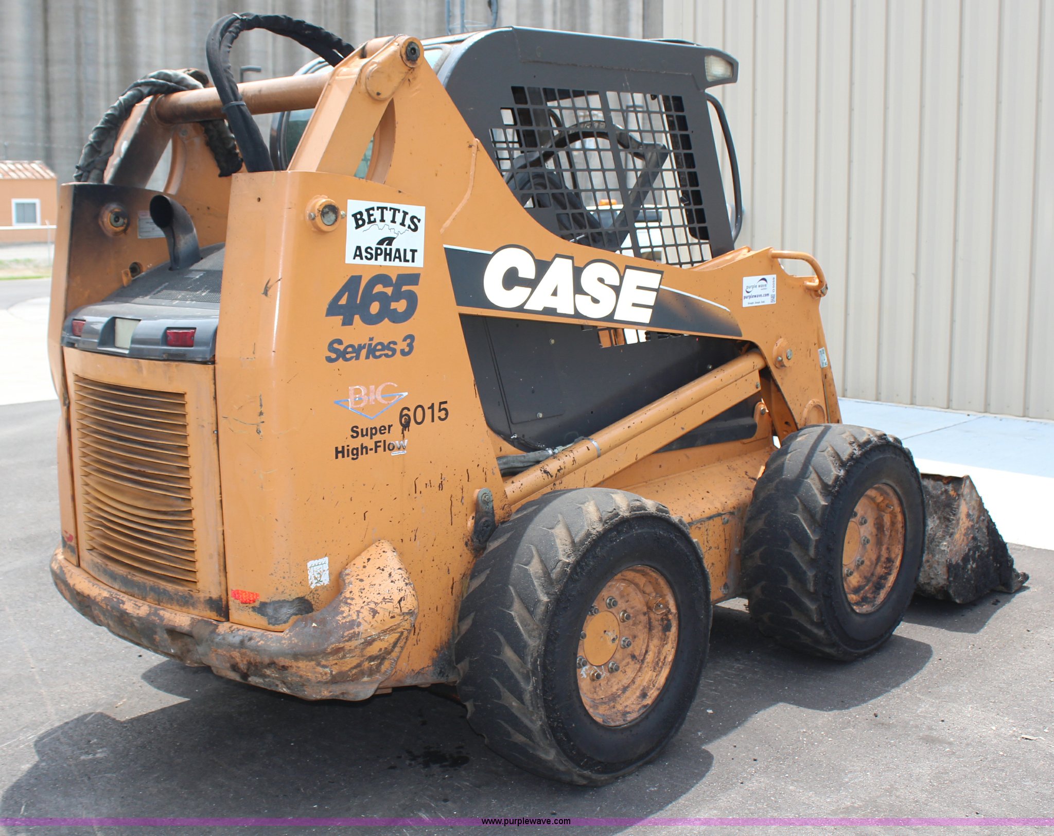 Purple Wave is selling a used Skid Steer Loader in Kansas. This item is a 2008 Case 465 Series 3 High Flow skid steer with the following: 2,570 hours on meter, Case four cylinder diesel engine, 88 HP, 72" bucket, 3,200 lb operating load capacity, 6,000 lb tipping load, Auxiliary hydraulics, High Flow, 41.8 gpm, Rear counter weight, 20.2 gallon fuel tank, 12x16.5 tires, Serial N8M485079