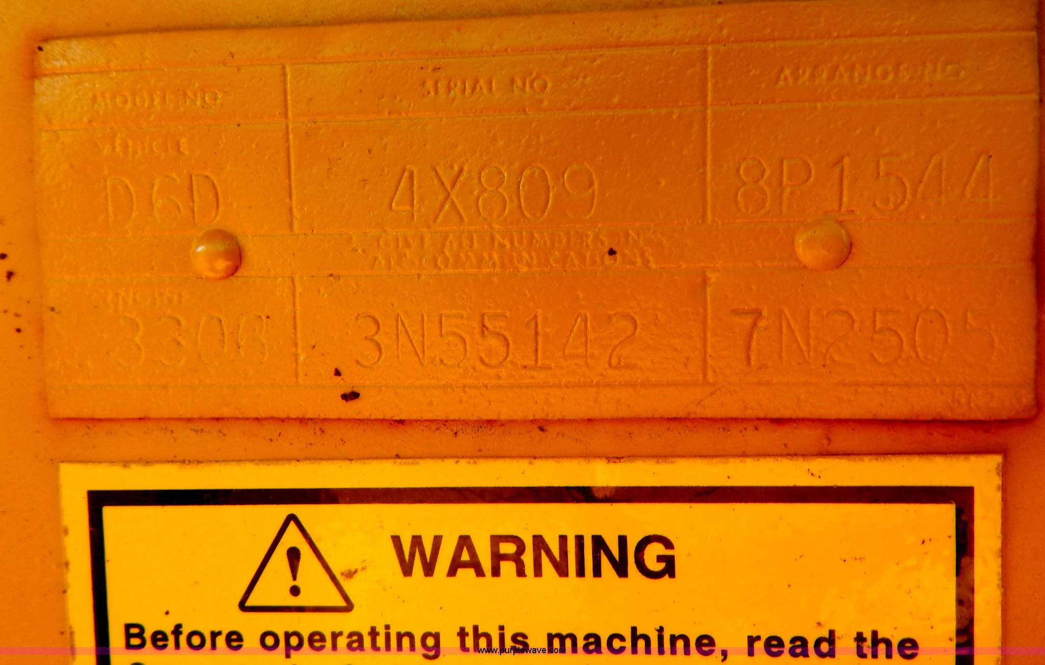 Purple Wave is selling a used Crawler Dozer in Missouri. This item is a 1977 Caterpillar D6D dozer with the following: 5,822 hours on meter, Hour meter inoperable, Caterpillar 3306 diesel engine, Arrangement 7N2505, Serial 3N55142, 3F-3R gears, Single joystick blade control, 10'W six-way blade, Smooth bolt-on cutting edge, Rear draw bar, 20"W tracks, 33,011 lbs. base operating weight, Serial 04X00809