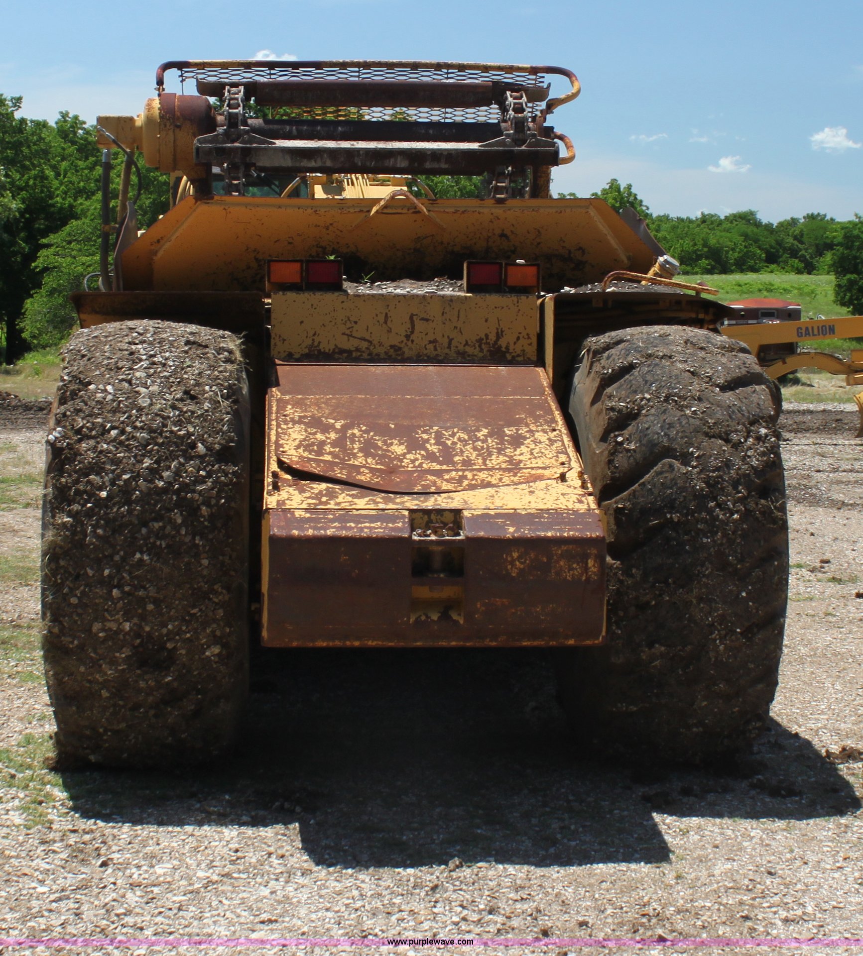Purple Wave is selling a used Elevating Scraper in Kansas. This item is a 2000 Caterpillar 615C Series II paddle scraper with the following: 5,172 hours on meter, Caterpillar 3306 diesel engine, 250 HP, Six speed transmission, Heater fan, Suspension seat, Front and rear windshield wiper, Block heater, 78" scraper blades, 16 yard capacity, Air suspension front axle, 295/R25 tires, 52,600 lbs. base operating weight, Crowd cylinder has been rebuilt, Recently replaced battery, AC needs charged, Serial 9XG01380