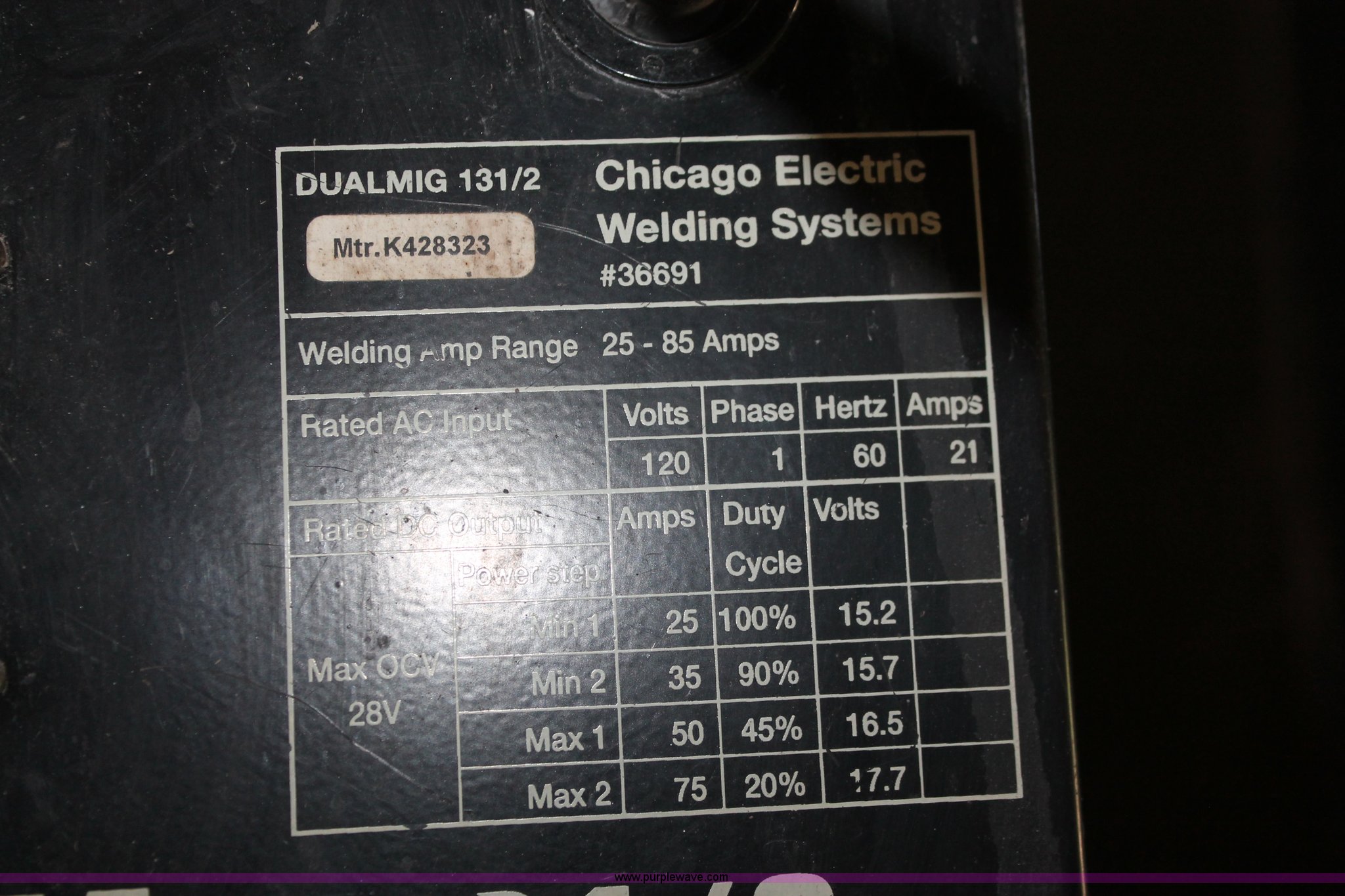 Purple Wave is selling a used Welder (Manual) in Oklahoma. This item is a Chicago Electric Dual Mig 13 1/2 welding system with the following: Serial BG0434-6, Unit# 1152