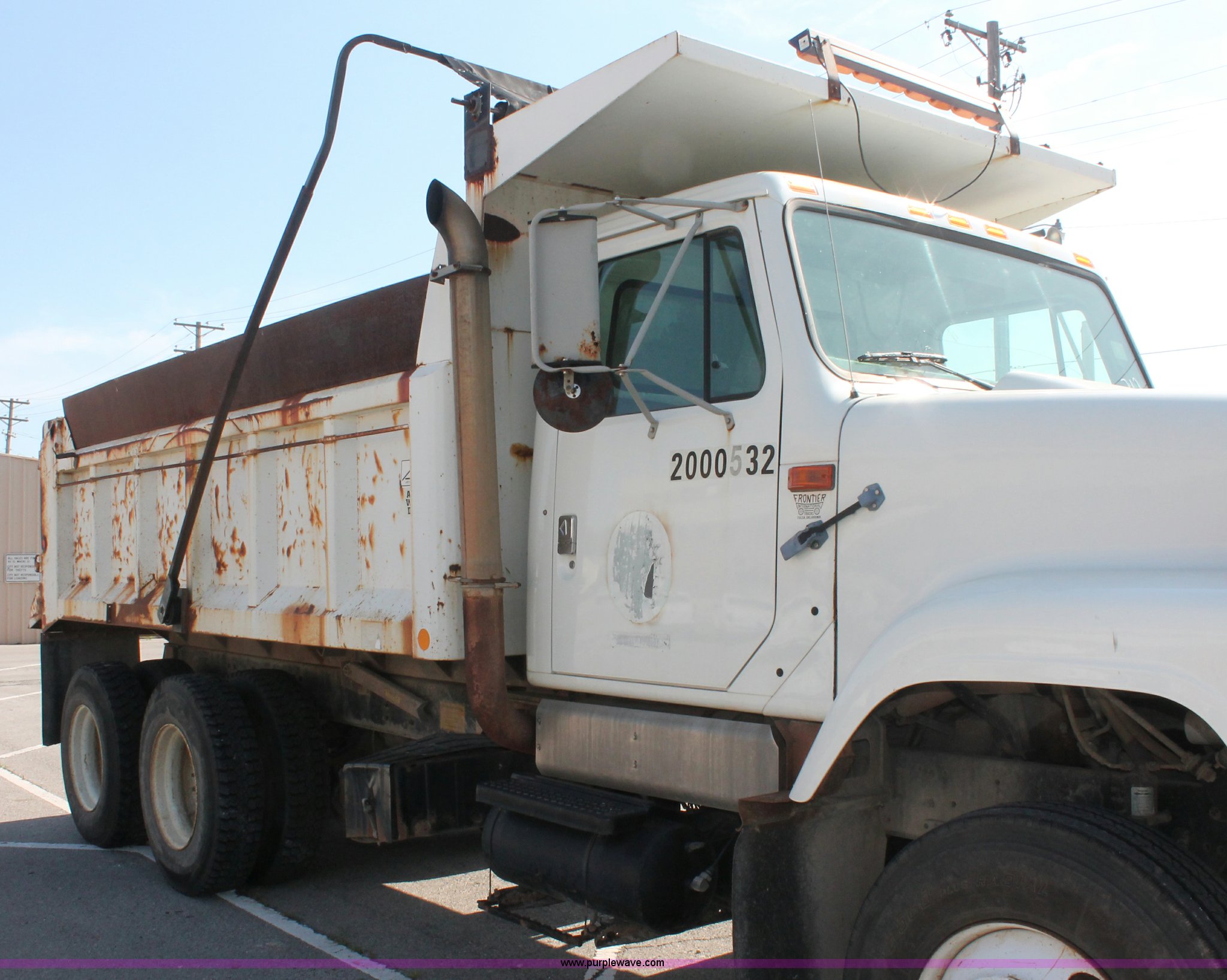 Purple Wave is selling a used Construction Dump Truck in Oklahoma. This item is a 2000 International 2554 dump truck with the following: 103,985 miles on odometer, 7,486 hours on meter, International DT530E 8.7L L6 diesel engine, 275 HP, Serial 531HM2U1207089, Five speed automatic transmission, AC and heat, Cruise, AM/FM, Air suspension seat, Code 3 Arrowstick auxiliary light controls, Locking power divider, Air operated end gate, Single ram three stage hoist, Block heater, Trailer wiring, Pintle hitch, Donivan roll over tarp, 100 gallon fuel tank, Chelsea PTO, Front tow hooks, Air brakes, 204" wheelbase, 11R22.5 tires, GVWR 54,000 lbs, FAWR 14,000 lbs, IAWR 20,000 lbs, RAWR 20,000 lbs, Cracked glass, Motorola radio not included, Unit# 212