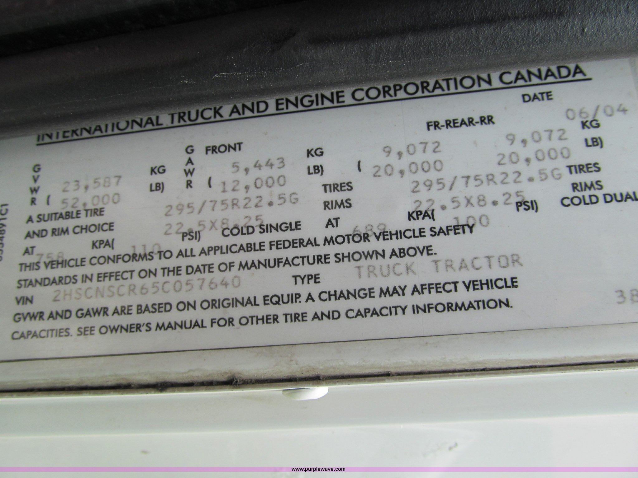 Purple Wave is selling a used Truck Tractor in Minnesota. This item is a 2005 International 9400i semi truck with the following: 909,917 miles on odometer, Caterpillar C15 15.2L L6 diesel engine, 435 HP, Eaton Fuller 10 speed manual transmission, Twin screw, AC and heat, Tilt, AM/FM/CD, Telescoping steering wheel, Air suspension seat, Power mirrors, Heated mirrors, Air ride cab, 90"W x 64"D x 77"H sleeper, Storage, Exterior visor, Block heater, Air slide fifth wheel plate, Dual fuel tanks, Quarter fenders, Single rear exhaust stack, Dump valves, Air suspension, Air brakes, Jake brake, Wheel nut covers, Aluminum front wheels, Steel rear wheels, 230" wheelbase, 295/75R22.5 tires, GVWR 52,000 lbs, FAWR 12,000 lbs, IAWR 20,000 lbs, RAWR 20,000 lbs