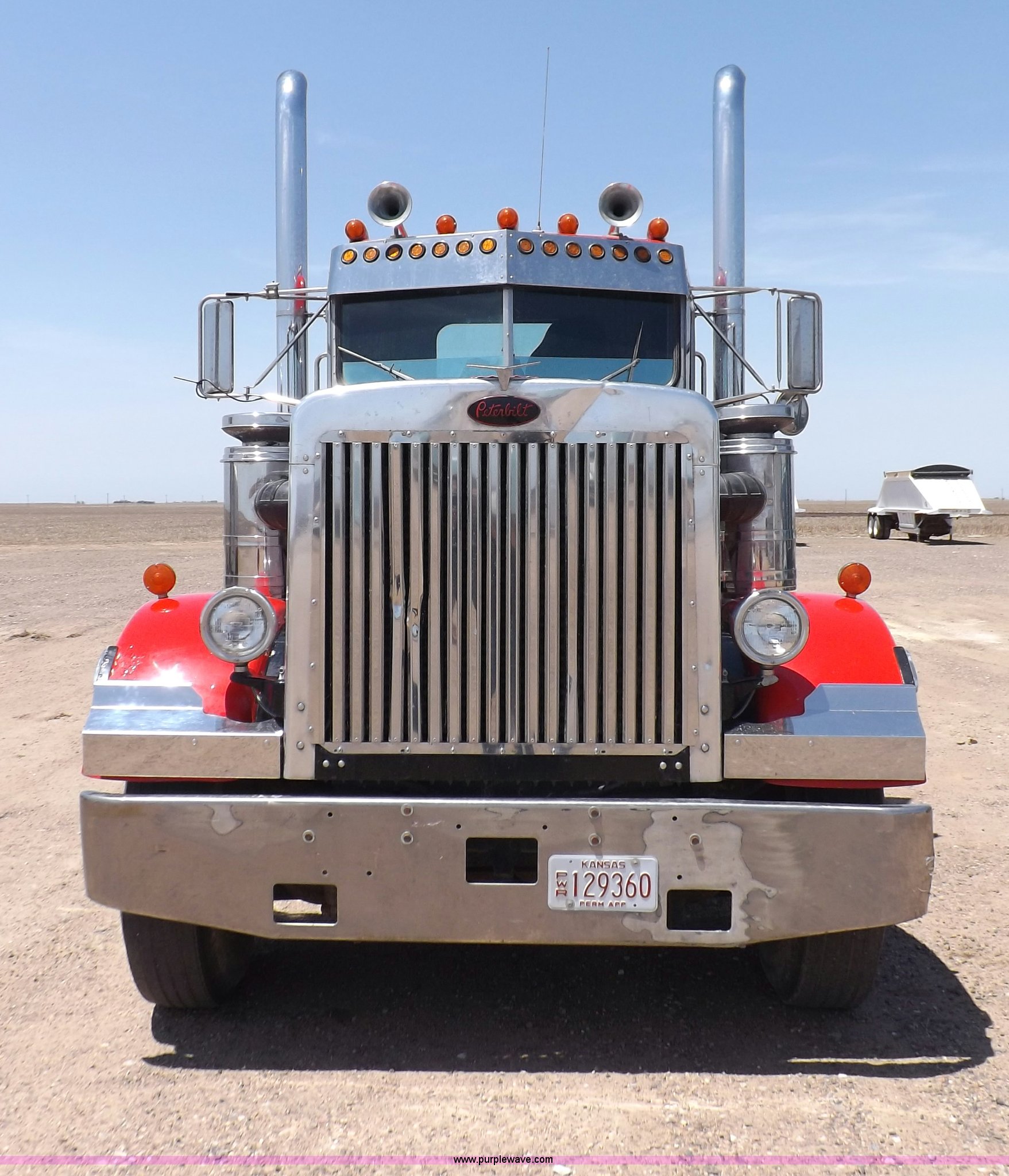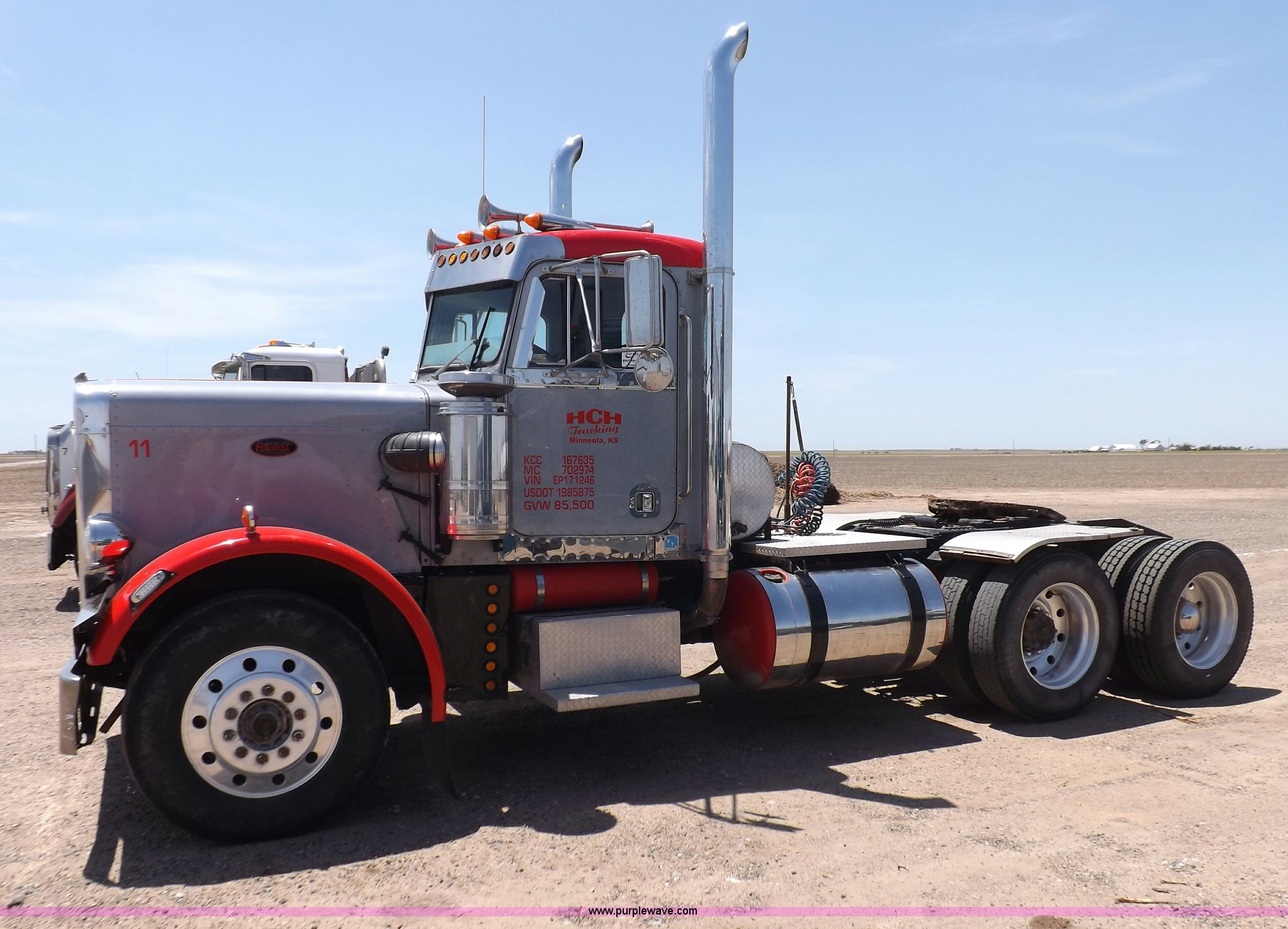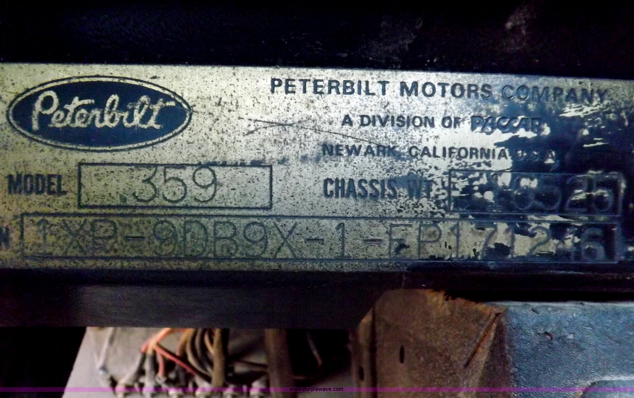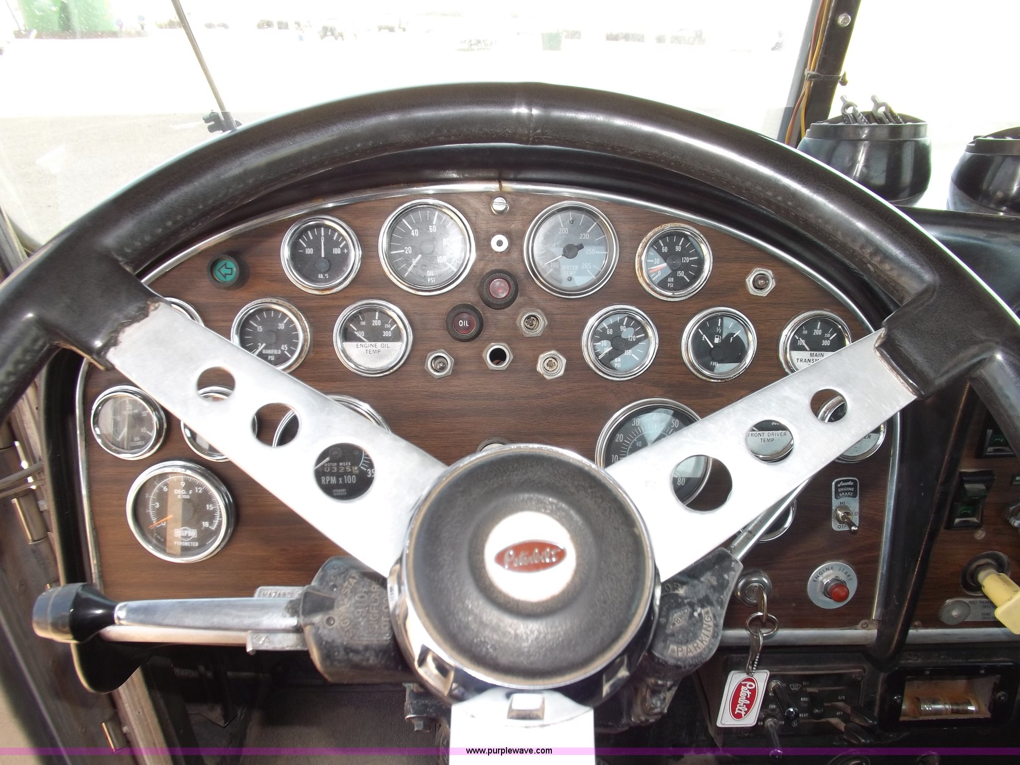 Purple Wave is selling a used Truck Tractor in Kansas. This item is a 1984 Peterbilt 359 semi truck with the following: 418,899 miles on odometer, Caterpillar 3406 14.6L L6 diesel engine, Eaton Fuller Low Range RTO 15 speed manual transmission, Twin screw, AC and heat, AM/FM, Air suspension seat, Heated mirrors, Throttle lock, Hydraulic wet kit tank, Exterior visor, Chrome bumper, Block heater, Air slide fifth wheel plate, Dual fuel tanks, Aluminum half fenders, Dual rear exhaust stacks, Aluminum deck plate, PTO, Wet kit, Dump valves, Air suspension, Air brakes, Brake controller, Jake brake, 228" wheelbase, Aluminum wheels, 285/75R24.5 tires