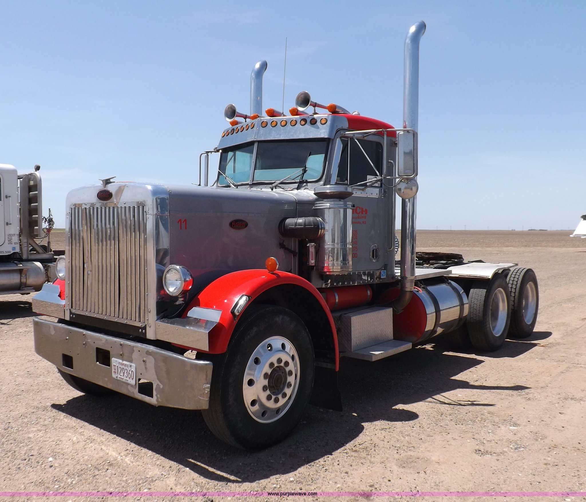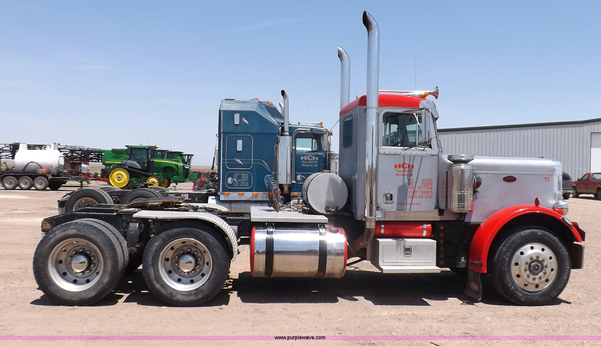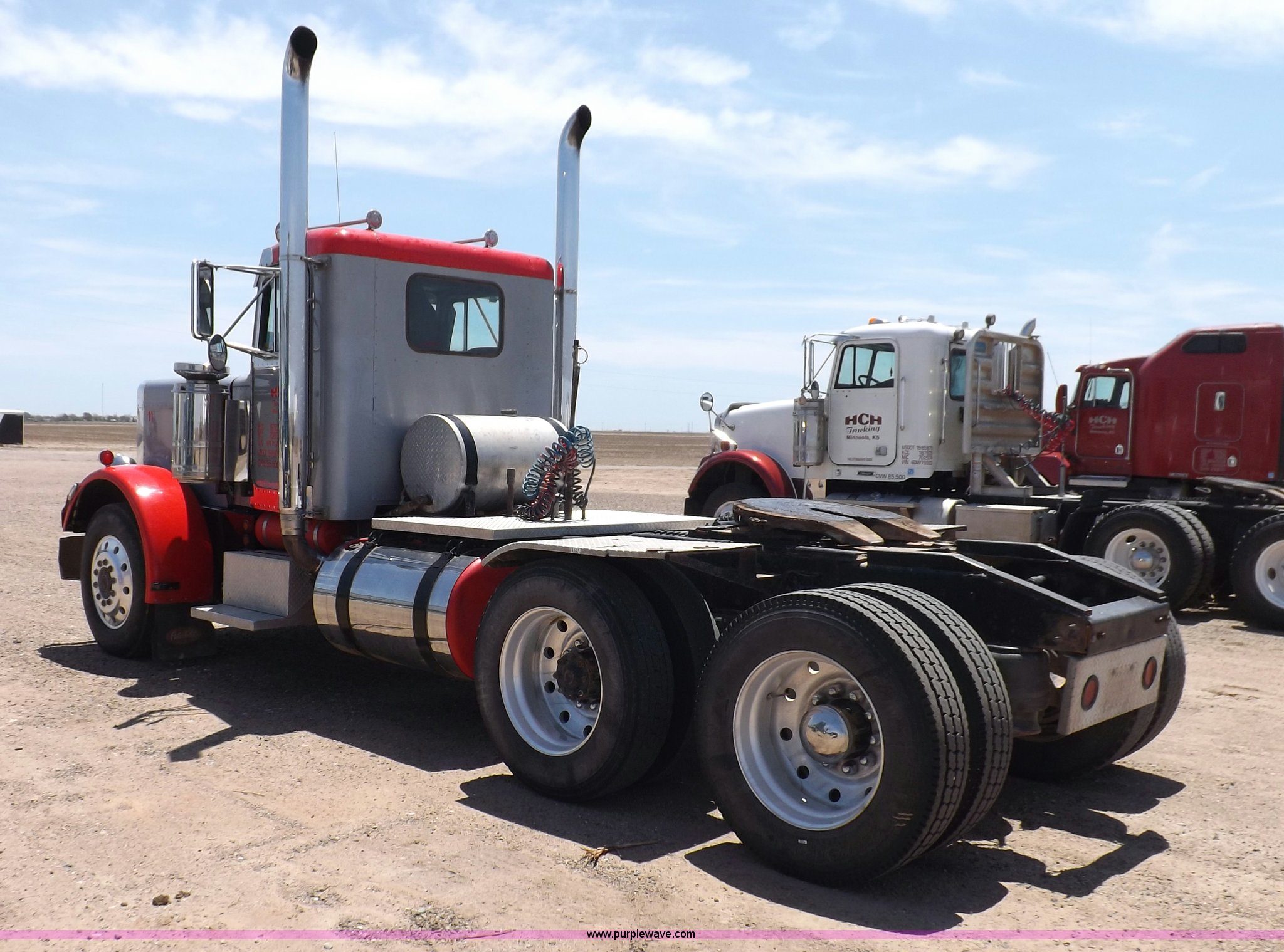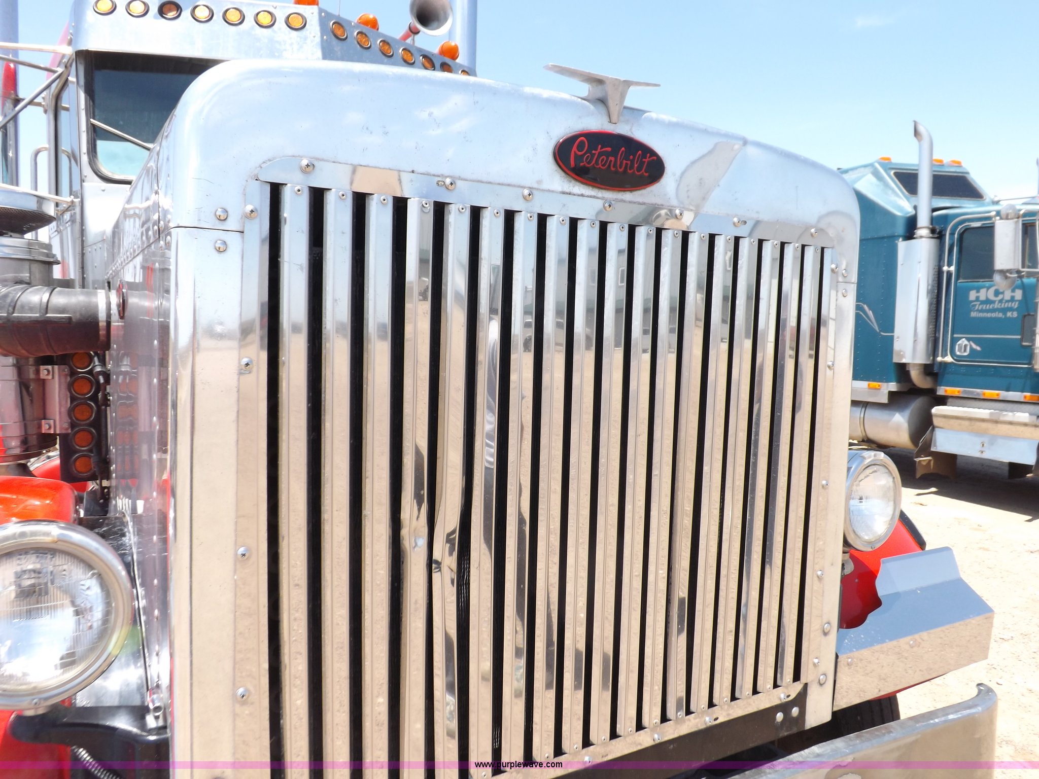 Purple Wave is selling a used Truck Tractor in Kansas. This item is a 1984 Peterbilt 359 semi truck with the following: 418,899 miles on odometer, Caterpillar 3406 14.6L L6 diesel engine, Eaton Fuller Low Range RTO 15 speed manual transmission, Twin screw, AC and heat, AM/FM, Air suspension seat, Heated mirrors, Throttle lock, Hydraulic wet kit tank, Exterior visor, Chrome bumper, Block heater, Air slide fifth wheel plate, Dual fuel tanks, Aluminum half fenders, Dual rear exhaust stacks, Aluminum deck plate, PTO, Wet kit, Dump valves, Air suspension, Air brakes, Brake controller, Jake brake, 228" wheelbase, Aluminum wheels, 285/75R24.5 tires