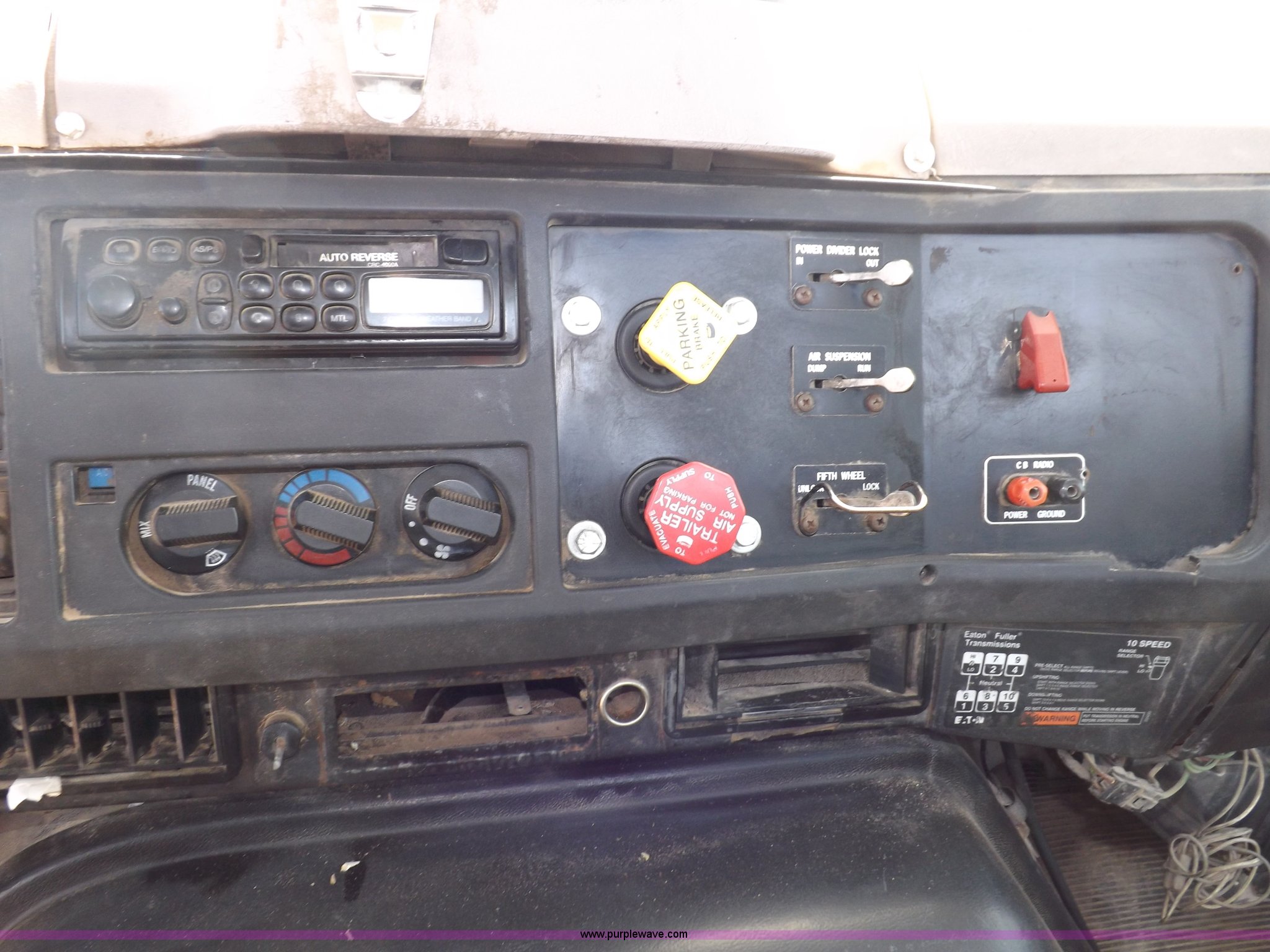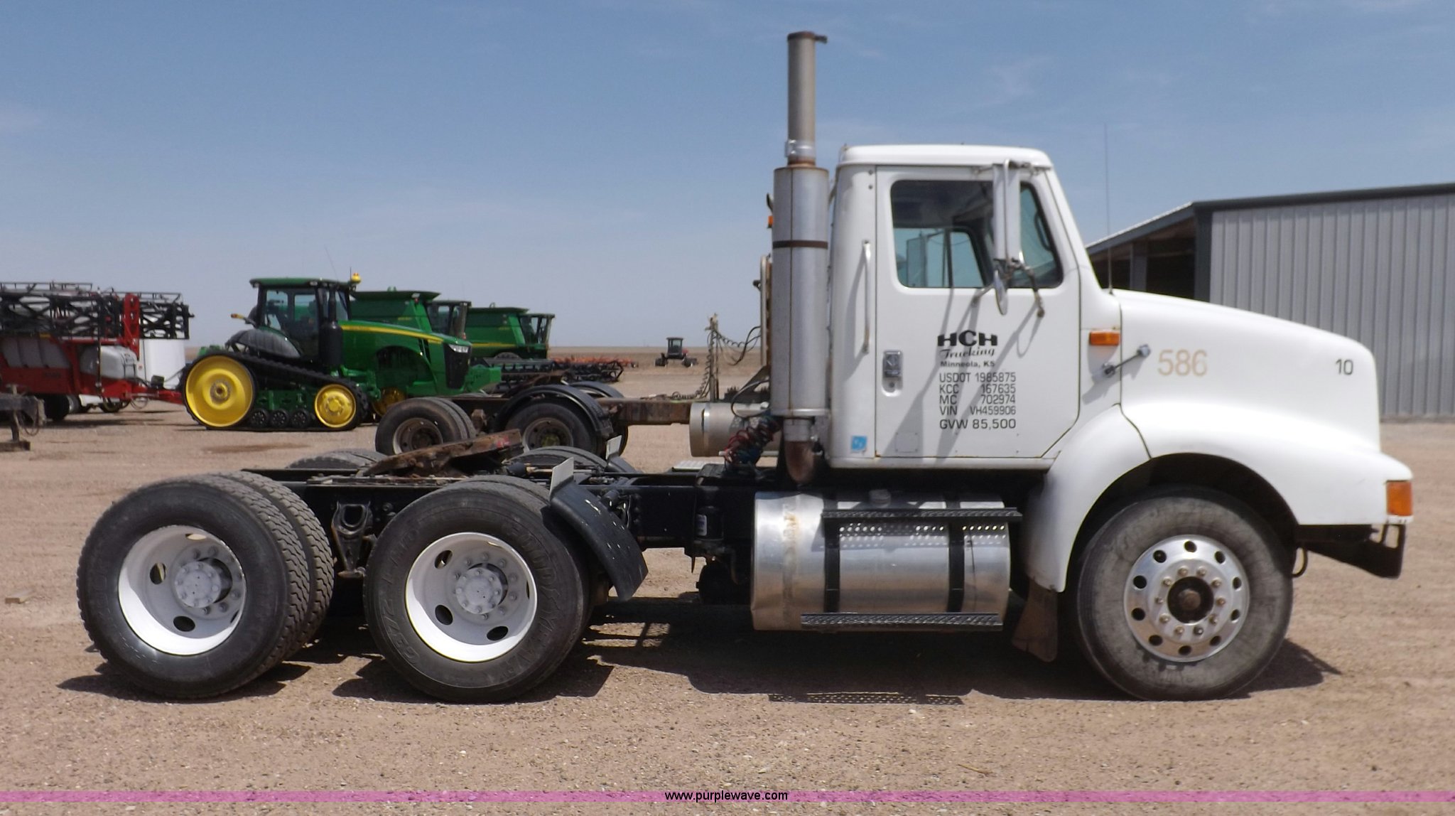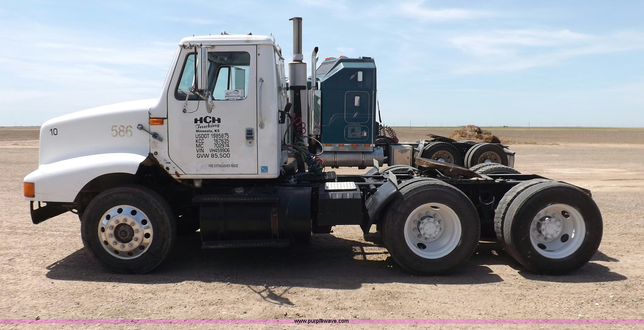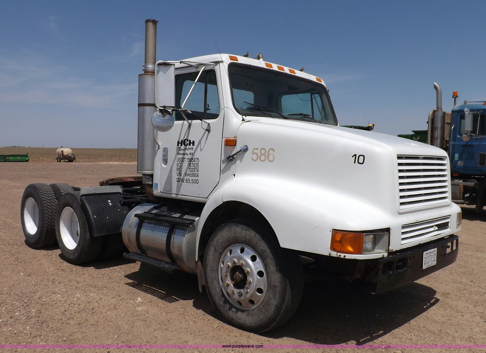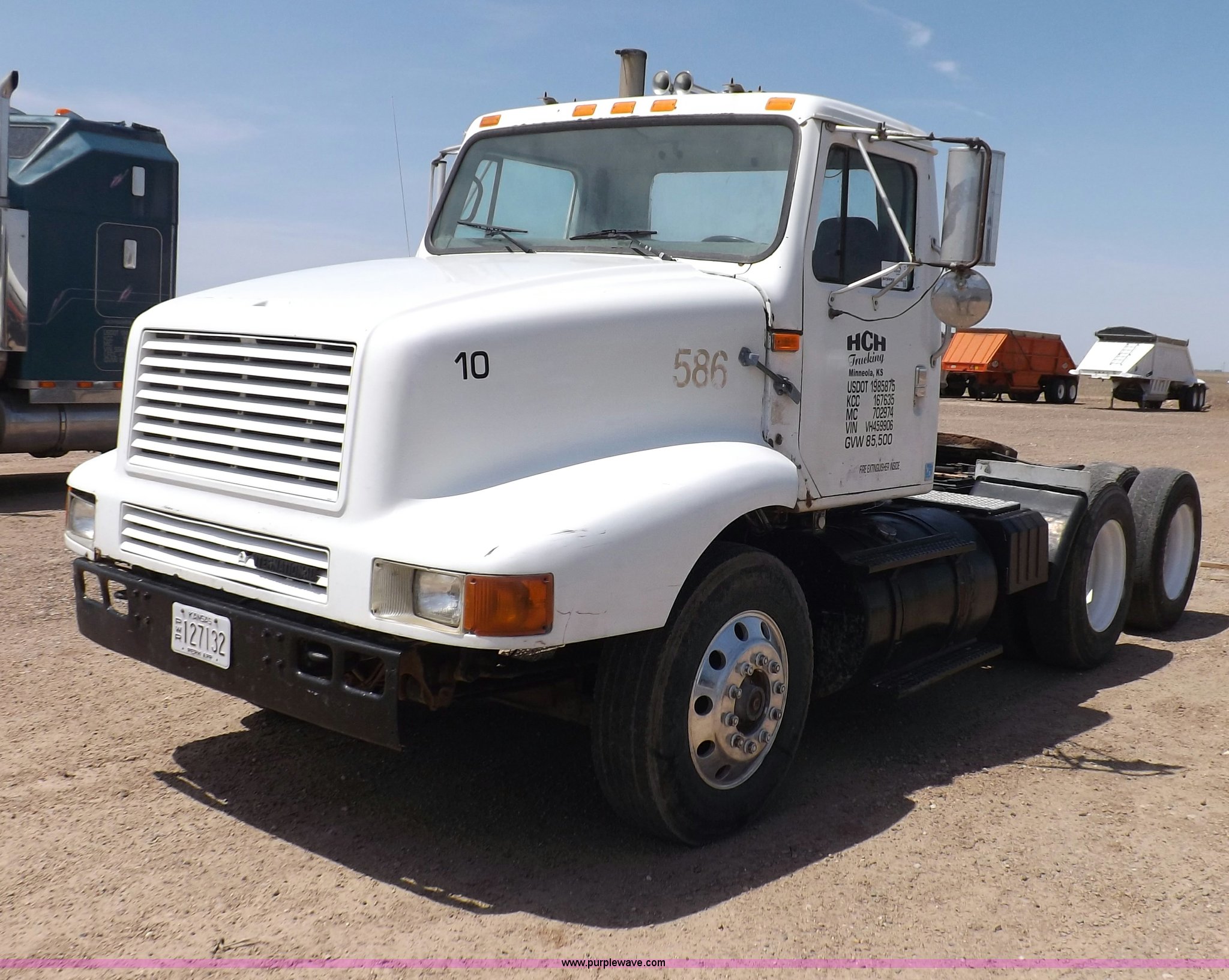 Purple Wave is selling a used Truck Tractor in Kansas. This item is a 1997 International 8200 semi truck with the following: 844,581 miles on odometer, Cummins N14 14.0L L6 diesel engine, Eaton fuller 10 speed manual transmission, Twin screw, AC and heat, Cruise, AM/FM/cassette, Air suspension seat, Heated mirrors, Block heater, Air slide fifth wheel plate, Dual 100 gallon fuel tanks, Poly quarter fenders, Single rear exhaust stack, Steel deck plate, Dump valves, Air suspension, Air brakes, Brake controller, 180" wheelbase, Aluminum front wheels, 295/75R22.5 tires, GVWR 52,000 lbs, FAWR 12,000 lbs, IAWR 20,000 lbs, RAWR 20,000 lbs, Recently replaced clutch