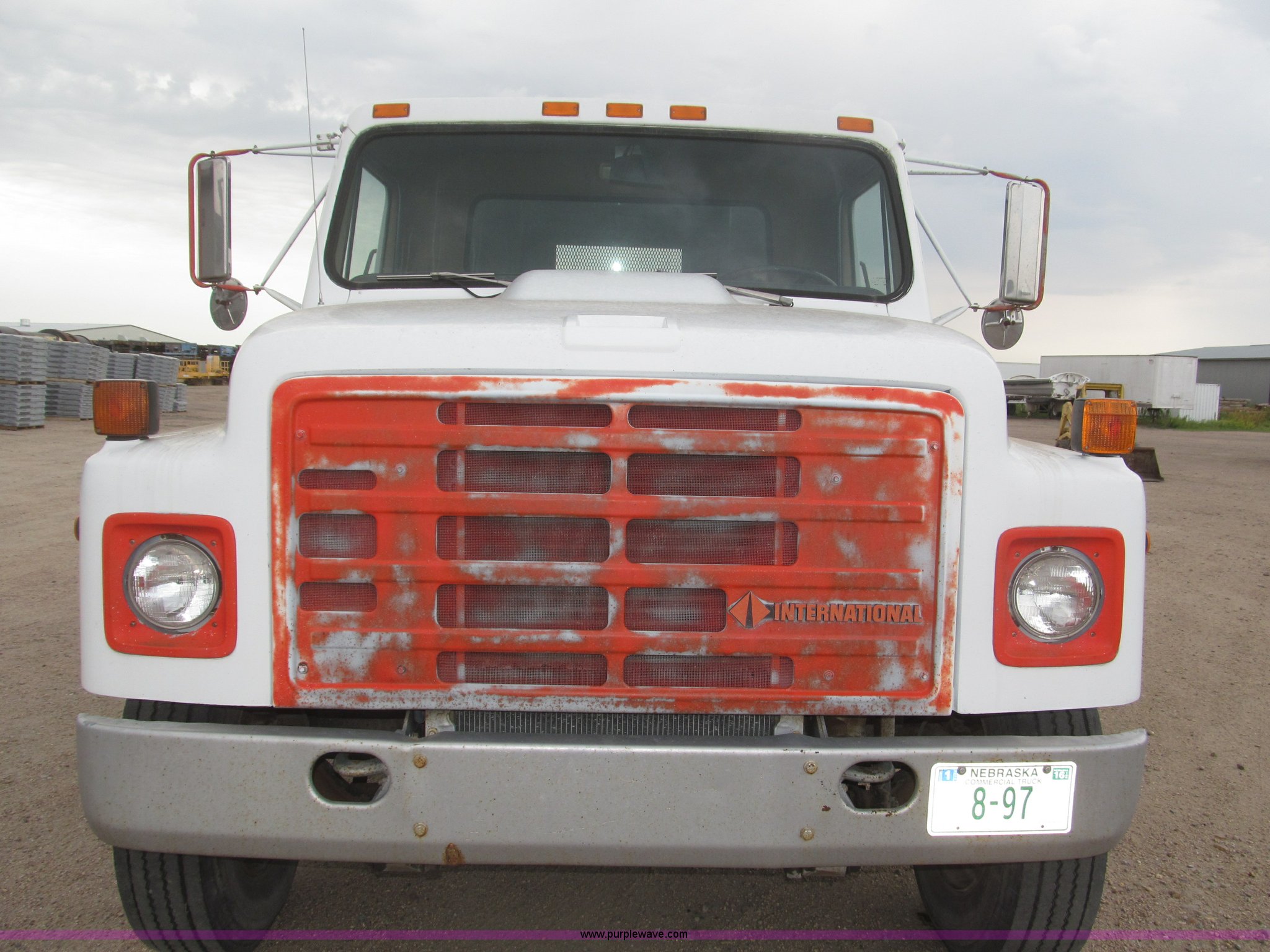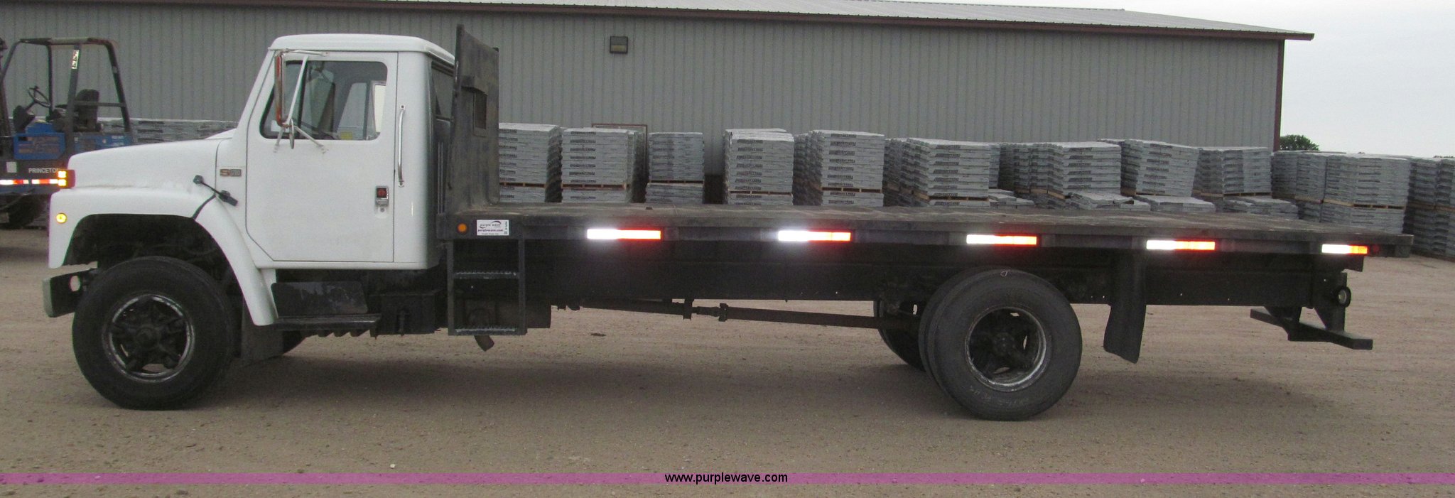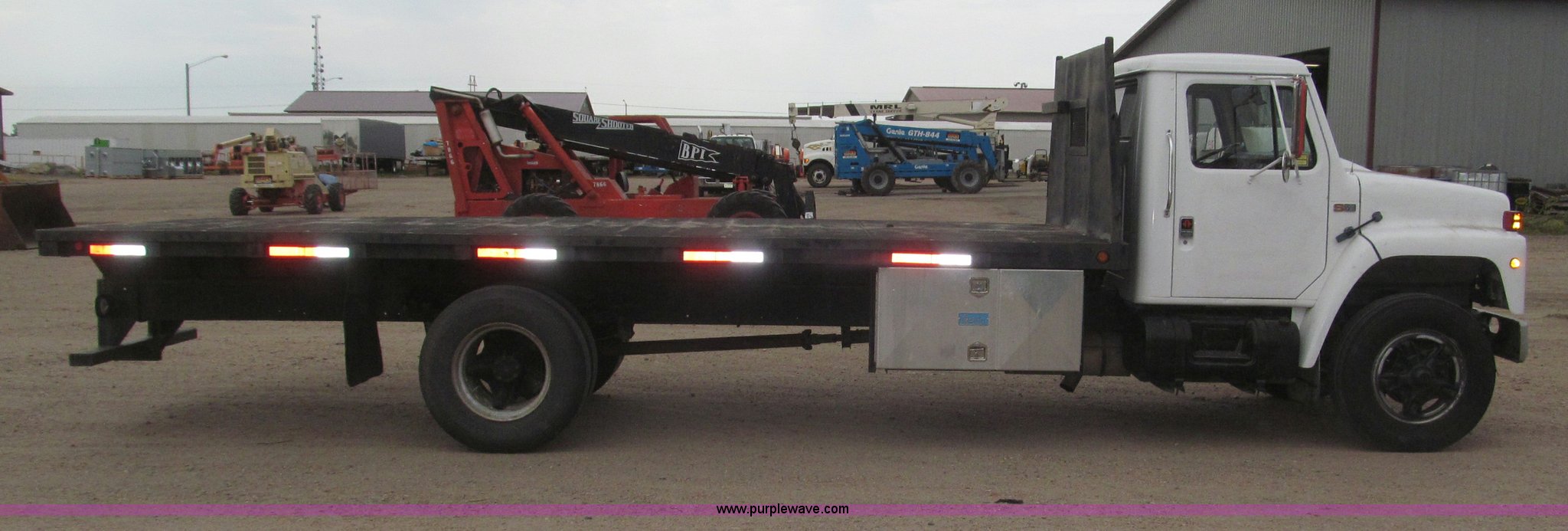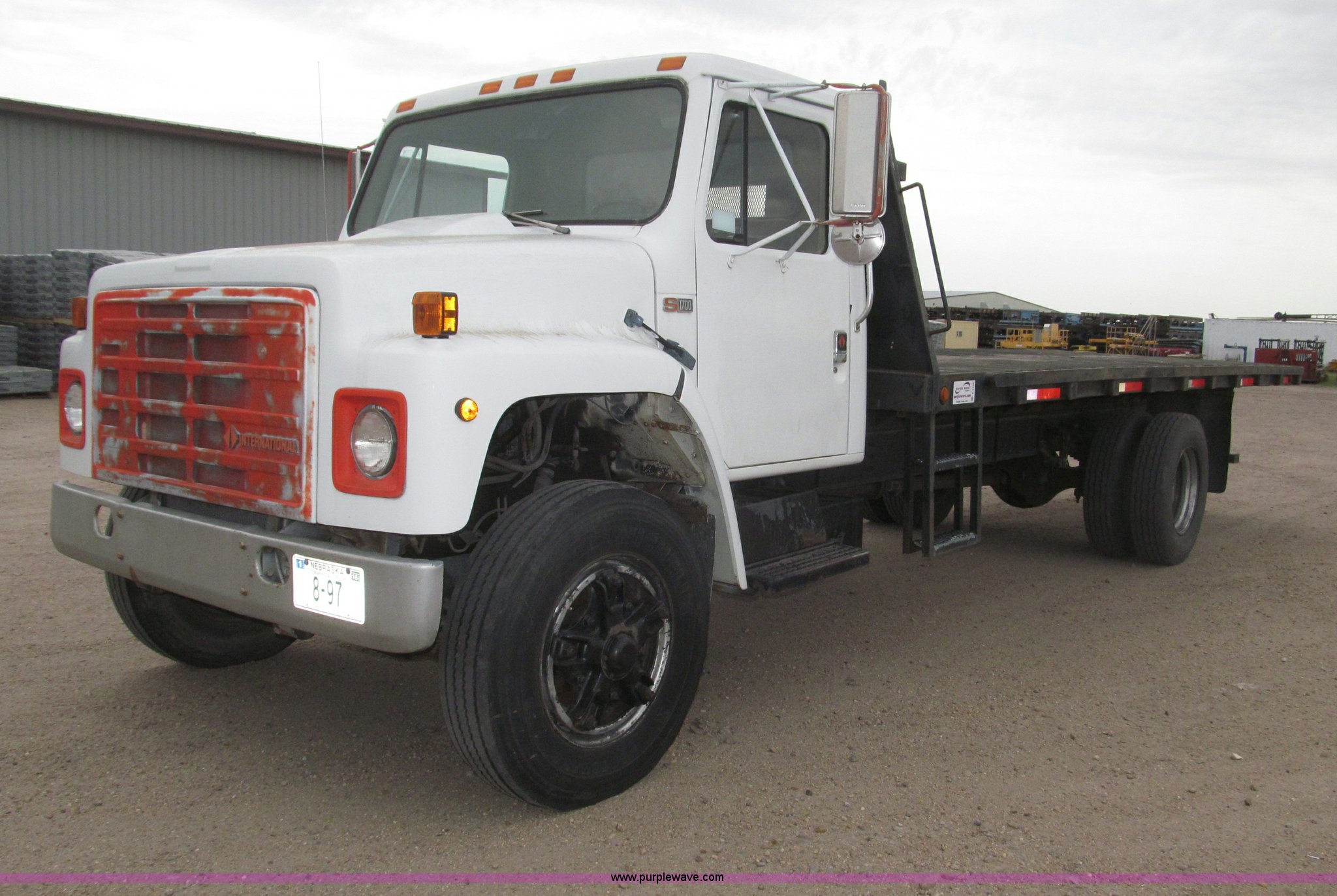 Purple Wave is selling a used Flat Bed Truck in Nebraska. This item is a 1988 International 1754 flatbed truck with the following: 397,909 miles on odometer, International DT360 5.9L L6 diesel engine, 10 speed manual transmission, Two speed rear end, Heat, Manual windows and locks, Suspension seat, Manual adjustment, Vinyl interior, 20'10"L x 97.5"W x 51.25"H flatbed, Stake pockets, Rub rails, 4'H headache rack, Chain hanger, Window, Under bed toolbox, Drivers side bed ladder, Front tow hooks, Fire extinguisher, Mud flaps, Receiver hitch, Trailer wiring, 10R22.5 tires, GVWR 26,500 lbs, FAWR 9,000 lbs, RAWR 17,500 lbs, Cracked dash