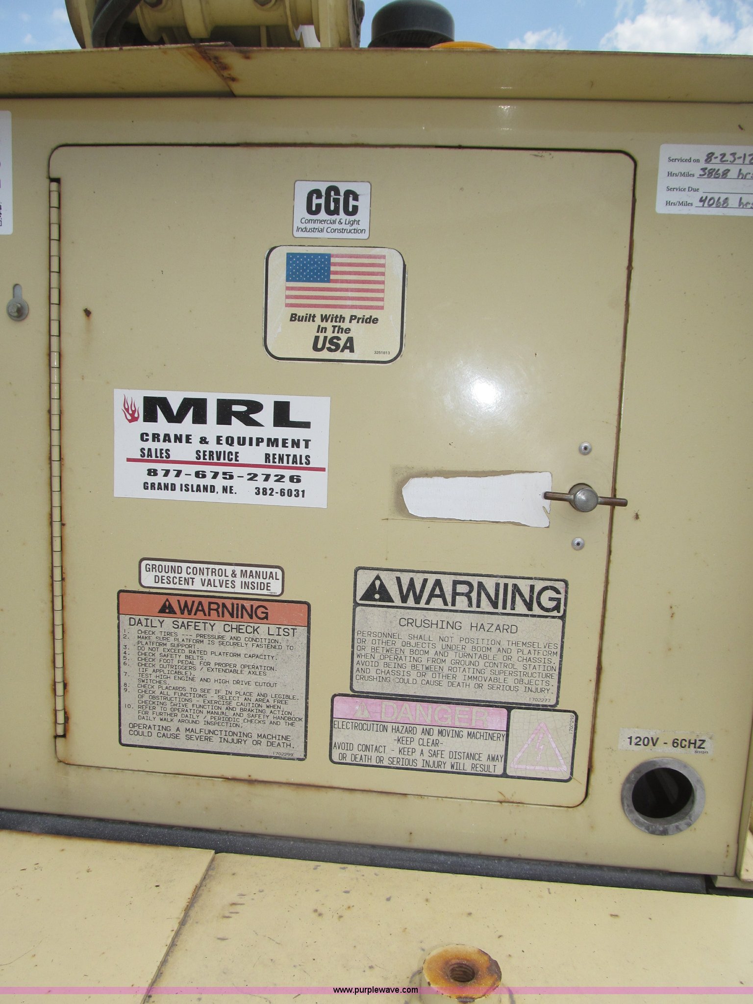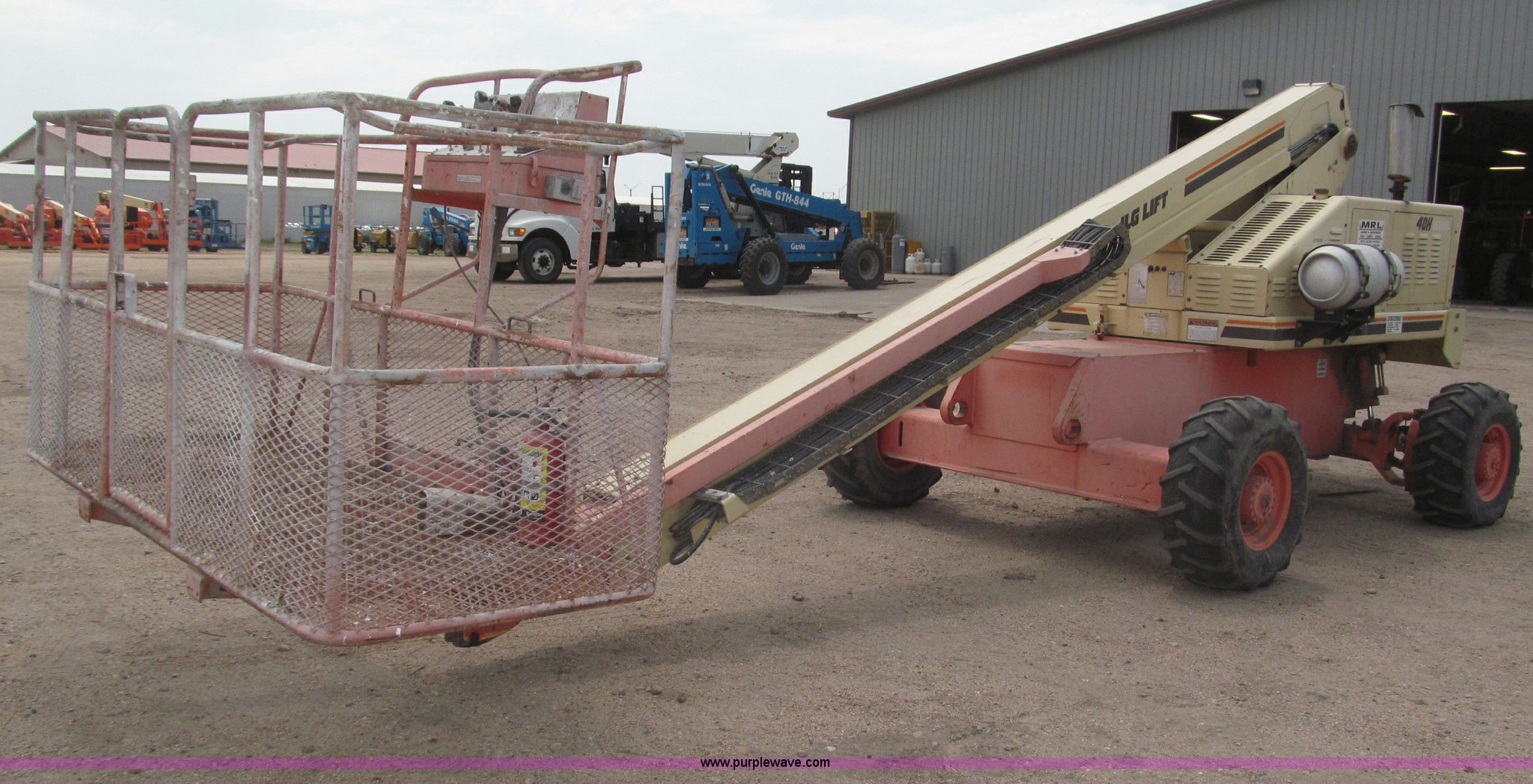 1999 JLG 40H telescoping boom lift. 3,937 hours on meter, Ford four cylinder propane or gas engine Model LRG-4251-6005-A, Serial 01875-1-02-99, Hydrostatic transmission, Four wheel drive, Straight stick boom, 40' max platform lift height, Approx. 33' max horizontal reach, (2) boom sections, 12V electrical system, Engine and hydraulic access doors on both sides, 3,200 max hydraulic operating pressure, 40 percent grade-ability , 1,000 lb max capacity, 500 lb unrestricted lift capacity, 8' basket, Auxiliary power controls, Manual emergency lowering controls, Platform and ground controls, Foot operated safety pedal, Motion alarm and amber beacon Inoperable, Propane bottle included, Fire extinguisher , Oscillating axle, 12.5L-15 pneumatic tires, Operator, safety, and ANSI manual in box, Load chart, Paint over spray, Serial 0927160300042069. View equipment video. Shipping quotes available. MRL Crane Inc.. 4331 Juergen Rd. Grand Island, NE 68801