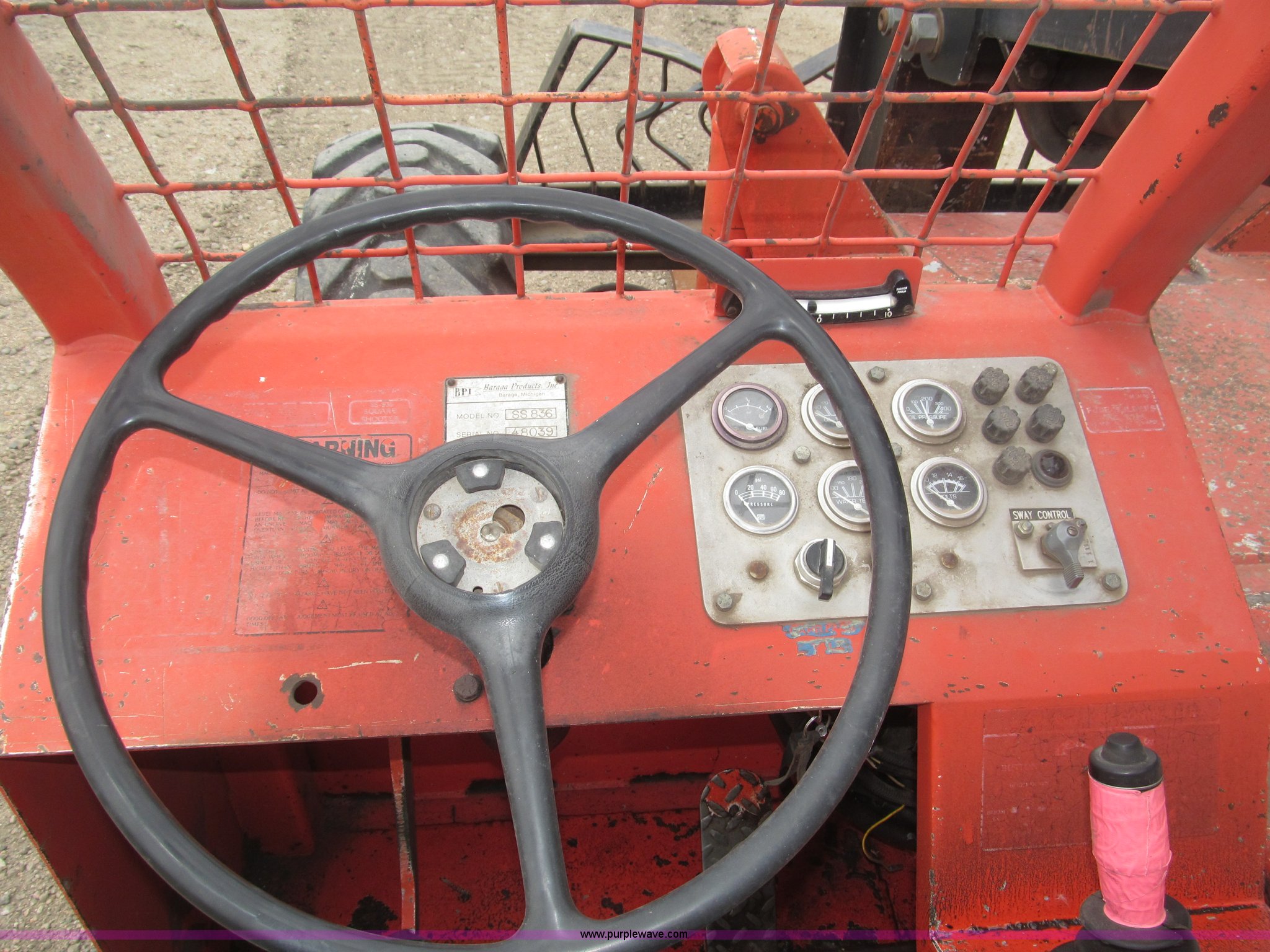 Purple Wave is selling a used Telehandler in Nebraska. This item is a BPI SS836 Square Shooter telehandler with the following: 916 hours on meter, John Deere four cylinder diesel engine, 3F-3R gears, Four wheel steer, Crab steer, OROPS, 8,000 lbs lift capacity, 36' max height, (3) boom sections, 48"L forks, 73.5"W x 45"H carriage, Tilt carriage, Hydraulic leveling, Manual left hand brake, 13.00-24TG foam-filled tires, 12 ply, Front carriage damage, Chain off for boom extension carriage position, Hydraulic leak, Rear cover plate on boom missing, Tires show cuts, No seat belt or manual, Load chart worn off, unreadable, Serial 48039