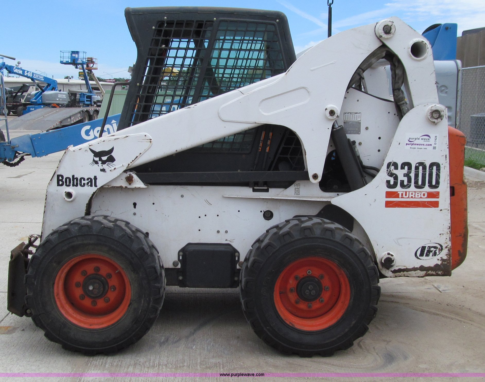 Purple Wave is selling a used Skid Steer Loader in Iowa. This item is a 2002 Bobcat S300 skid steer with the following: 2,201 hours on meter, Kubota four cylinder turbo diesel engine, Two speed transmission, Cab, Door missing, Heat, Interlock control system, Auxiliary hydraulics, 305/70D16.5 NHS tires, No bucket, Serial 521512227