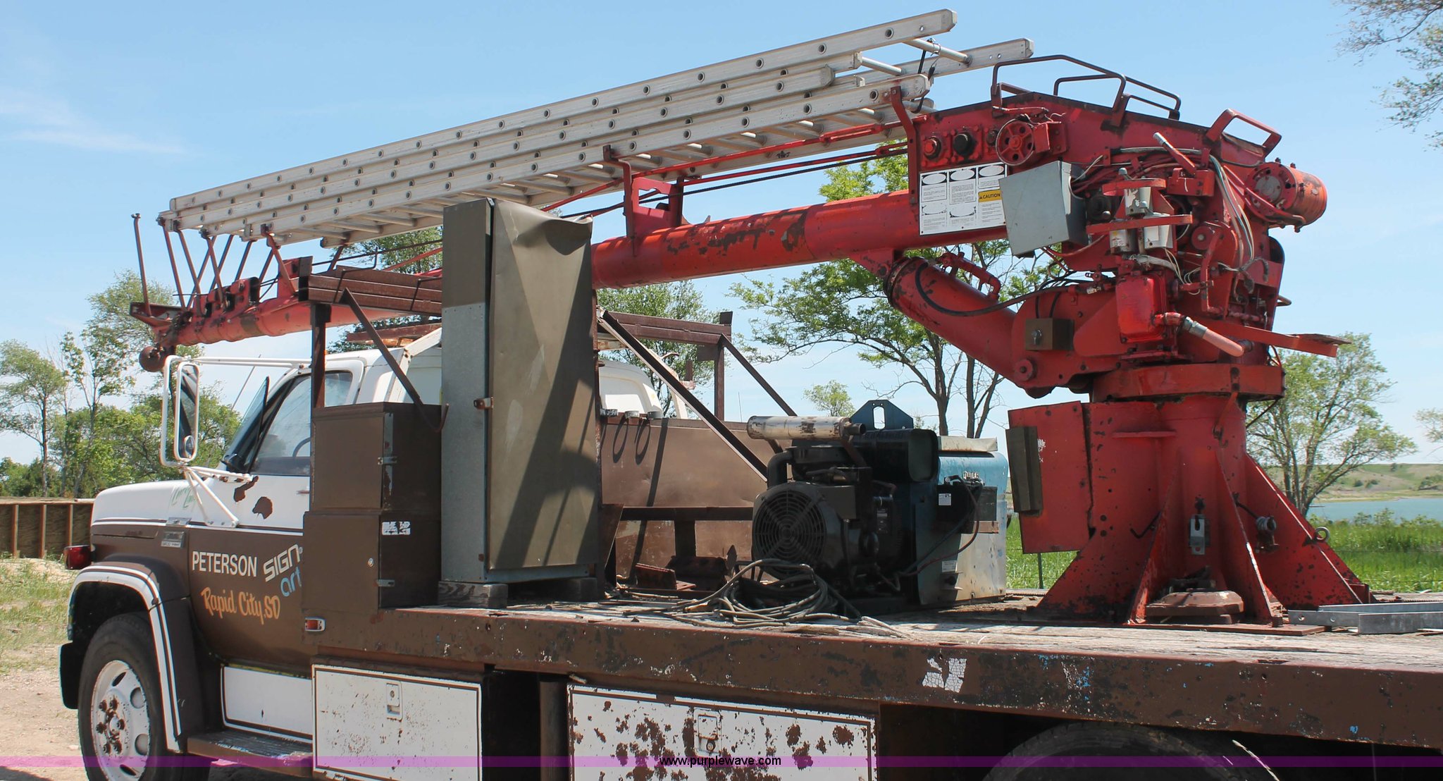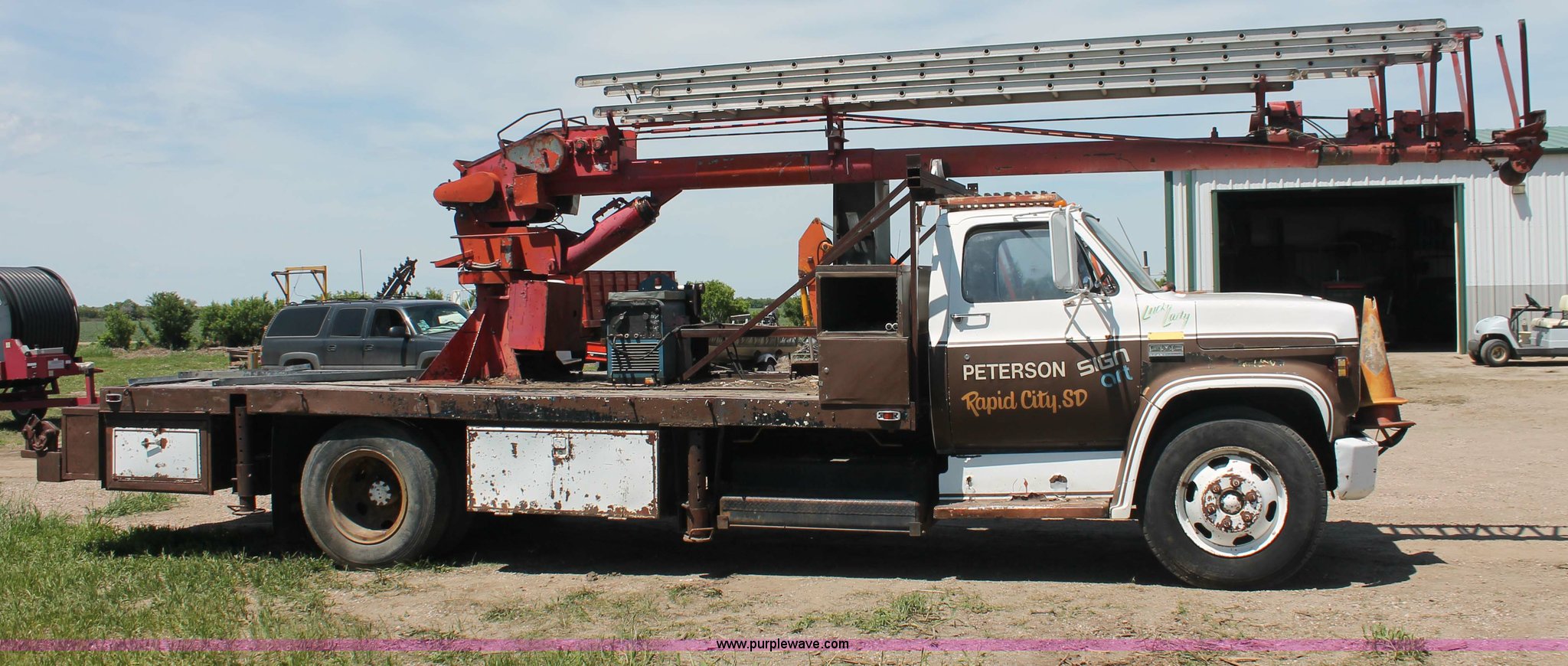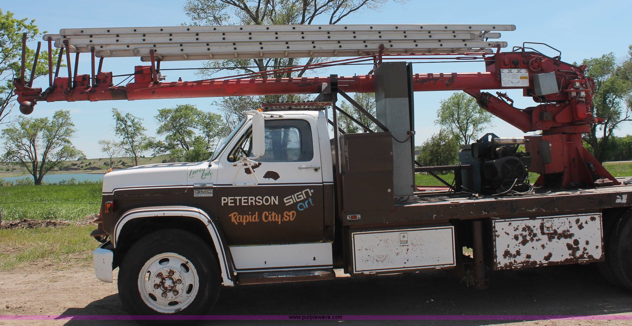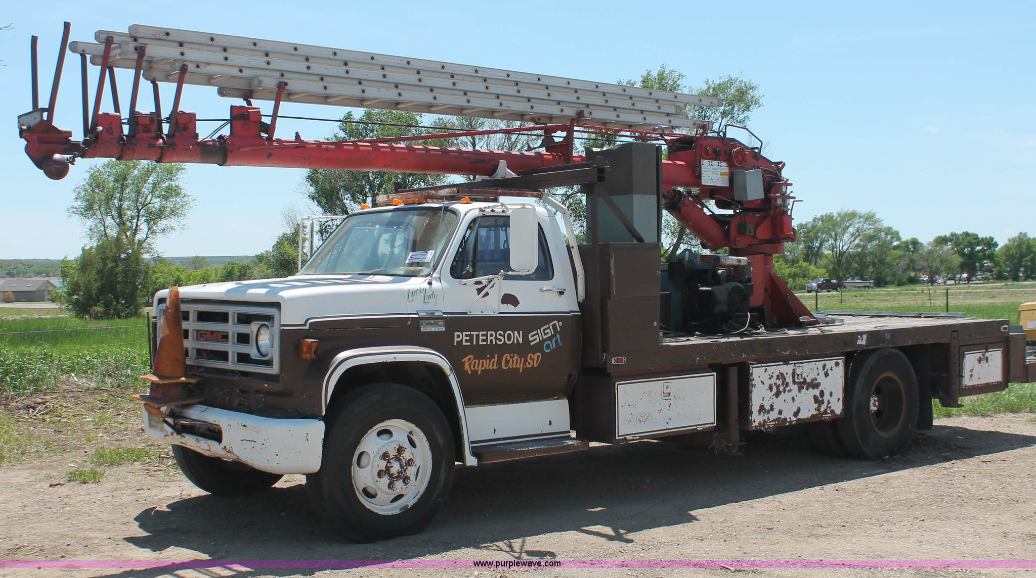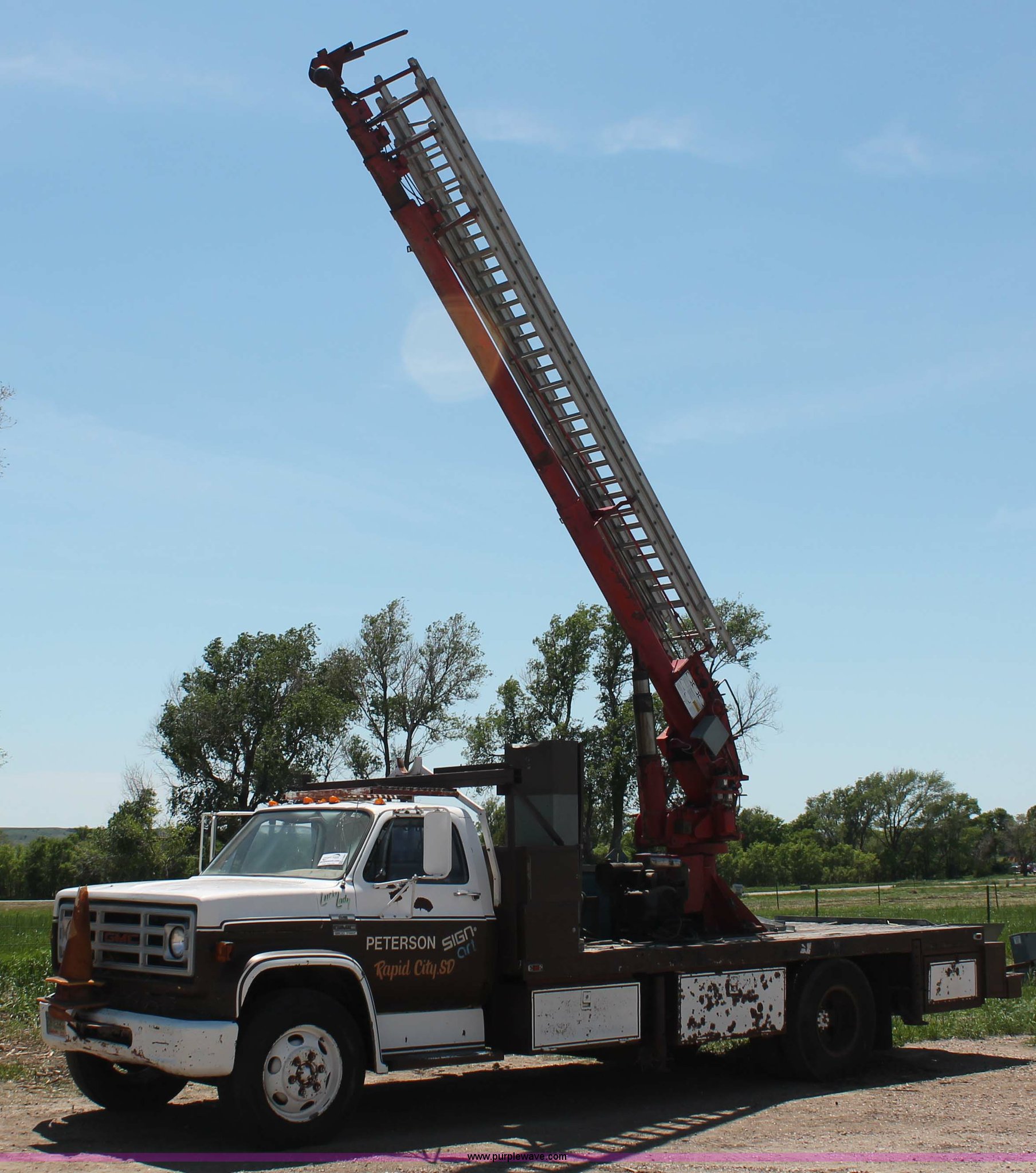 Purple Wave is selling a used Crane Truck in South Dakota. This item is a 1977 GMC Sierra 6500 flatbed ladder/boom truck with the following: 38,594 miles on odometer, Eight cylinder diesel engine, Five speed manual transmission, Manual windows and locks, Vinyl interior, 16' flatbed, (10) storage compartments, Angle iron chopper, Stake side pockets, Miller AEAD-200LE welder/generator, Onan B48M engine, 72 max weld OVC, 25 rated volts, 120/240V, (3) outlets, Serial JF910935, Baldwin Ward Skyhook crane, 80' max extension, Four stage room, 5,000 lbs max lift capacity, Four stick operation, Boom ladder, Manual outriggers, 360 degree rotation, Serial 80199261,, Receiver hitch, 2 5/16" ball, 10R22.5 tires, Operational, requires work to be highway ready, Missing driver's window handle, Interior cosmetic damage, Cracked glass