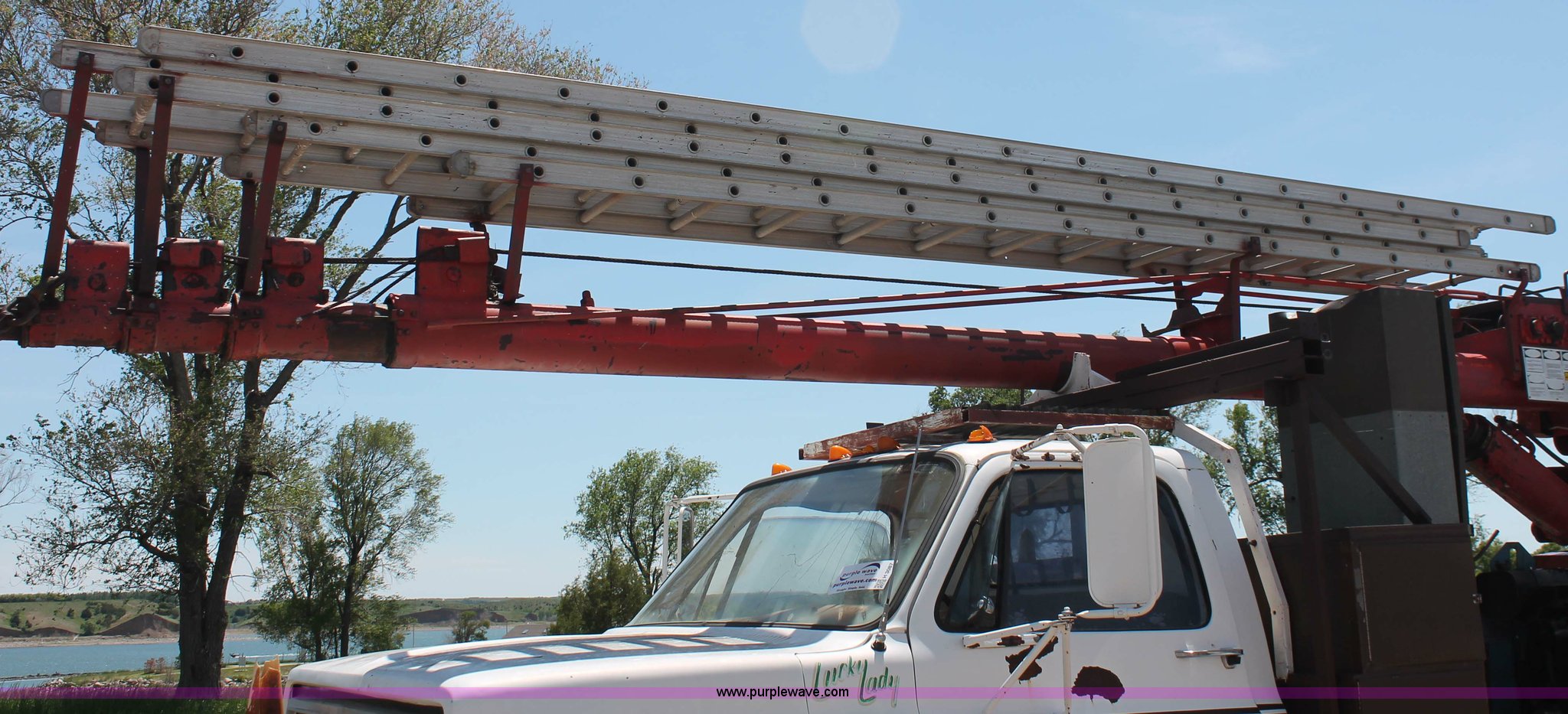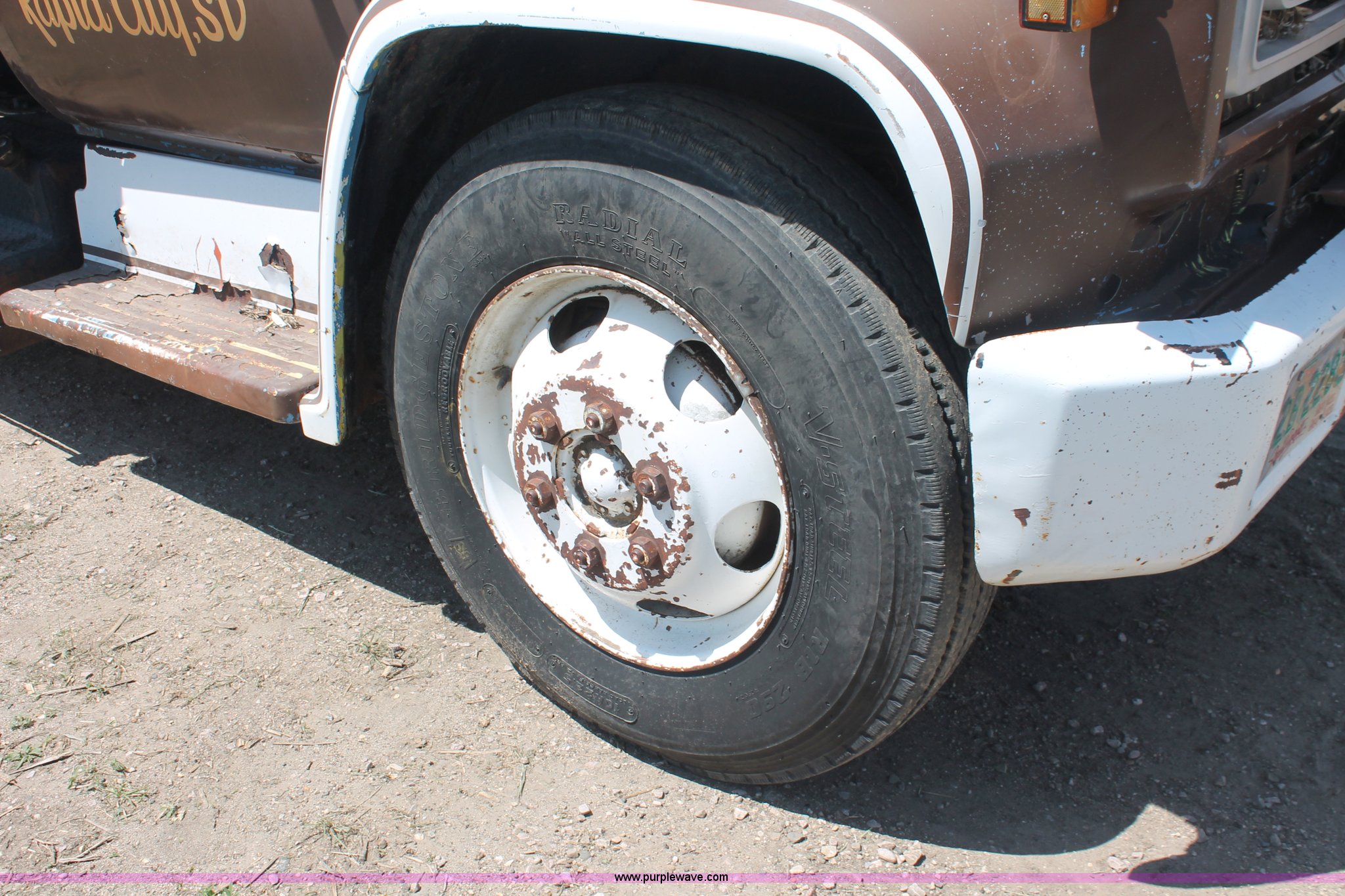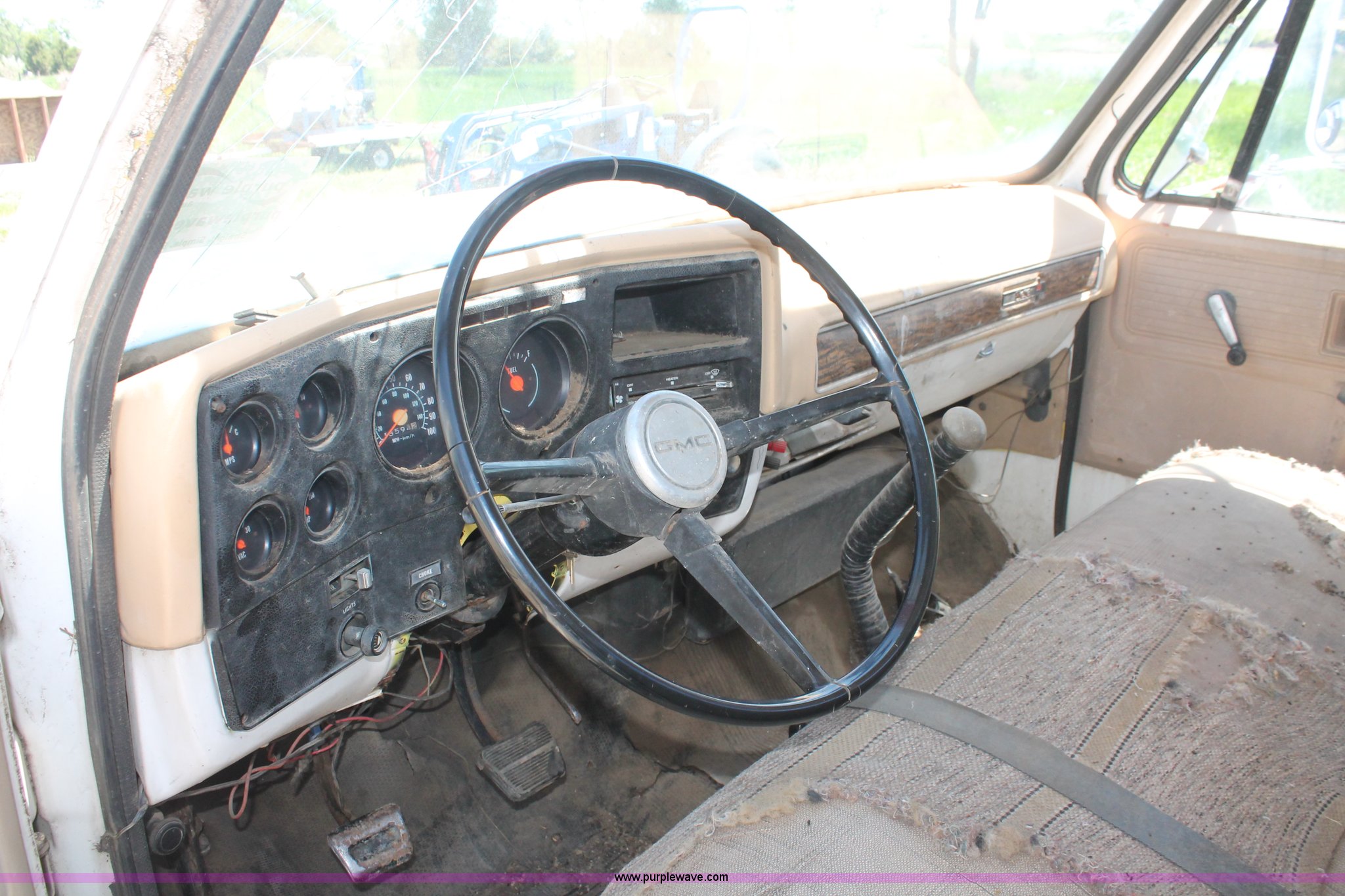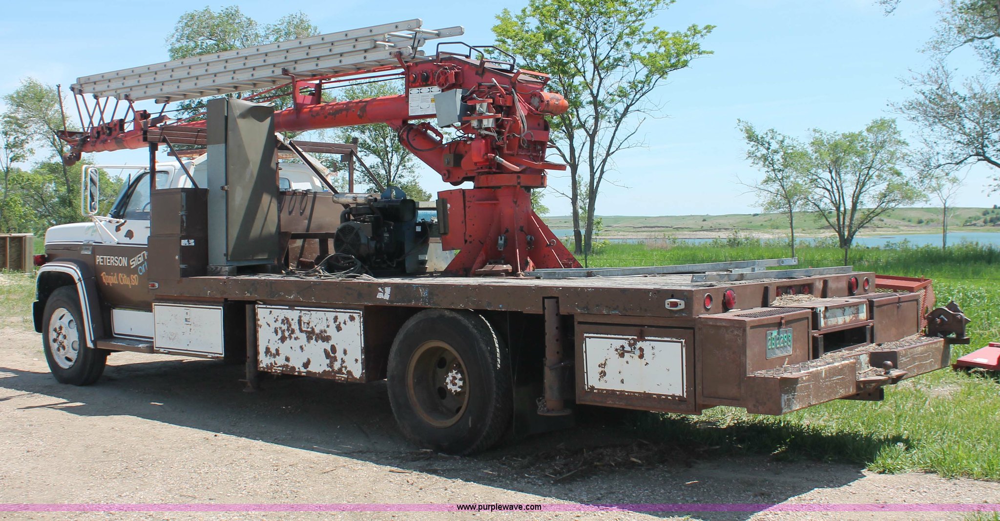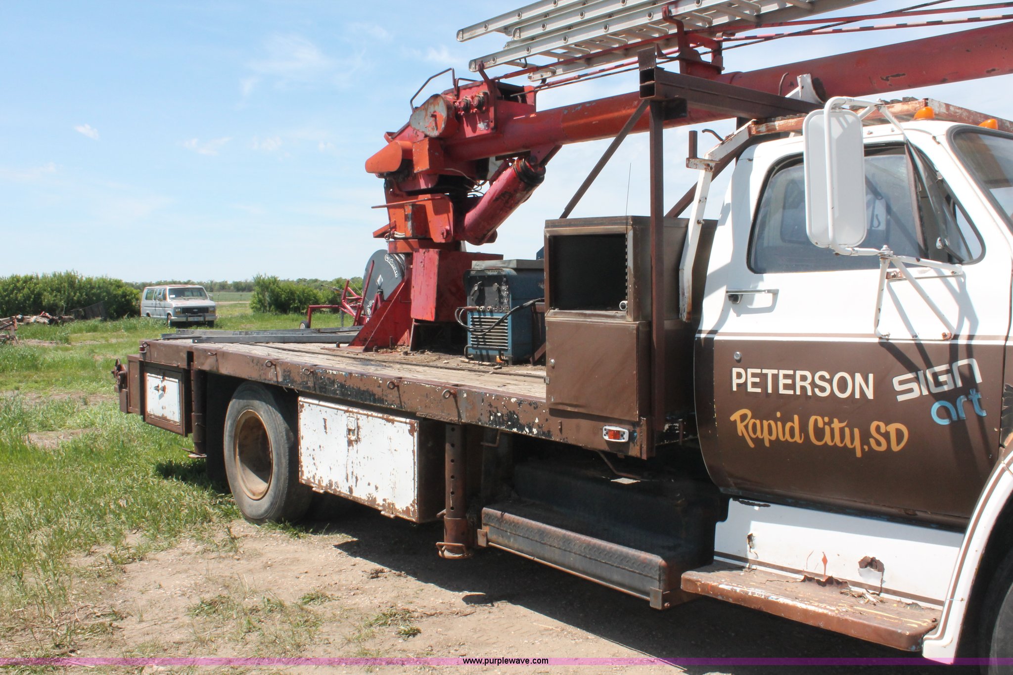 Purple Wave is selling a used Crane Truck in South Dakota. This item is a 1977 GMC Sierra 6500 flatbed ladder/boom truck with the following: 38,594 miles on odometer, Eight cylinder diesel engine, Five speed manual transmission, Manual windows and locks, Vinyl interior, 16' flatbed, (10) storage compartments, Angle iron chopper, Stake side pockets, Miller AEAD-200LE welder/generator, Onan B48M engine, 72 max weld OVC, 25 rated volts, 120/240V, (3) outlets, Serial JF910935, Baldwin Ward Skyhook crane, 80' max extension, Four stage room, 5,000 lbs max lift capacity, Four stick operation, Boom ladder, Manual outriggers, 360 degree rotation, Serial 80199261,, Receiver hitch, 2 5/16" ball, 10R22.5 tires, Operational, requires work to be highway ready, Missing driver's window handle, Interior cosmetic damage, Cracked glass