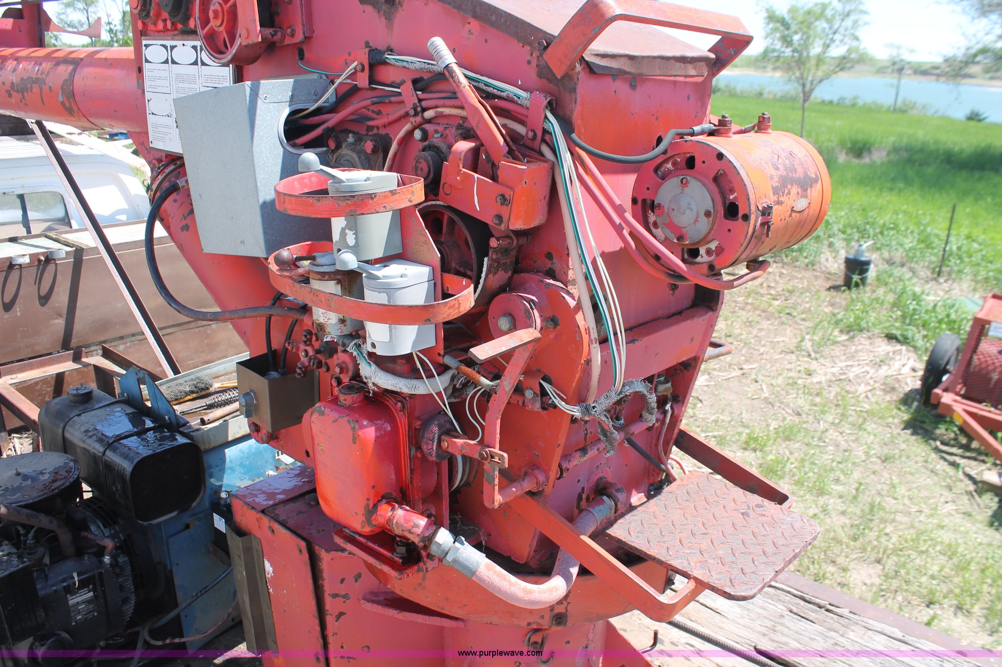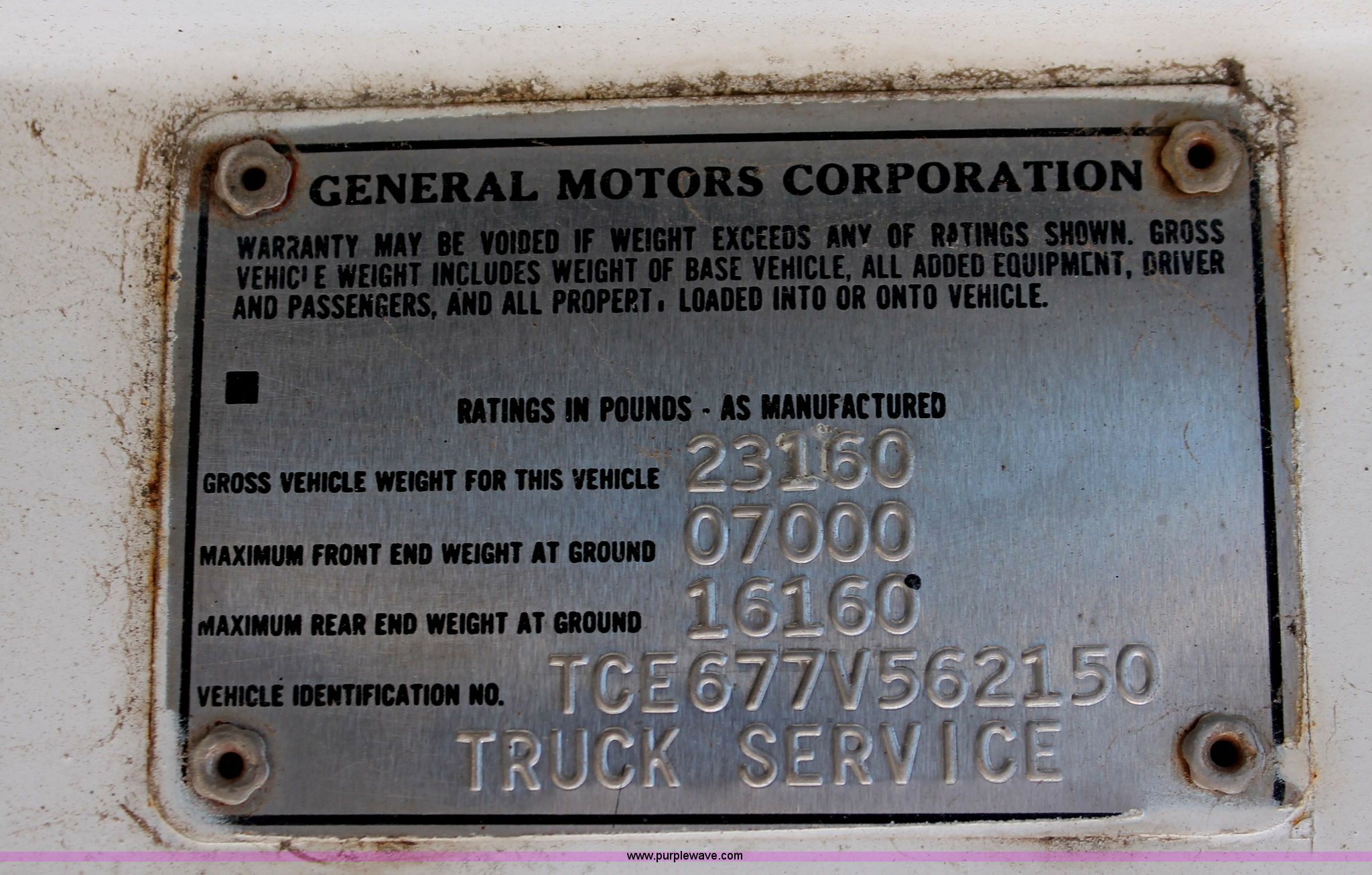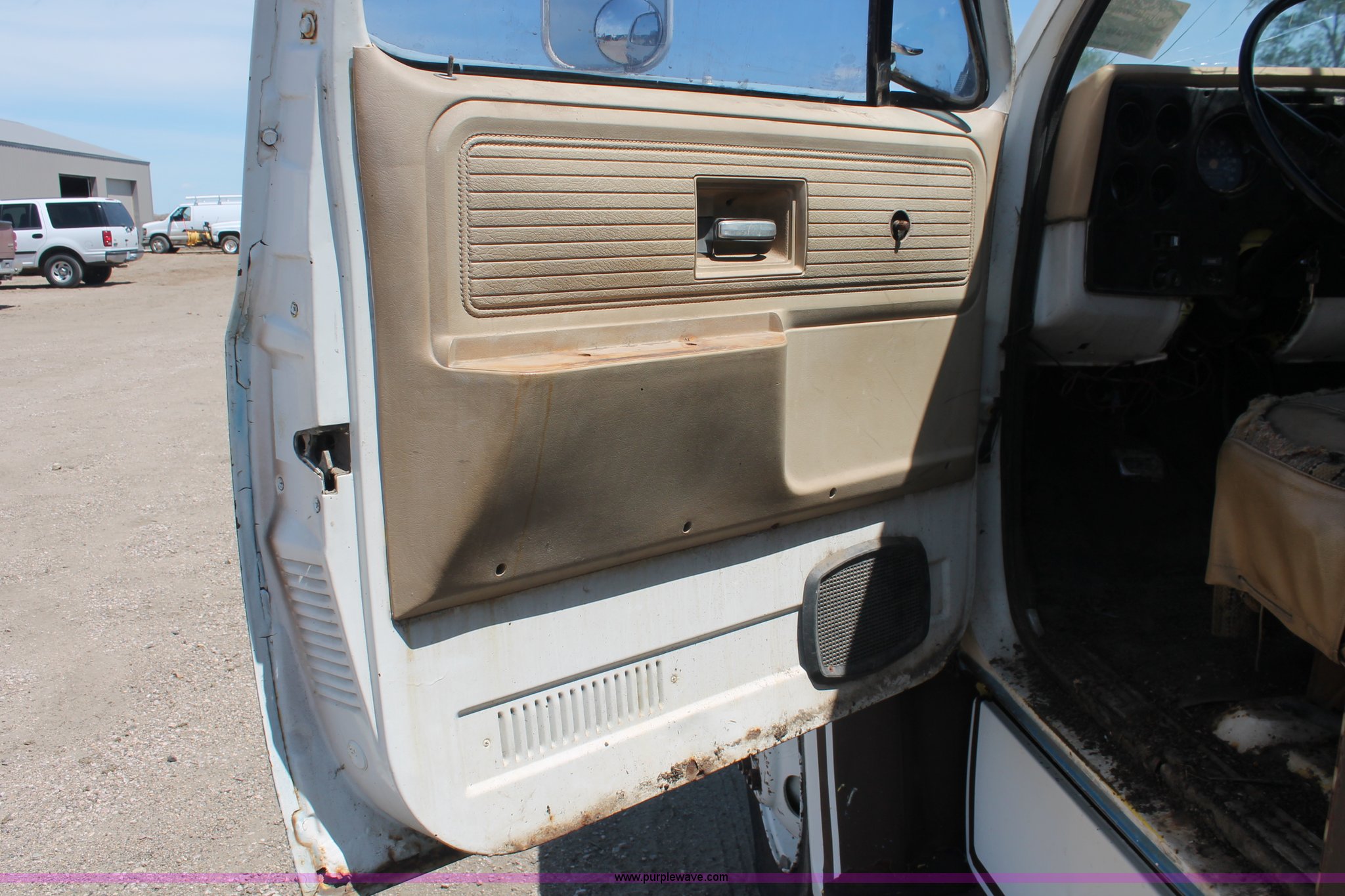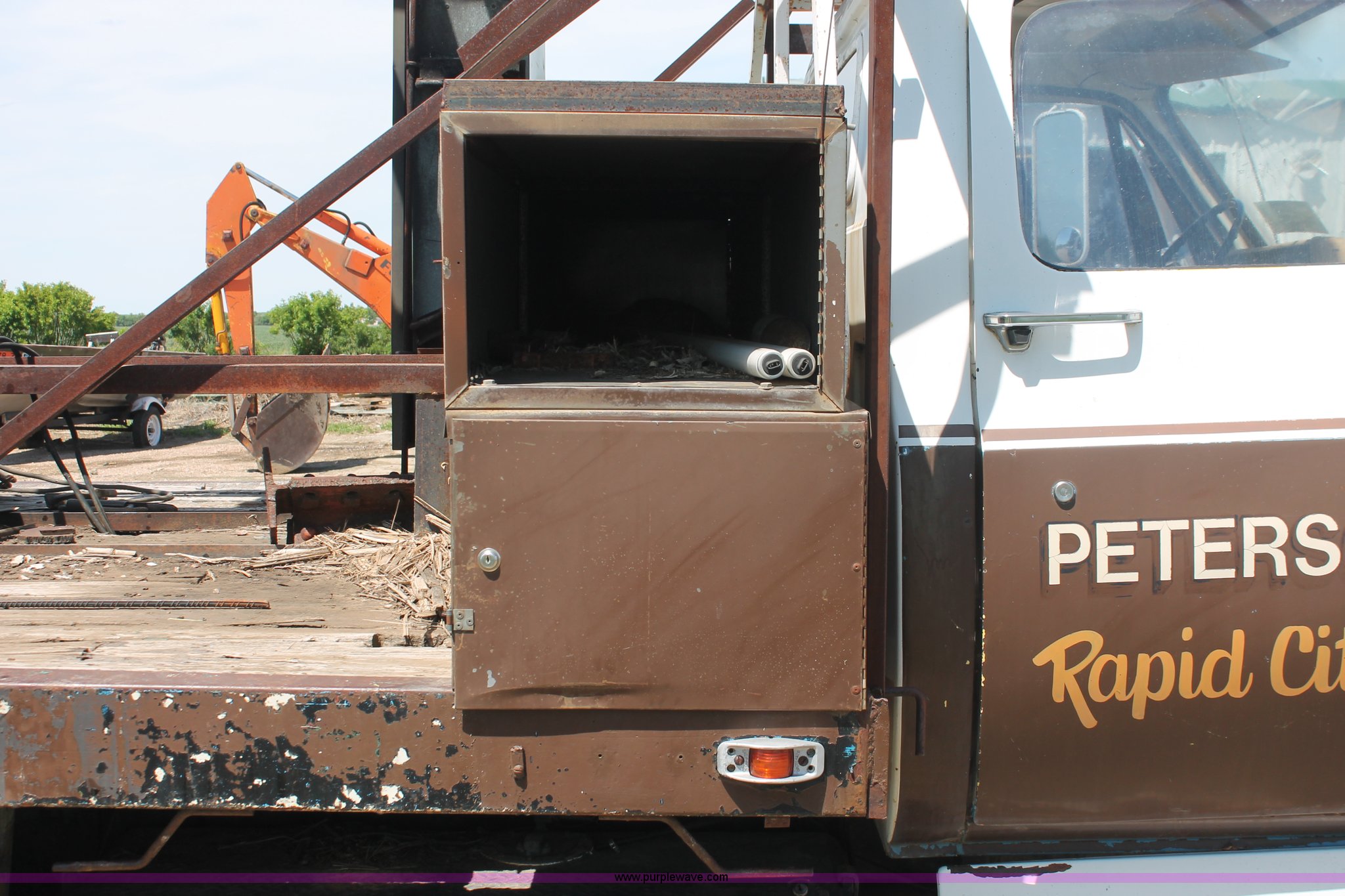 Purple Wave is selling a used Crane Truck in South Dakota. This item is a 1977 GMC Sierra 6500 flatbed ladder/boom truck with the following: 38,594 miles on odometer, Eight cylinder diesel engine, Five speed manual transmission, Manual windows and locks, Vinyl interior, 16' flatbed, (10) storage compartments, Angle iron chopper, Stake side pockets, Miller AEAD-200LE welder/generator, Onan B48M engine, 72 max weld OVC, 25 rated volts, 120/240V, (3) outlets, Serial JF910935, Baldwin Ward Skyhook crane, 80' max extension, Four stage room, 5,000 lbs max lift capacity, Four stick operation, Boom ladder, Manual outriggers, 360 degree rotation, Serial 80199261,, Receiver hitch, 2 5/16" ball, 10R22.5 tires, Operational, requires work to be highway ready, Missing driver's window handle, Interior cosmetic damage, Cracked glass