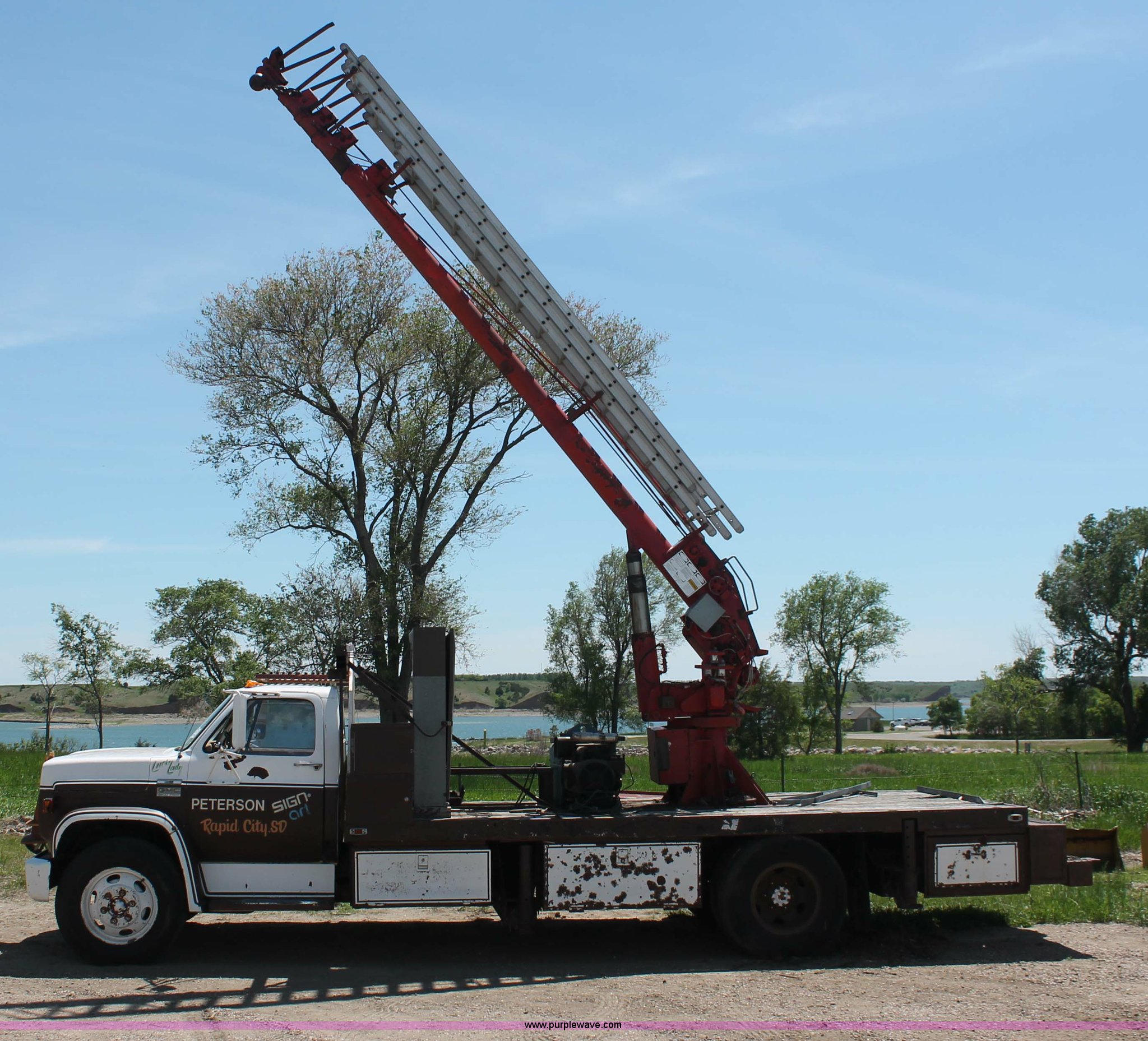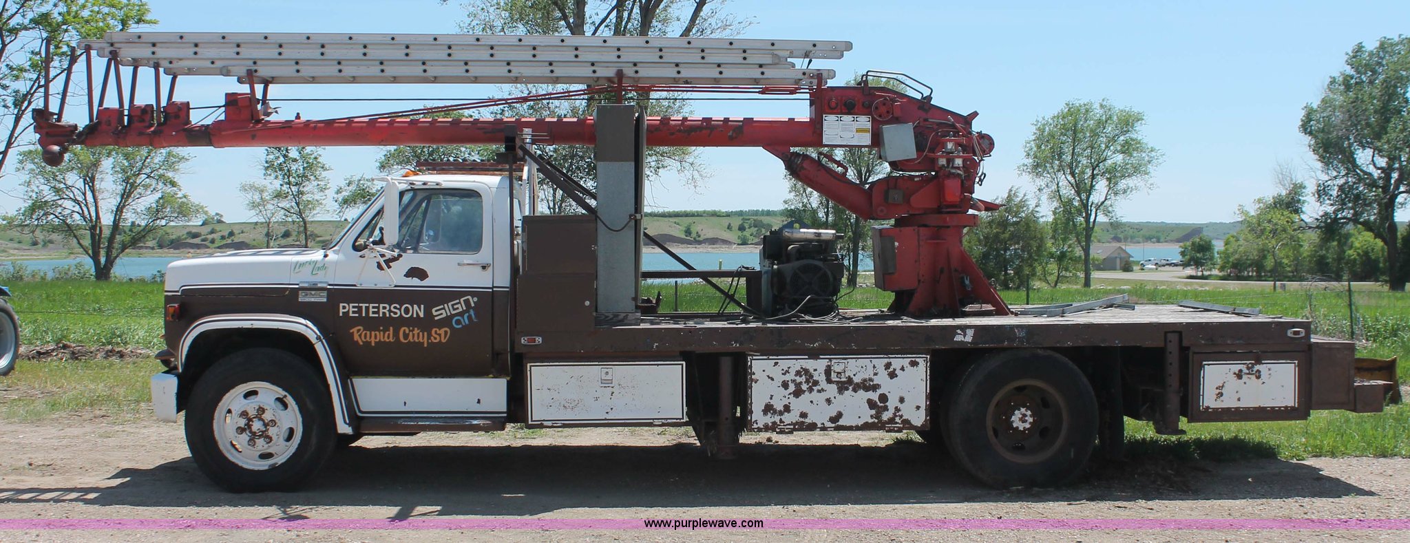1977 GMC Sierra 6500 flatbed ladder/boom truck has sold in Pierre, South Dakota for $1100. Item H3087 sold on July 17th, 2013.