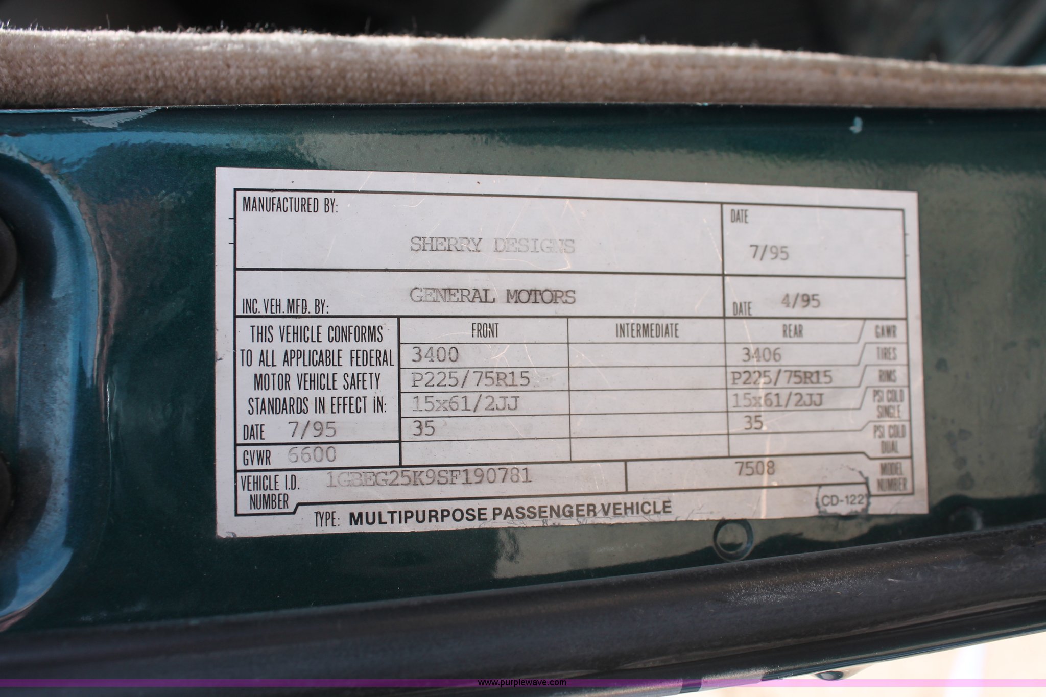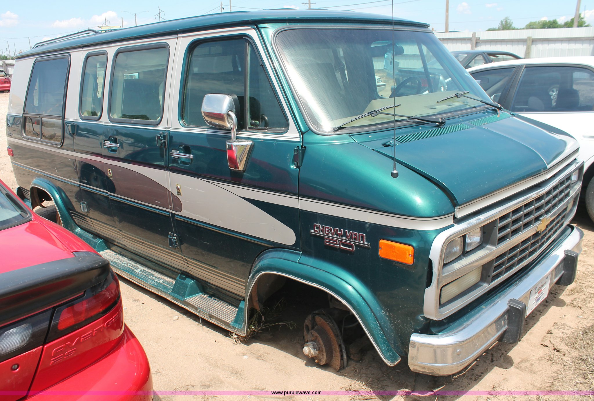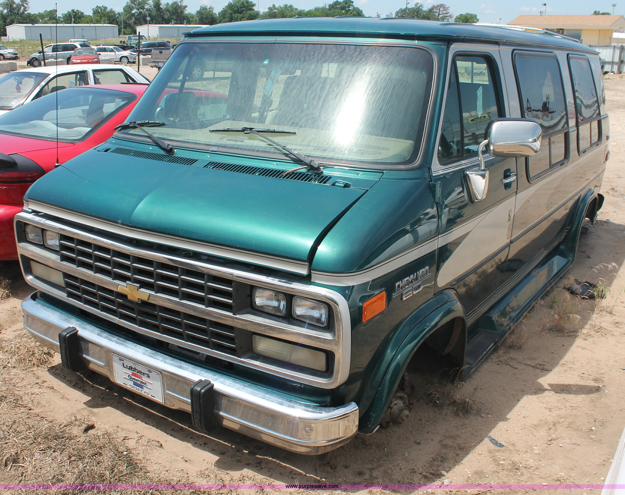1995 Chevrolet G20 Sport van. 149,506 miles on odometer, 5.7L V8 OHV 16V gas engine, Automatic transmission, AM/FM/cassette, Receiver hitch, Trailer wiring, No tires or wheels, Case# 13C500809. Vehicle is abandoned. No additional information is available. Vehicle does not have keys unless notated otherwise in the item listing.. View City Of Wichita Terms for title acquisition and item removal requirements.. 1GBEG25K9SF190781. Shipping quotes available. Arrow Wrecker Service. 531 E MacArthur. Wichita, KS 67216