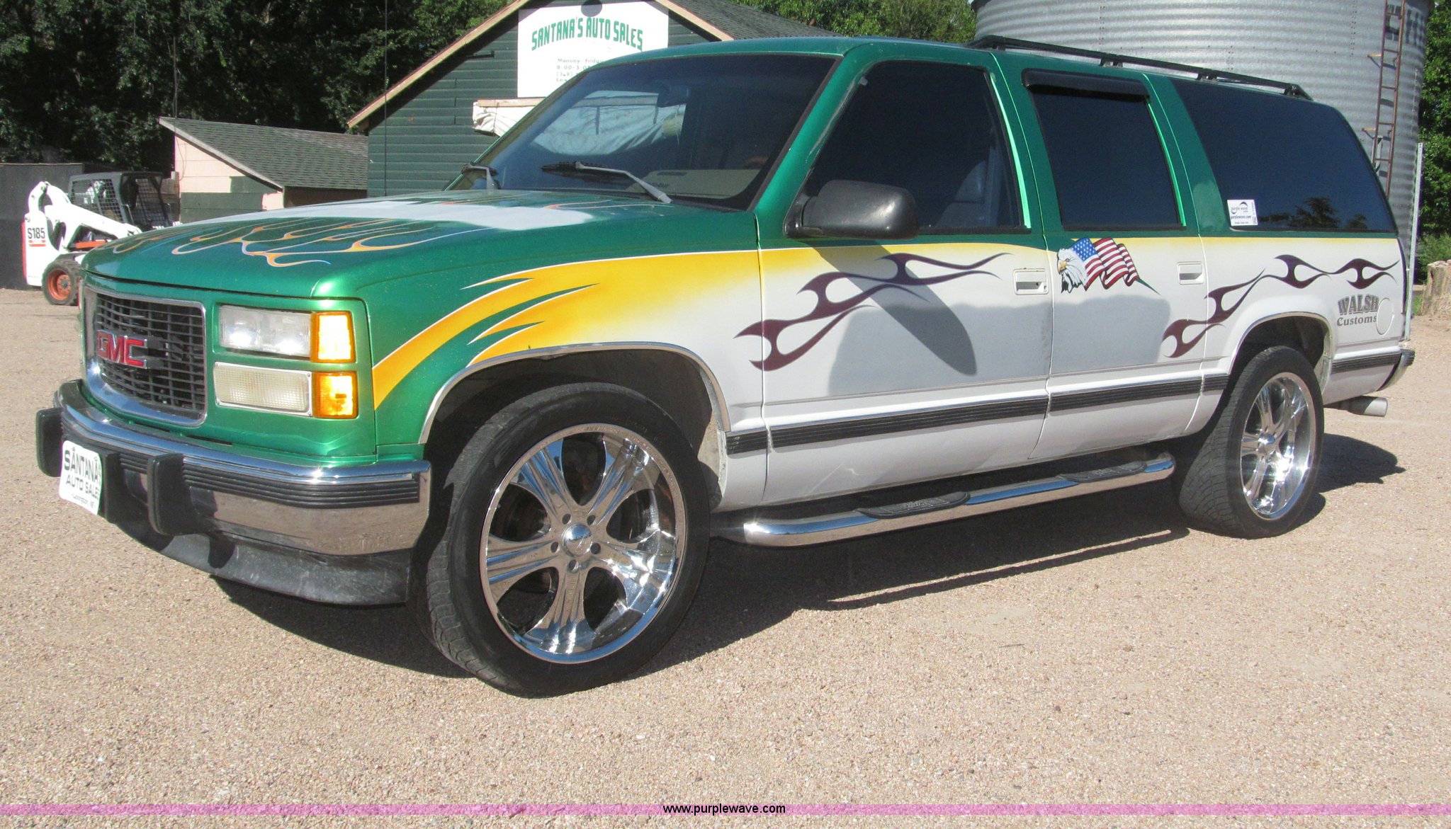 1993 Chevrolet Suburban SUV. 212,427 miles on odometer, 5.7L V8 OHV 16V gas engine, Automatic transmission, AC and heat, Tilt, Soundstorm SDVD-100 AM/FM/CD/MP3/DVD Remote, Power windows, locks, and seats, Vinyl interior, Dual exhaust, Custom paint, Heavy duty alternator High electric output, Westin nerf bars, Luggage rack, Window rain guards One missing, Backup camera, Grant GT 13.5" steering wheel, (2) ceiling mounted 7" TFT monitors, ESN AM/FM/CD Not hooked up, Directional lighting, Rear passenger AC controls, Nitro NT40 Extreme Force 285/45R22 tires, Interior/exterior cosmetic damage, Windshield cracked. 1GNEC16KXPJ402891. View equipment video. Shipping quotes available. Santana Motors. 43260 Road 750. Lexington, NE 68850