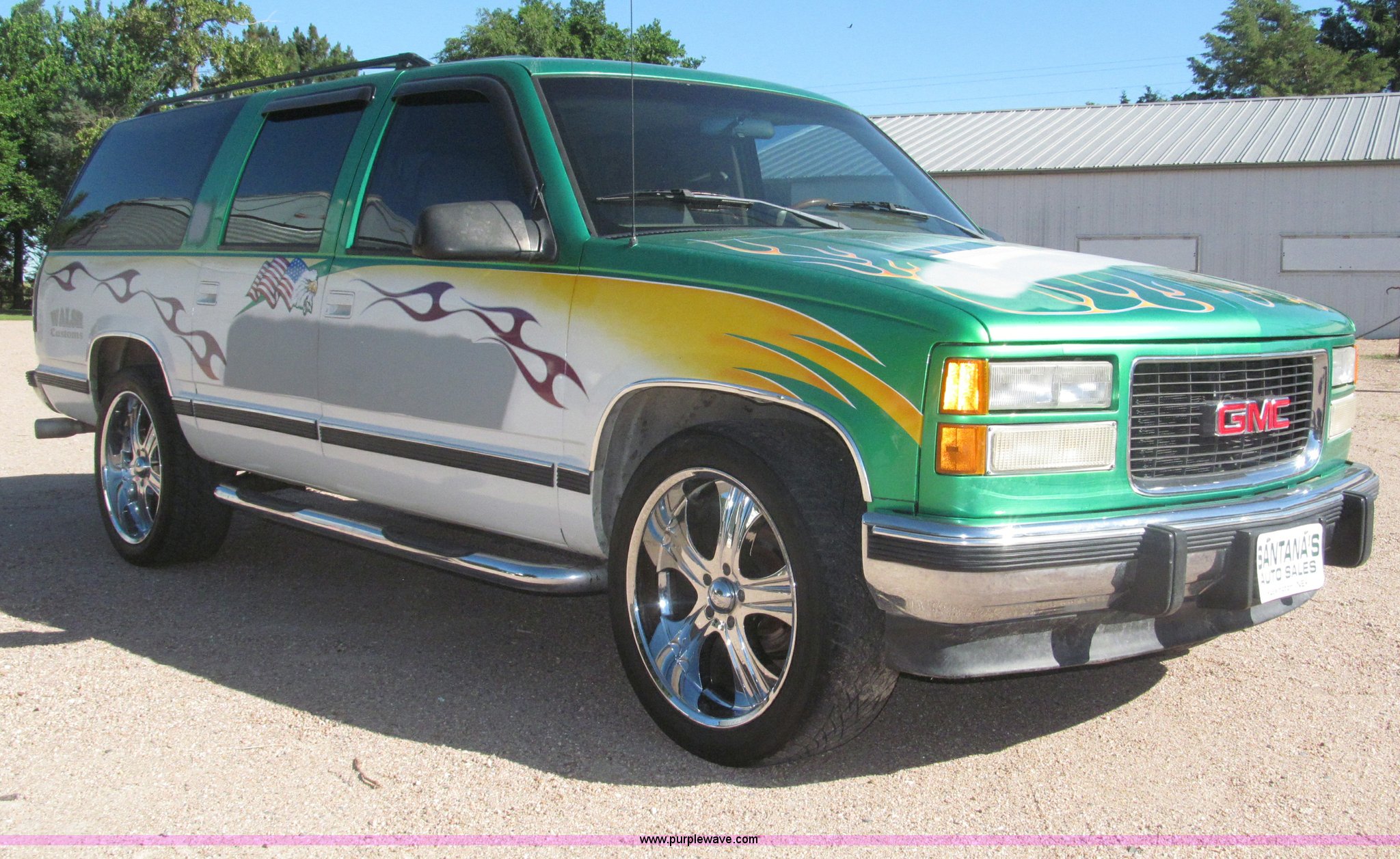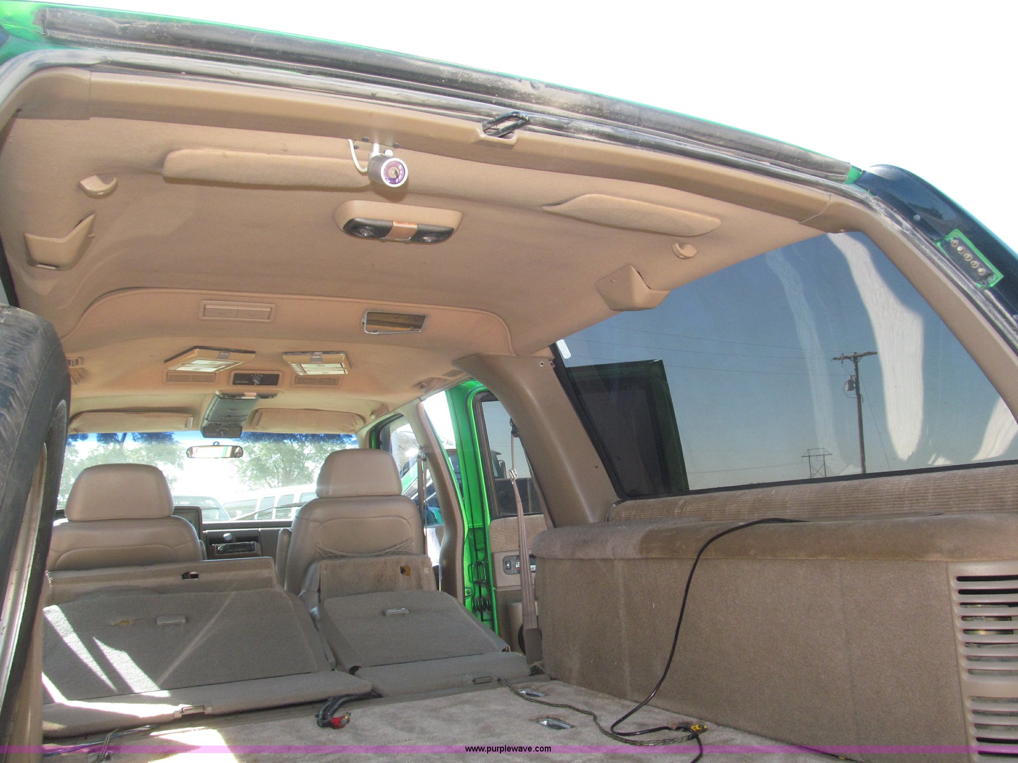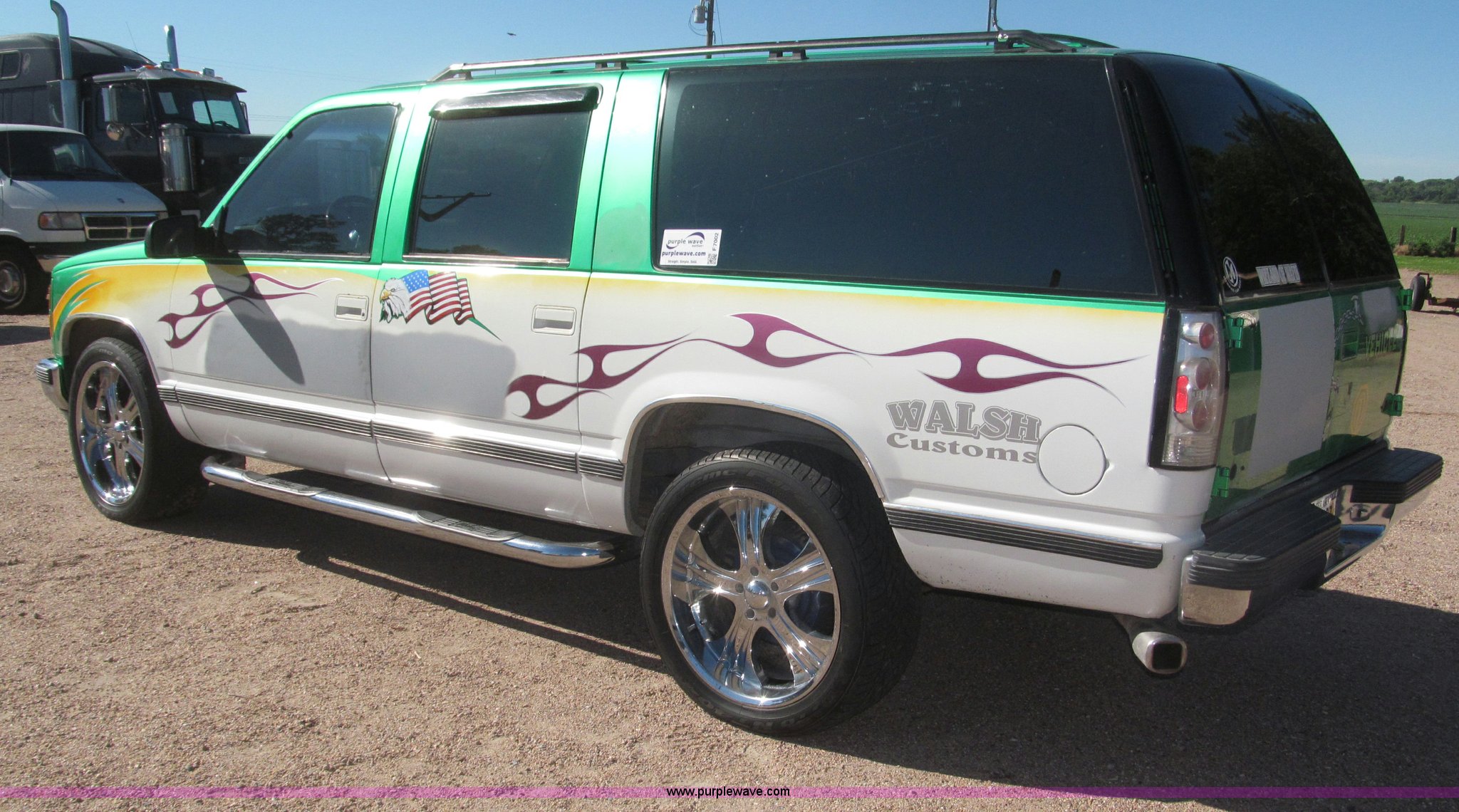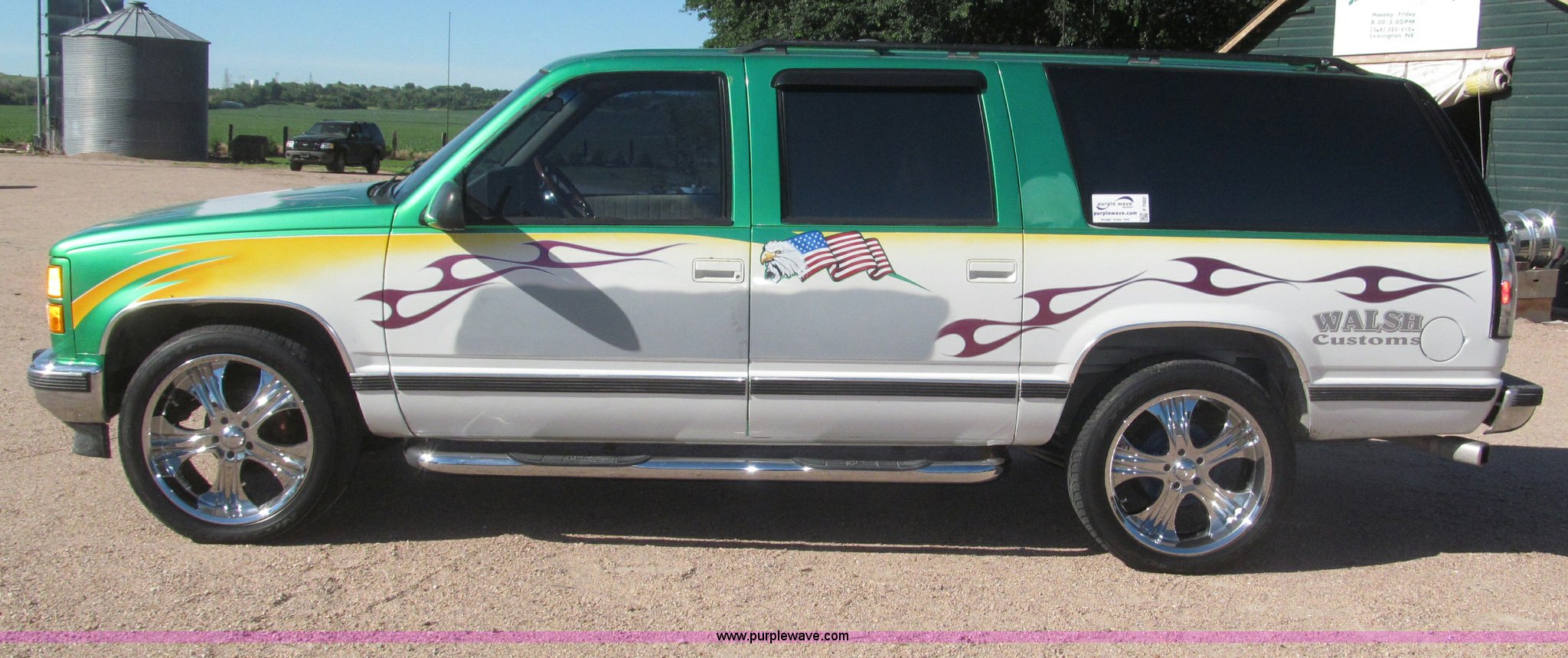 Purple Wave is selling a used Passenger Vehicle in Nebraska. This item is a 1993 Chevrolet Suburban SUV with the following: 212,427 miles on odometer, 5.7L V8 OHV 16V gas engine, Automatic transmission, AC and heat, Tilt, Soundstorm SDVD-100 AM/FM/CD/MP3/DVD, Remote, Power windows, locks, and seats, Vinyl interior, Dual exhaust, Custom paint, Heavy duty alternator, High electric output, Westin nerf bars, Luggage rack, Window rain guards, One missing, Backup camera, Grant GT 13.5" steering wheel, (2) ceiling mounted 7" TFT monitors, ESN AM/FM/CD, Not hooked up, Directional lighting, Rear passenger AC controls, Nitro NT40 Extreme Force 285/45R22 tires, Interior/exterior cosmetic damage, Windshield cracked