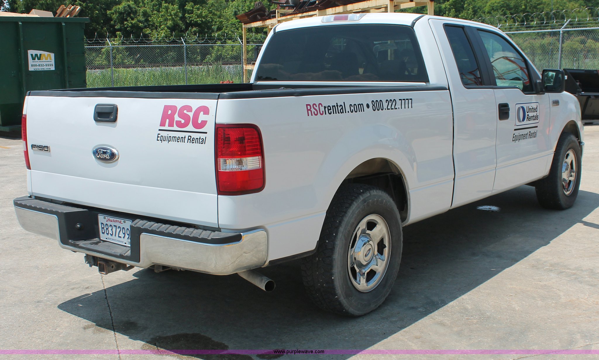 2007 Ford F150 XLT SuperCab pickup truck. 121,781 miles on odometer, 4.6L V8 SOHC 16V gas engine, Automatic transmission Reverse is inoperable, AC and heat, Tilt, Cruise, AM/FM/CD, Power windows, locks, mirrors, and seats, Cloth interior, Adjustable foot pedals, Tekonsha brake controller, Spray-in bed liner, Receiver hitch, Trailer wiring, Bridgestone Dueller A/T P265/70R17 tires, EIN 712719RA. Title distribution may be delayed up to 30 days from verification of funds. 1FTRX12W57KD47266. Shipping quotes available. United Rentals - St. Rose. 10385 Airline Highway. St. Rose, LA 70087