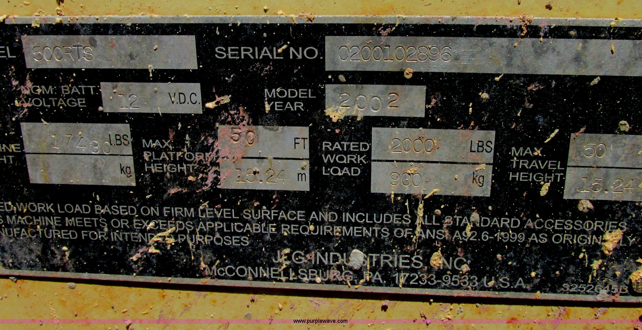 JLG 500RTS rough terrain scissor lift. 2,534 hours on meter, Deutz three cylinder air cooled diesel engine, Four wheel drive, 4' powered extension deck, 50' lift, 14' deck with guard rails, 2,000 lbs maximum capacity, Basket remote controls, 120V electric power to platform, Lift and lower ground controls, Lift cylinder leaks, Recently replaced hydraulic cover, Serial 0200102896, Unit# 10286. Shipping quotes available. Volvo Rents. 2241 North Belcrest. Springfield, MO 65803