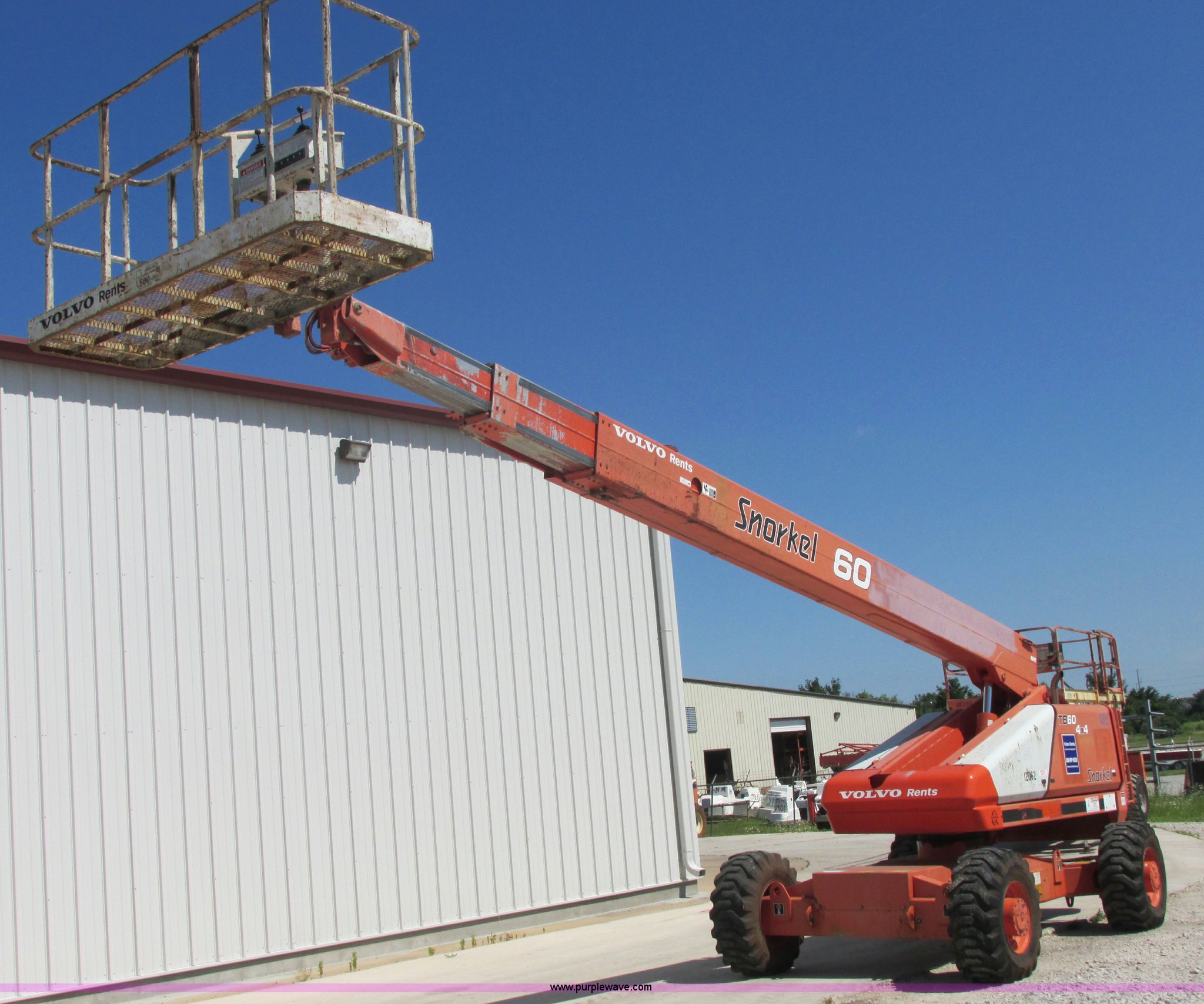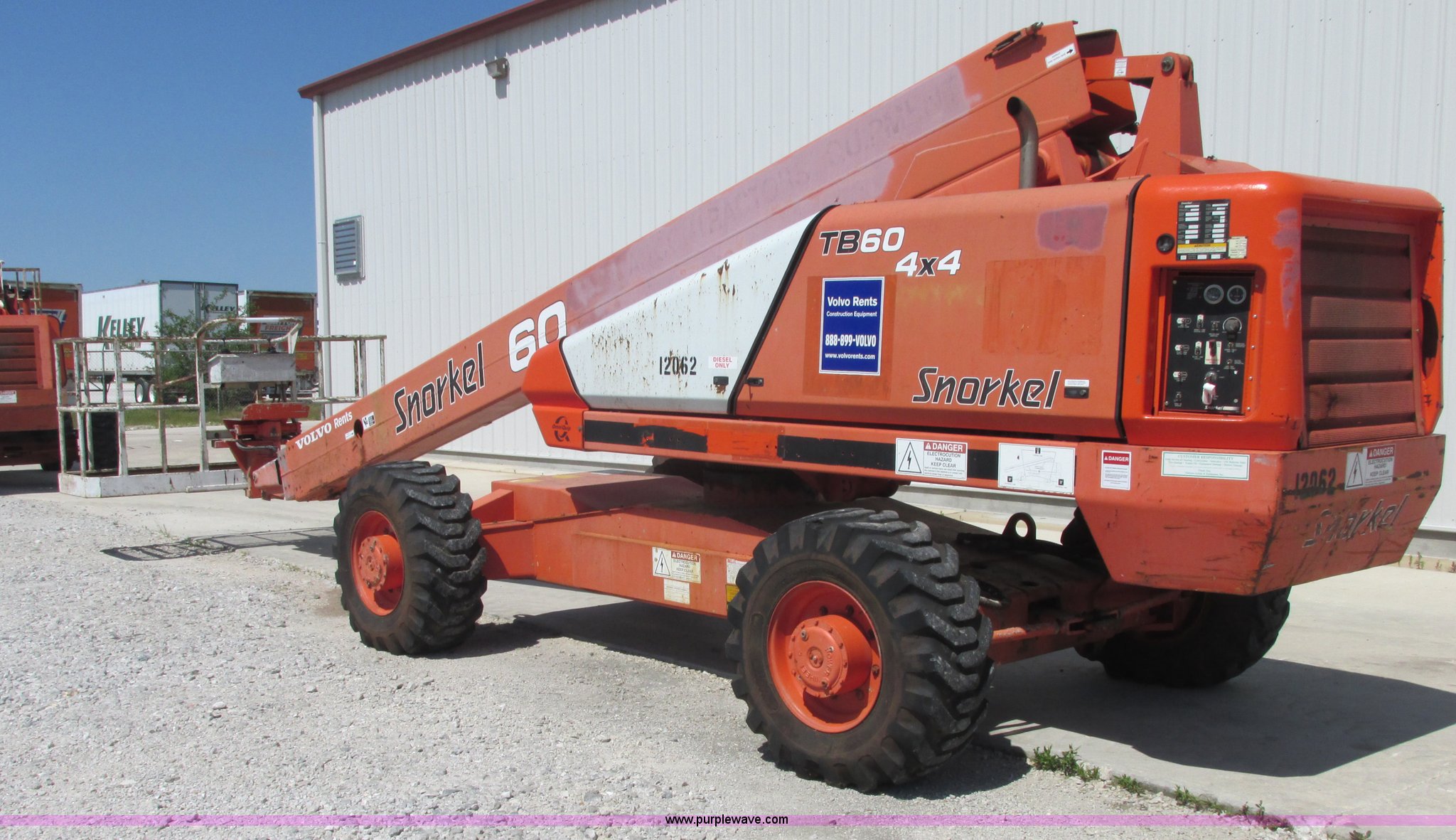 Take a look at this used Snorkel TB60 60' boom lift being sold on July 25th, 2013 in the SOLD! July 25 Construction Equipment Auction made by Snorkel. Take a look at all of the item information below or take a look at similar auctions for Aerial Lifts.