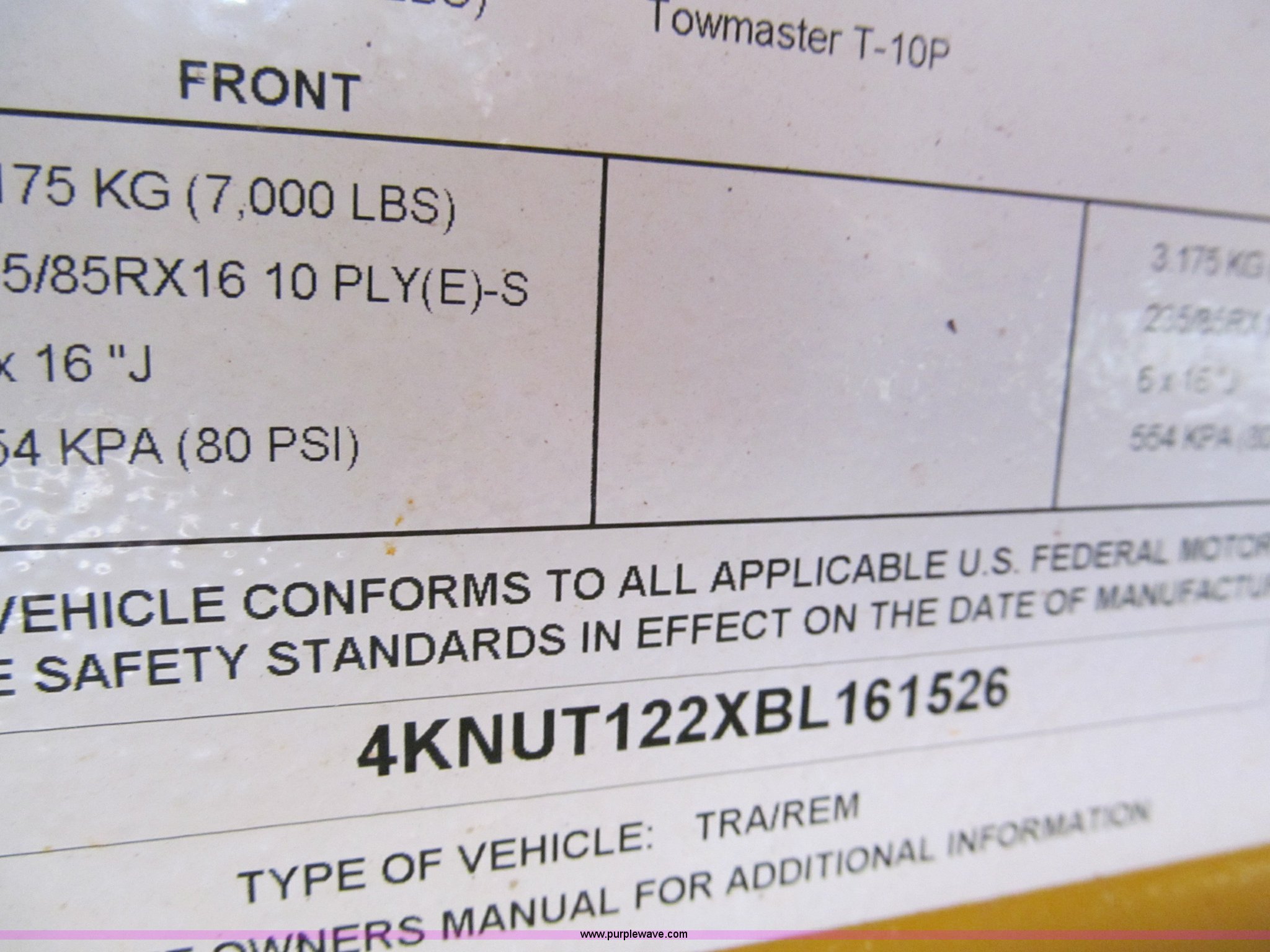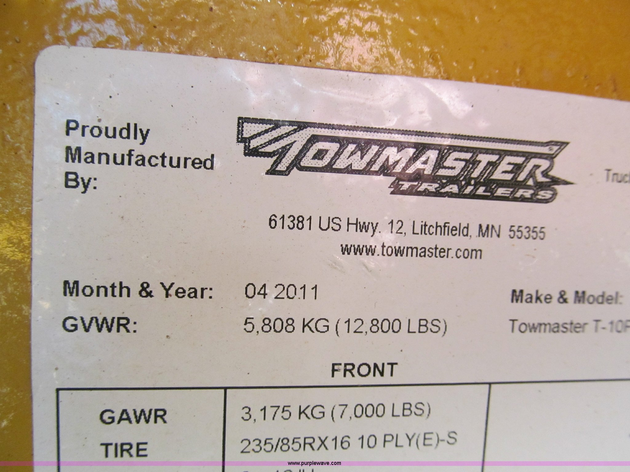 Purple Wave is selling a used Equip. Trailer in Missouri. This item is a 2011 Towmaster T10P skid steer trailer with the following: 12'L x 77"W, Steel construction, (2) 46"L x 16"W fold down ramps, D-ring tie downs, 10,000 lbs load capacity, Tongue jack, Tongue chain storage, Surge brake, 2 5/16" ball hitch, Height adjustment, Eight hole steel wheels, 235/85R16 tires, 10 ply, GVWR 12,800 lbs, GAWR 7,000 lbs, New and unused, Unit# 1045036