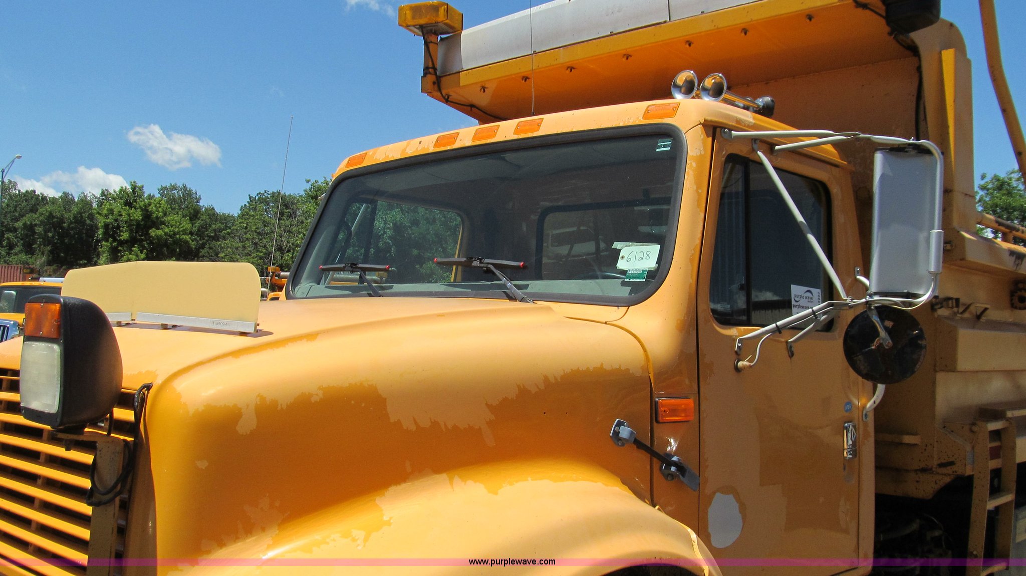 Purple Wave is selling a used Construction Dump Truck in Missouri. This item is a 1999 International 4900 dump truck with the following: 160,984 miles on odometer, 8,939 hours on meter, International DT530 8.7L L6 diesel engine, Eaton 10 speed manual transmission, Twin screw, Power divider lock, Heat, Cruise, AM/FM, Air suspension seat, Heated mirrors, 16' dump bed, Electric rollover tarp, Air end gate, Bed mounted amber warning light, Equipped for front mount snow plow, Plow lights, In-cab controls, 75 gallon fuel tank, Air suspension, Air brakes, 206" wheelbase, 11R22.5 tires, GVWR 56,000 lbs, MoDOT ID 6128