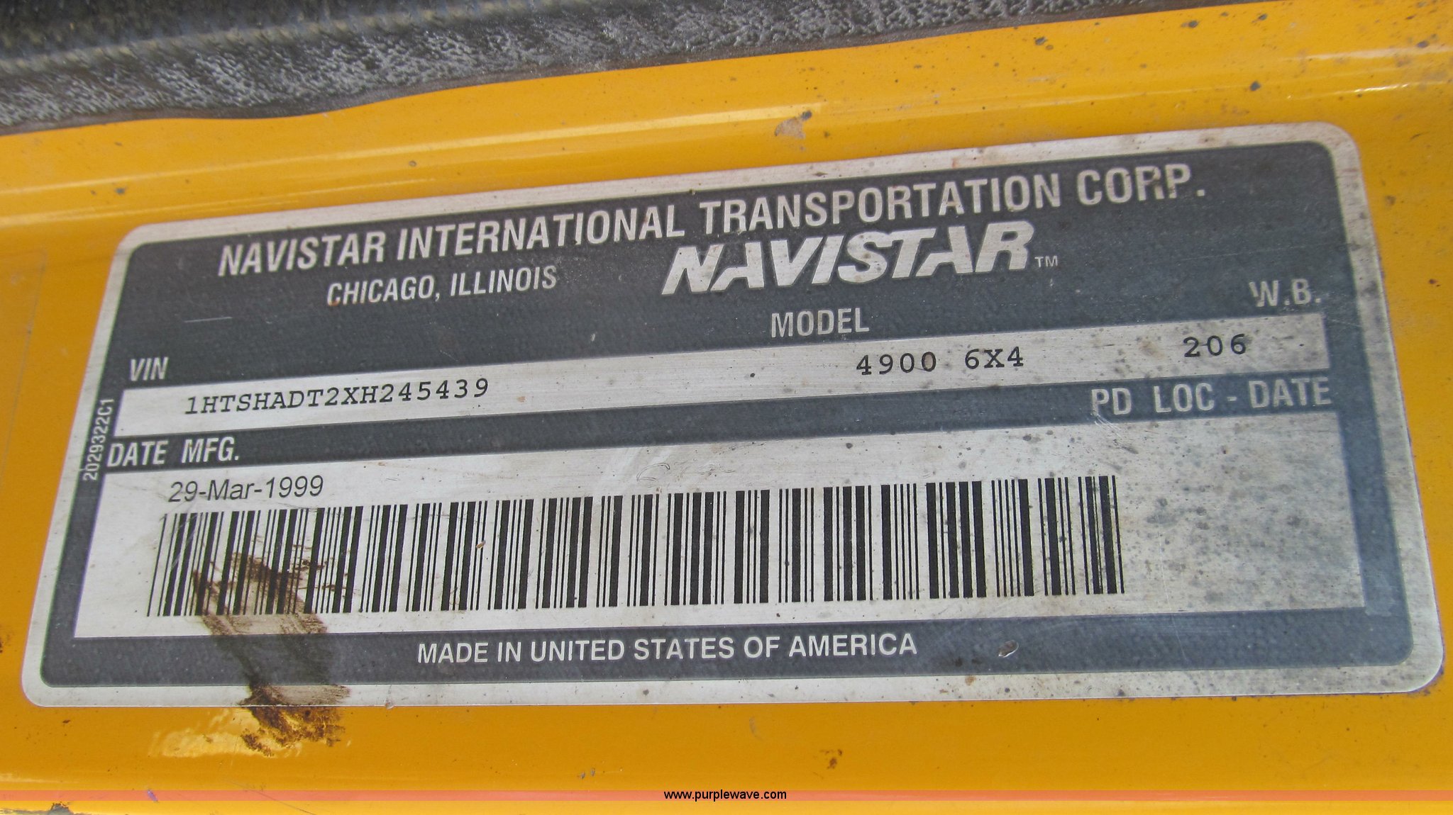 1999 International 4900 dump truck. 160,984 miles on odometer, 8,939 hours on meter, International DT530 8.7L L6 diesel engine, Eaton 10 speed manual transmission, Twin screw, Power divider lock, Heat, Cruise, AM/FM, Air suspension seat, Heated mirrors, 16' dump bed Electric rollover tarp, Air end gate, Bed mounted amber warning light, Equipped for front mount snow plow Plow lights, In-cab controls, 75 gallon fuel tank, Air suspension, Air brakes, 206" wheelbase, 11R22.5 tires, GVWR 56,000 lbs, MoDOT ID 6128. 1HTSHADT2XH245439. Shipping quotes available. Missouri Department of Transportation (MODOT). 1511 Missouri Blvd. Jefferson City, MO 65102