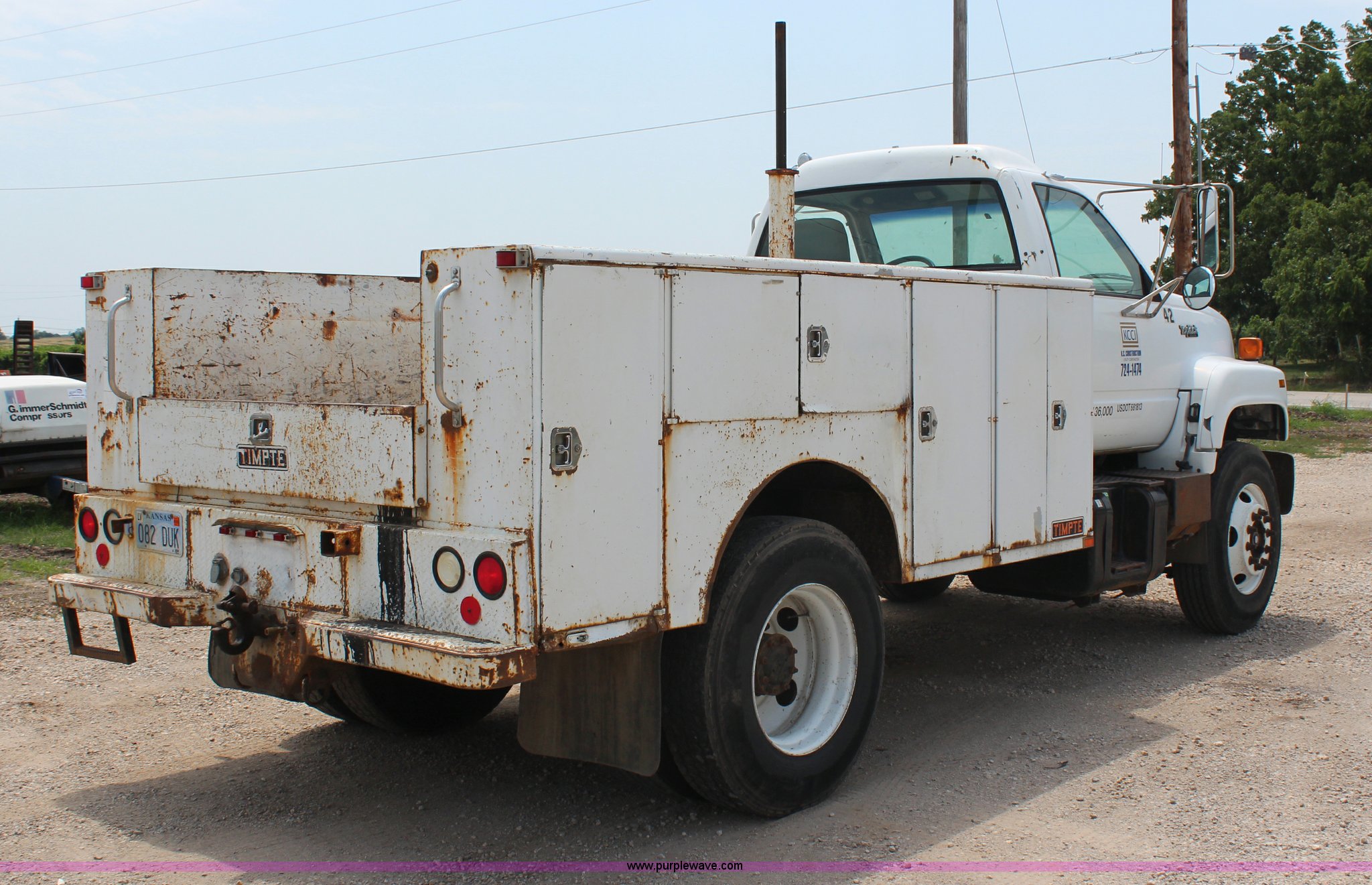 Purple Wave is selling a used Service Truck in Kansas. This item is a 1996 GMC TopKick service truck with the following: 129,886 miles on odometer, Caterpillar 3116 6.6L L6 diesel engine, Six speed manual transmission, AC and heat, Air suspension seat, Electronic brake controller, 11' utility bed, Pintle hitch, Dual 50 gallon fuel tanks, Spring suspension, Air brakes, 11R22.5 tires, GVWR 33,000 lbs
