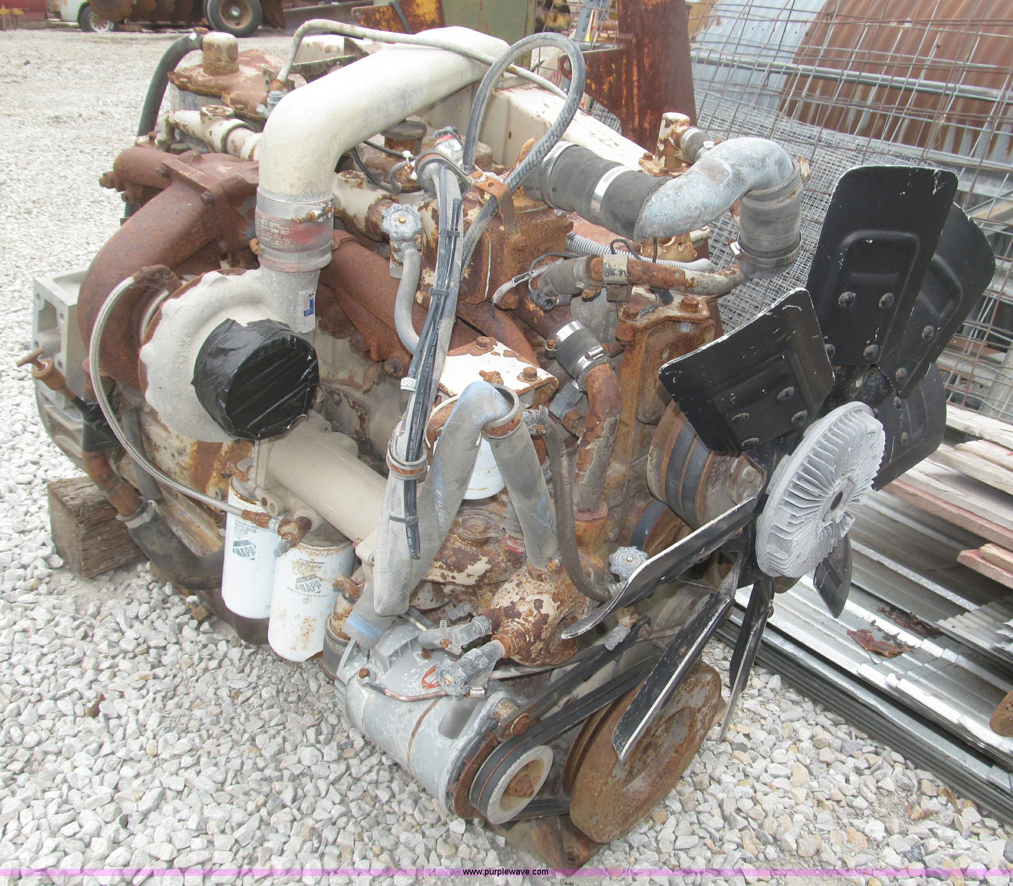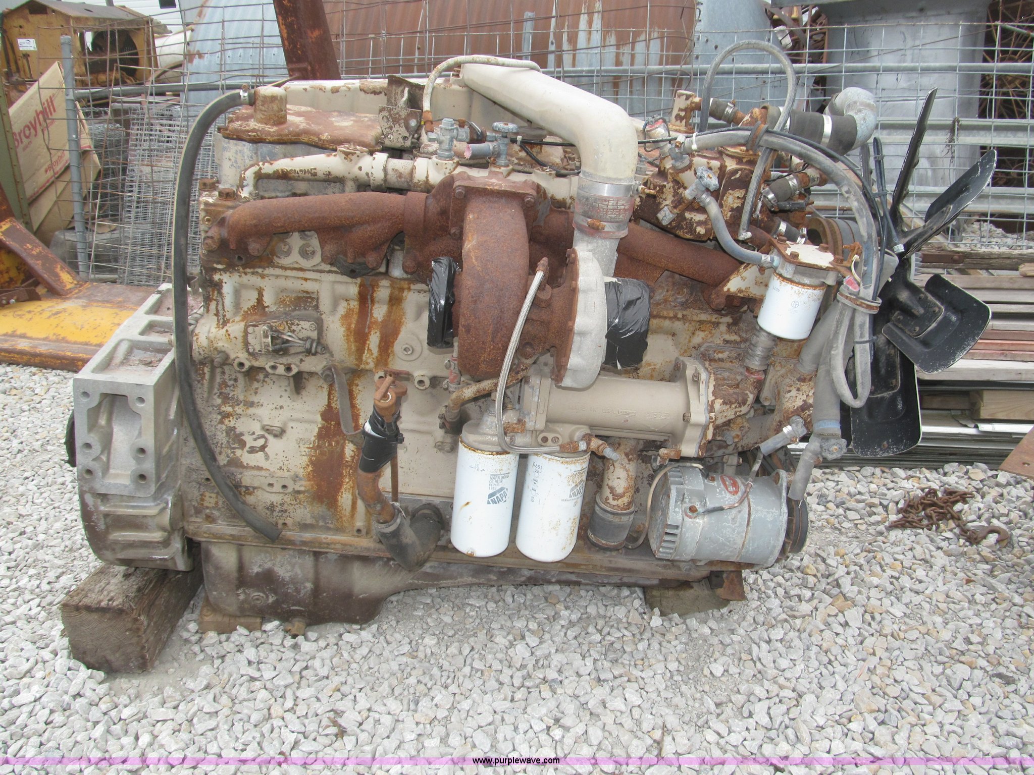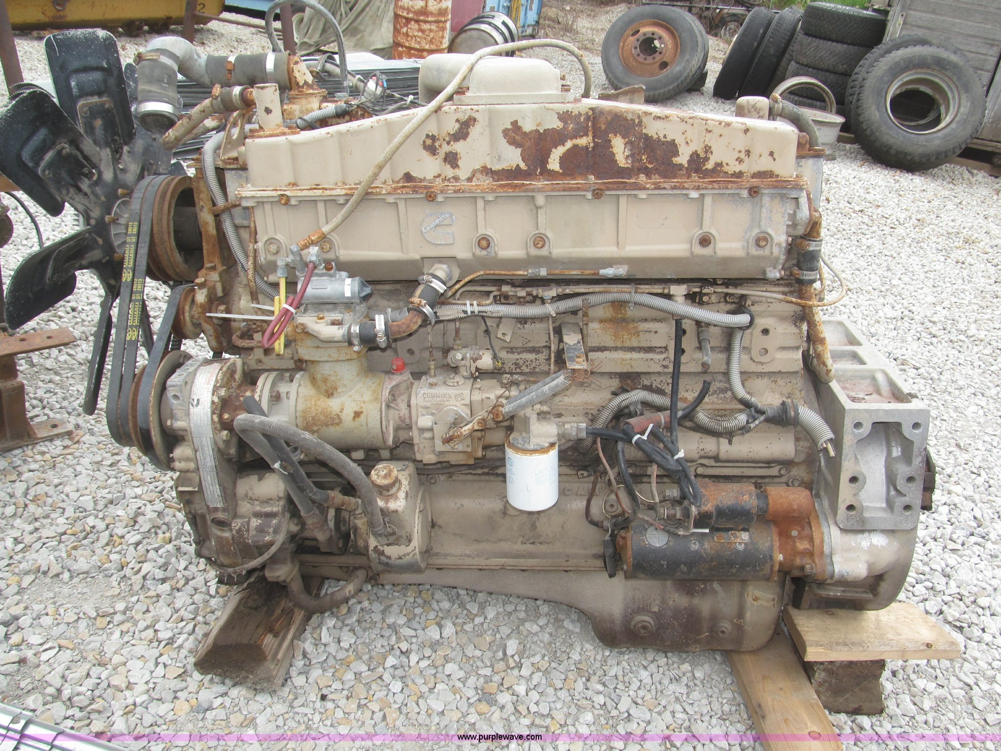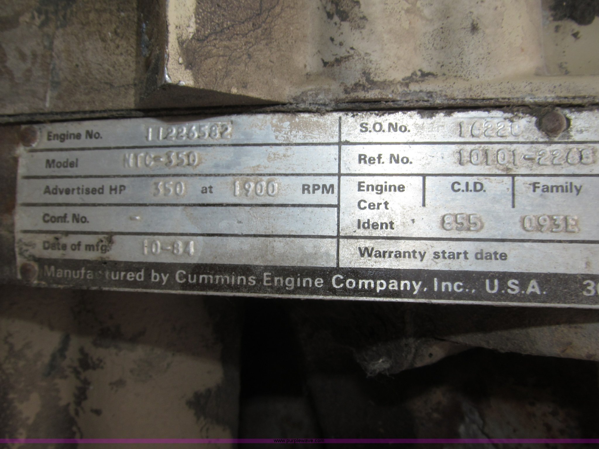 Purple Wave is selling a used Automotive Parts or Acces. in Iowa. This item is a Cummins 855 six cylinder turbo diesel engine with the following: Model NTC350, 855 CID, 350 HP at 1,900 rpm rating, Removed from 1984 White semi truck, Operational when removed from service three years ago, Serial 11226582