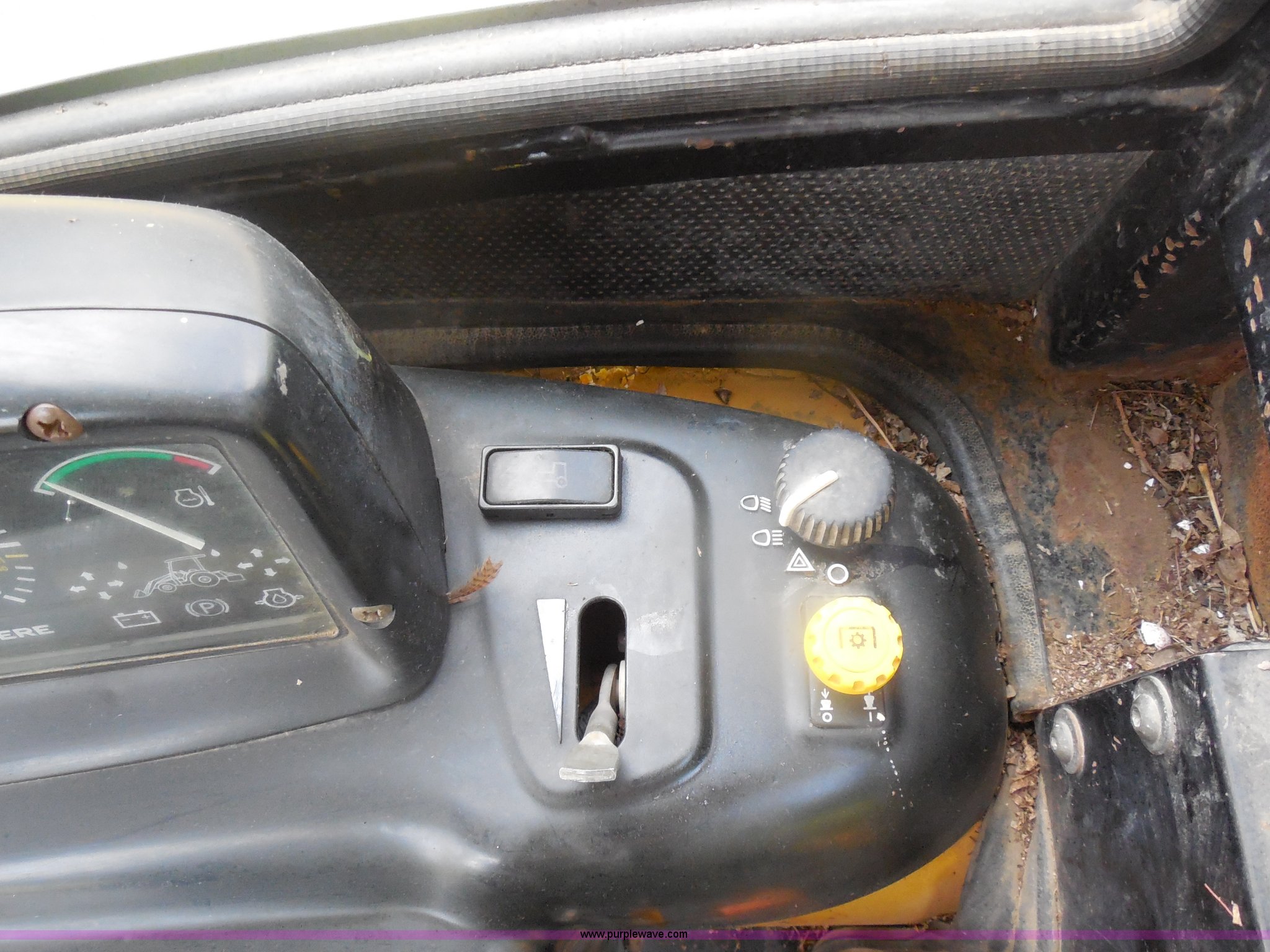 Purple Wave is selling a used Tractor Loader Backhoe in Oklahoma. This item is a 2005 John Deere 110 TLB tractor loader backhoe with the following: 5,722 hours on meter, Four cylinder diesel engine, 45 HP, Hydrostatic transmission, Infinite three range transmission, Transmission inoperable, Spring suspension seat, Enclosed cab, Rear windows open, Loader model T00110A105532, 72"W bucket, Joystick loader controls, Worksite Pro KV20713 12" three tooth backhoe bucket, 121" maximum backhoe digging depth, 45" dump angle, 71.5" wheelbase, 10-16.5 front tires, 17.5-24 rear tires, 7,280 lbs. base operating weight, Serial LV0110T410428