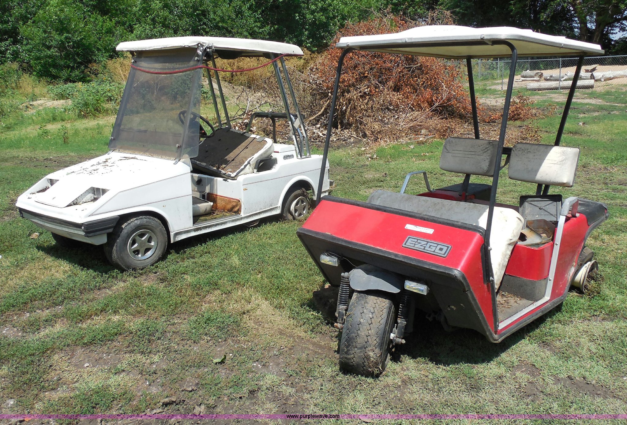 Purple Wave is selling a used Sporting Goods in Kansas. This item is a (2) golf carts with the following: EZ-GO electric cart, 18-8.50-8 tires, One tire missing, Non-operational, Western electric cart, 18-8.50-8 tires, Non-operational