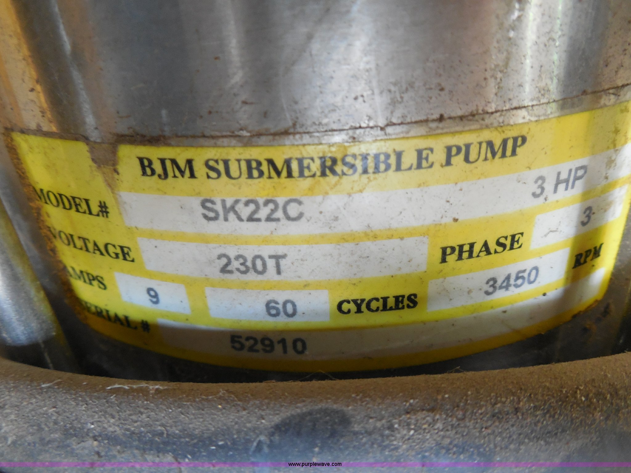 Purple Wave is selling a used Pump in Kansas. This item is a BJM submersible pump with the following: Model SC22C, 3 HP, 230V, Three phase, Serial 52910