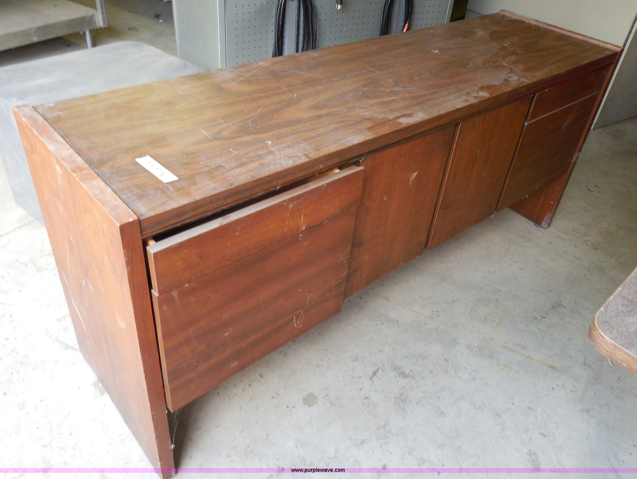 Purple Wave is selling a used Furniture in Kansas. This item is a Assorted wood furnishings with the following: Wood sewing cabinet table, Chrome leg work table, Double drop leaf table with extra center leaf, Wall mount wood cabinet, 36" round top pedestal table, 38" x 38" pedestal youth table, Computer desk, Painted book shelf, (2) roll around printer tables, Credenza, Plant table/end table, (2) shelves, 8'L x 4'D x 17"D, Roll around work table, Writing desk, Pine cabinet, Corner desk, Assorted desk parts