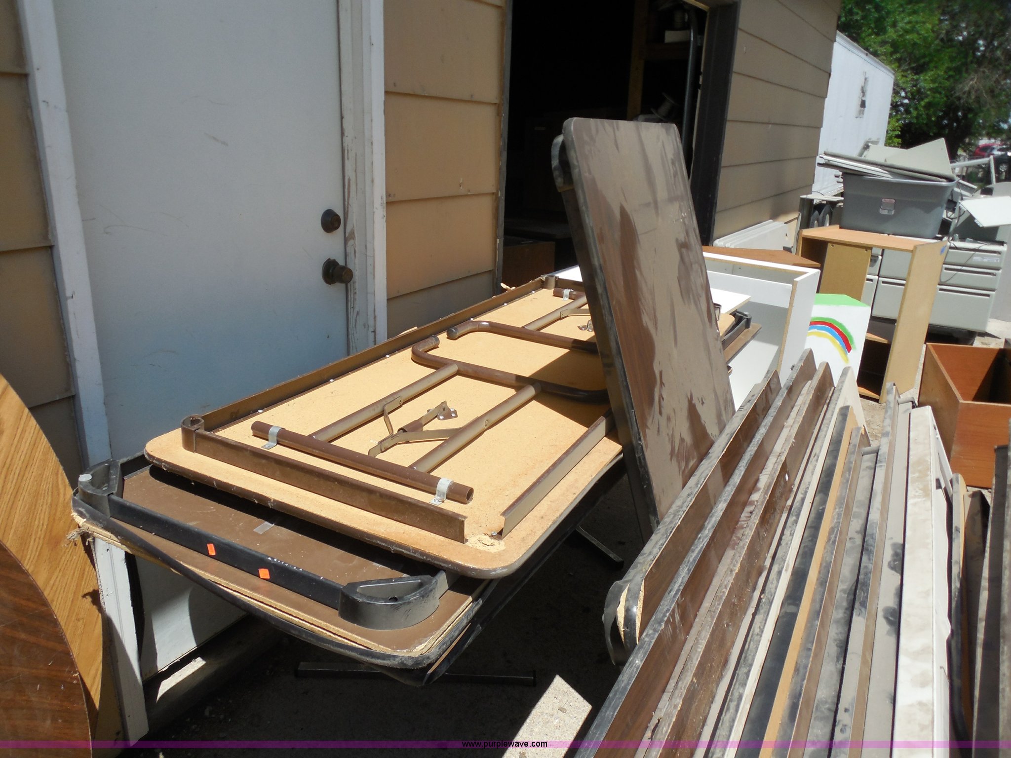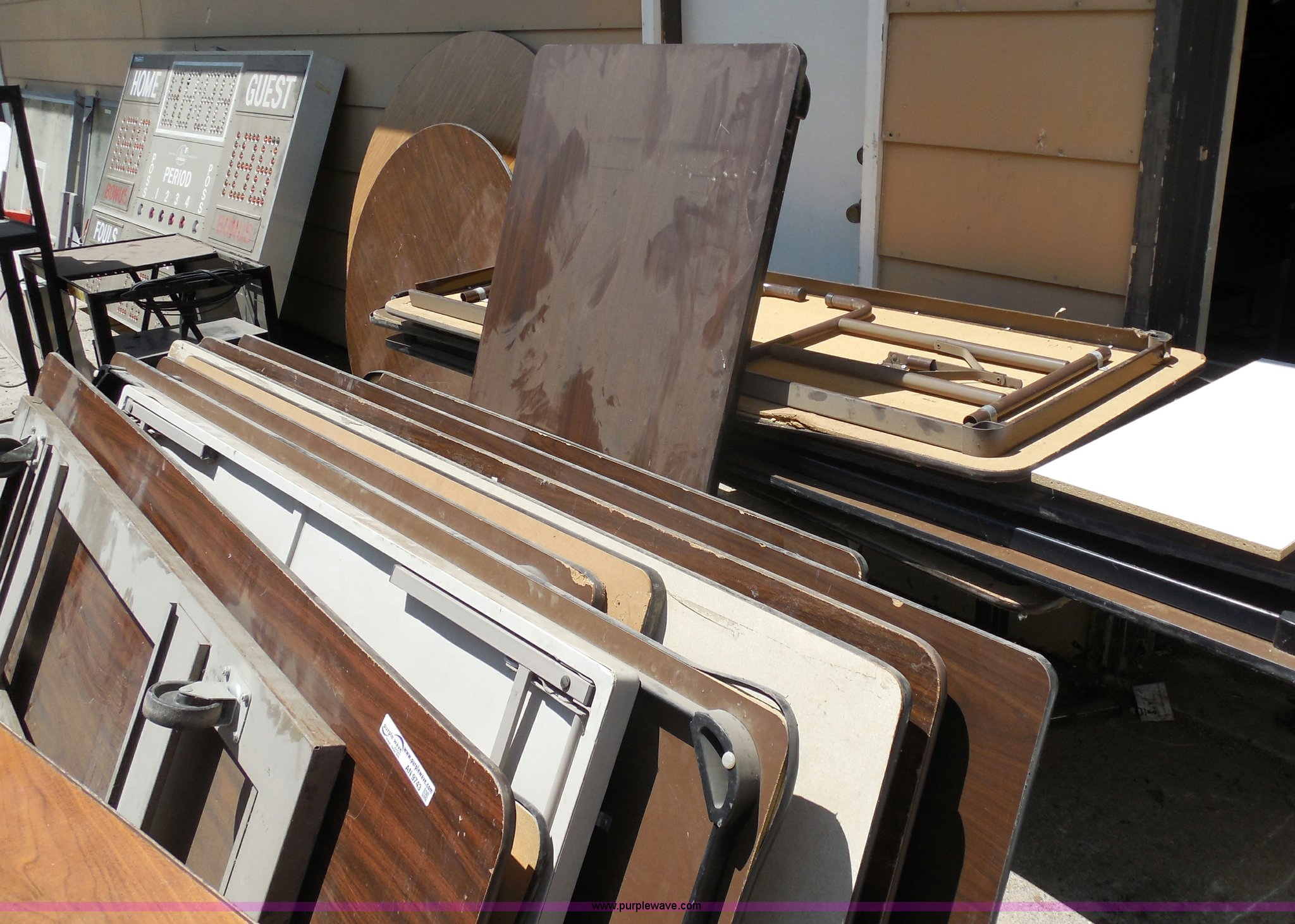 Purple Wave is selling a used Furniture in Kansas. This item is a Approximately 15 assorted folding tables and flatbed table cart with the following: Various lengths and conditions, (3) folding tables, New in box, (2) table top only, (2) assorted round top folding tables